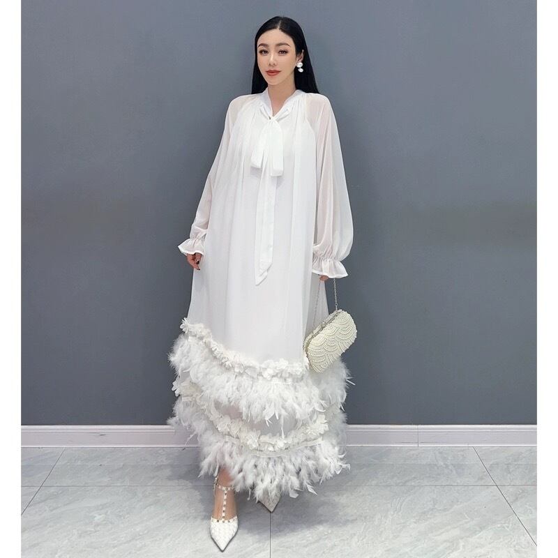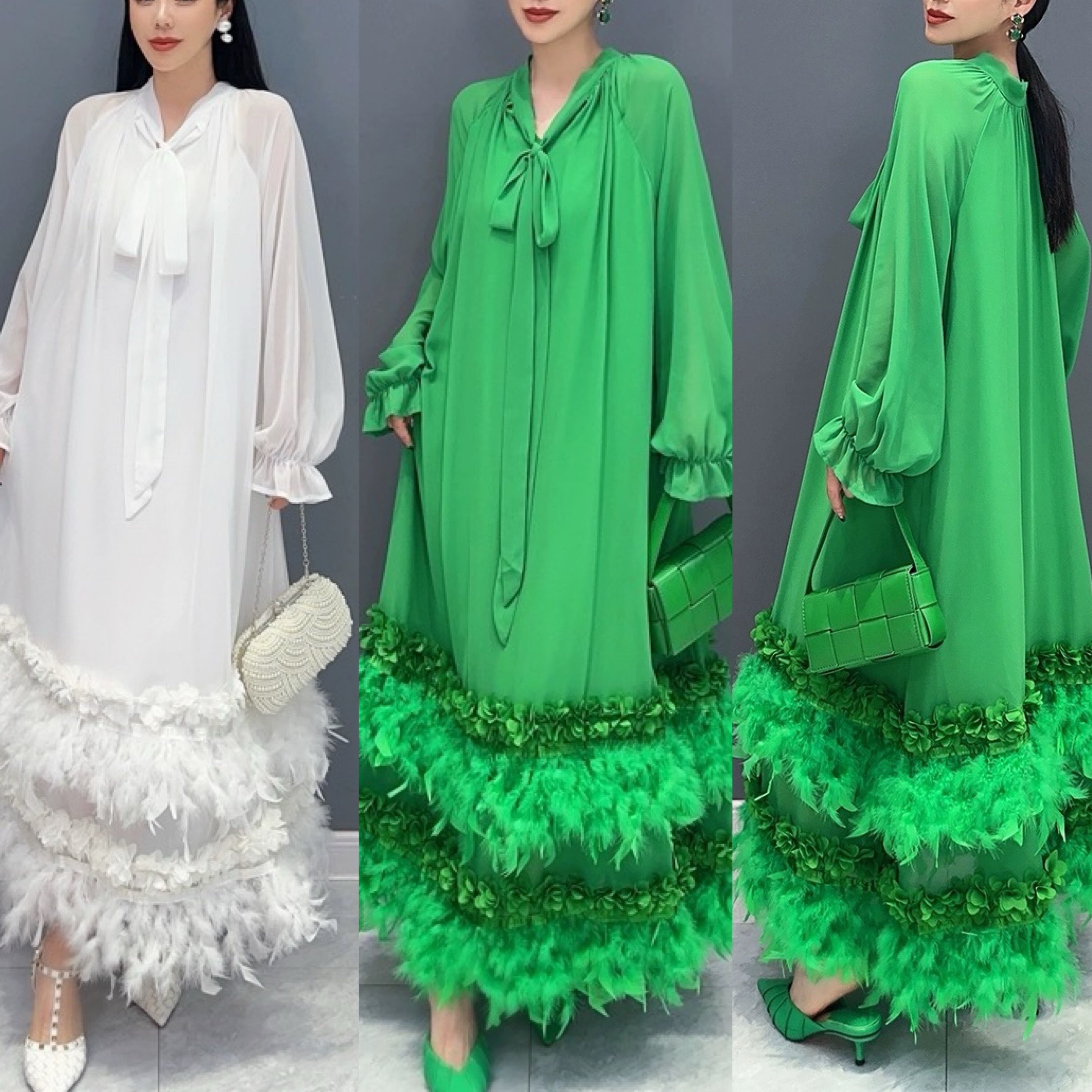 緑 白 マキシ ワンピース エレガント リボン