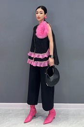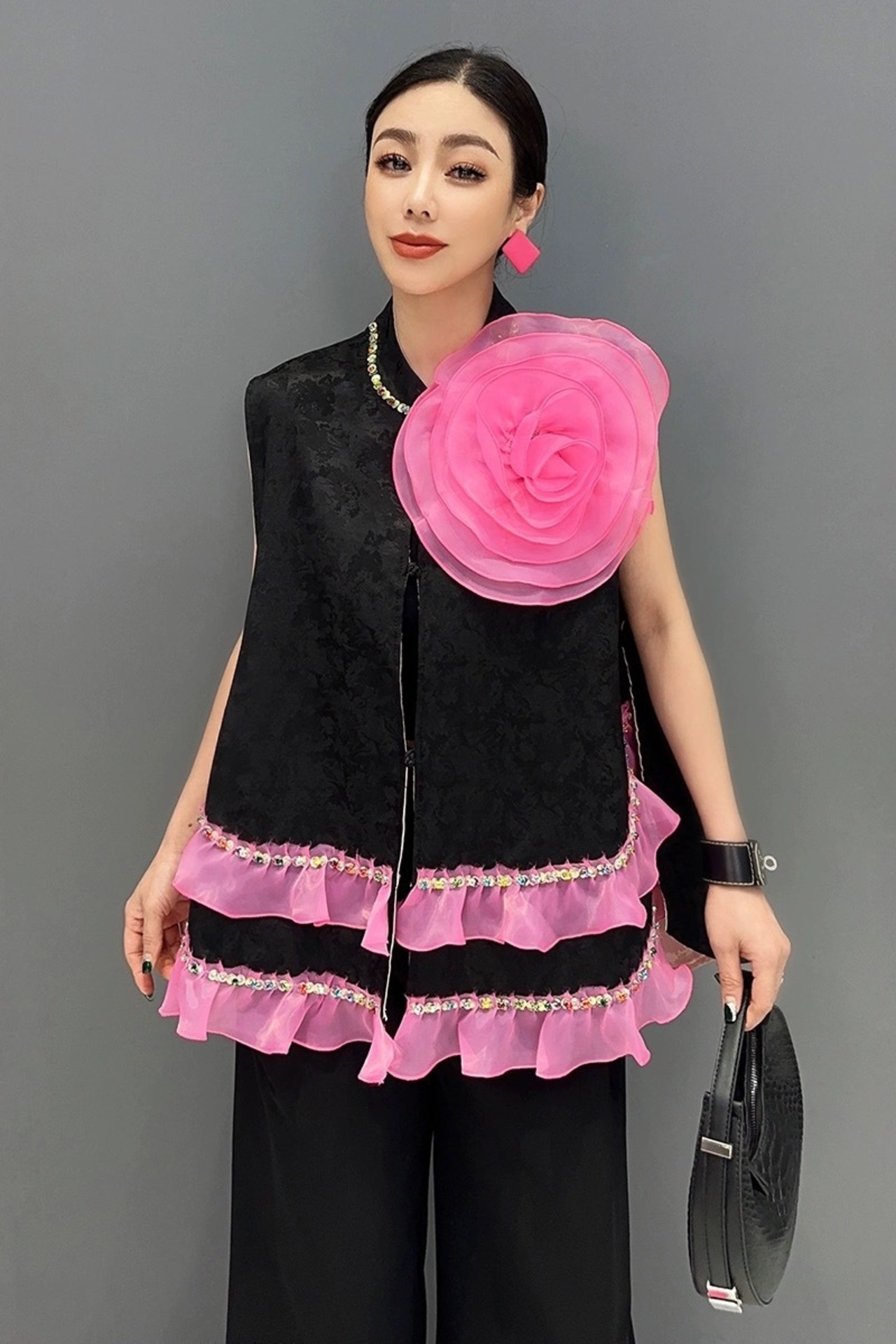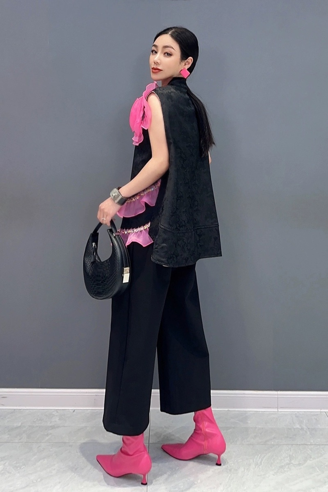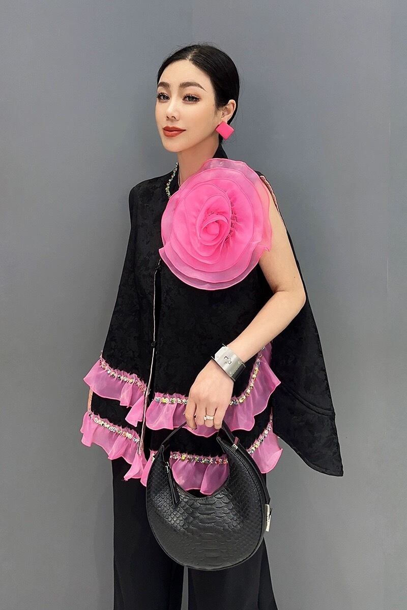 黒 ピンク カメリア チャイナ カーディガン ジャケット