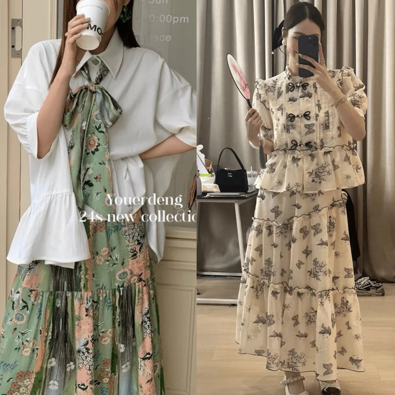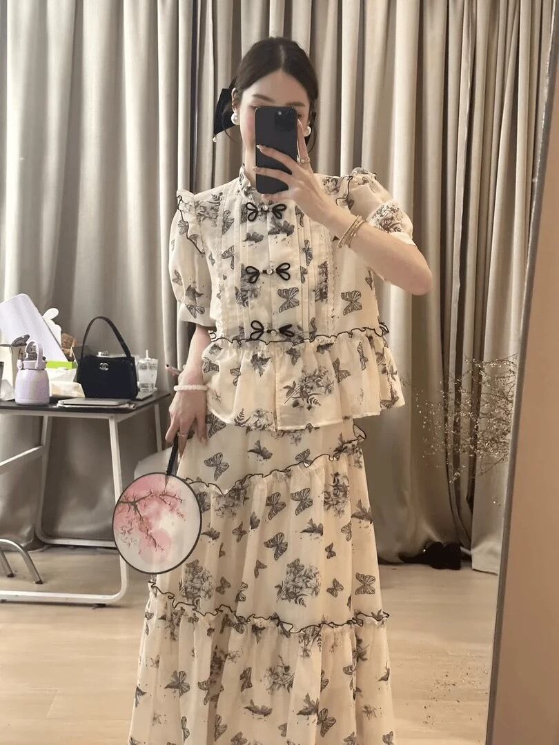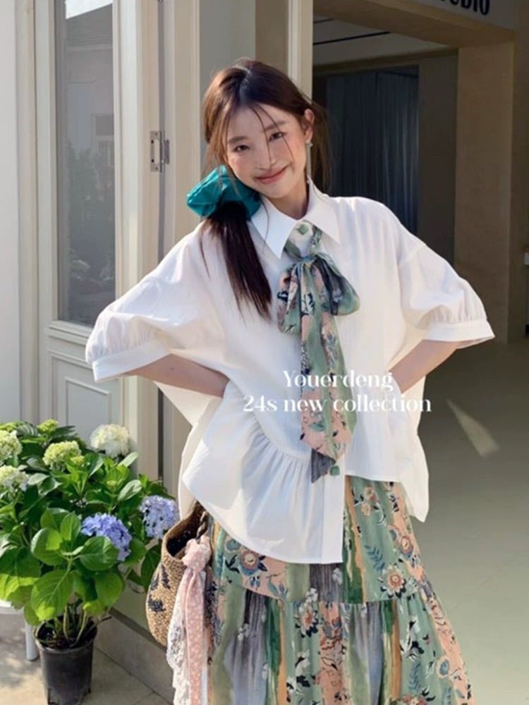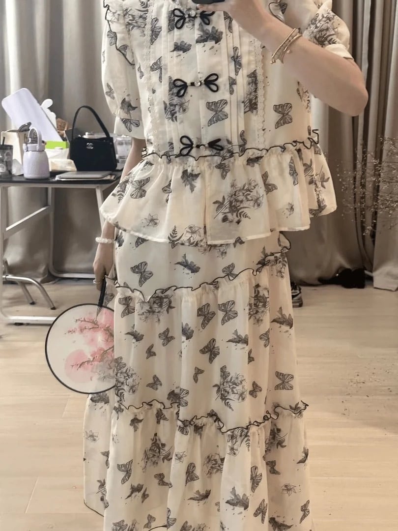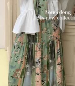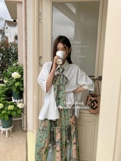 【セットアップ】ブラウス リボン 緑 ガーリー スカート チャイナ