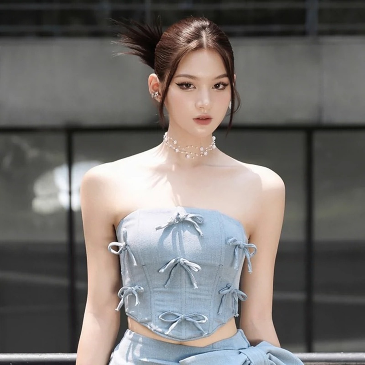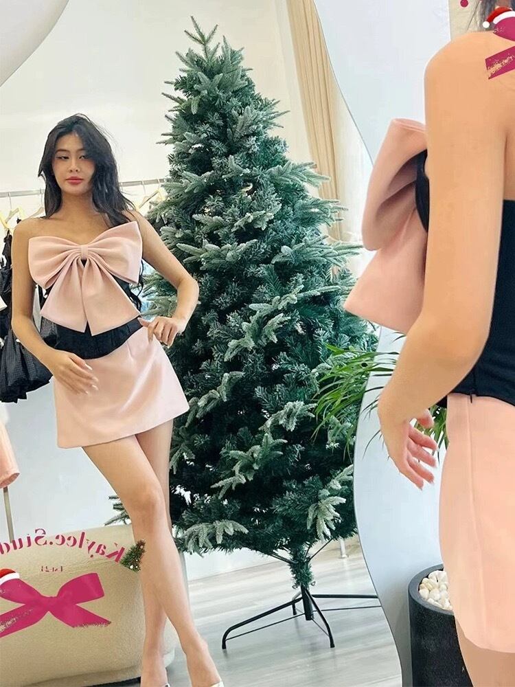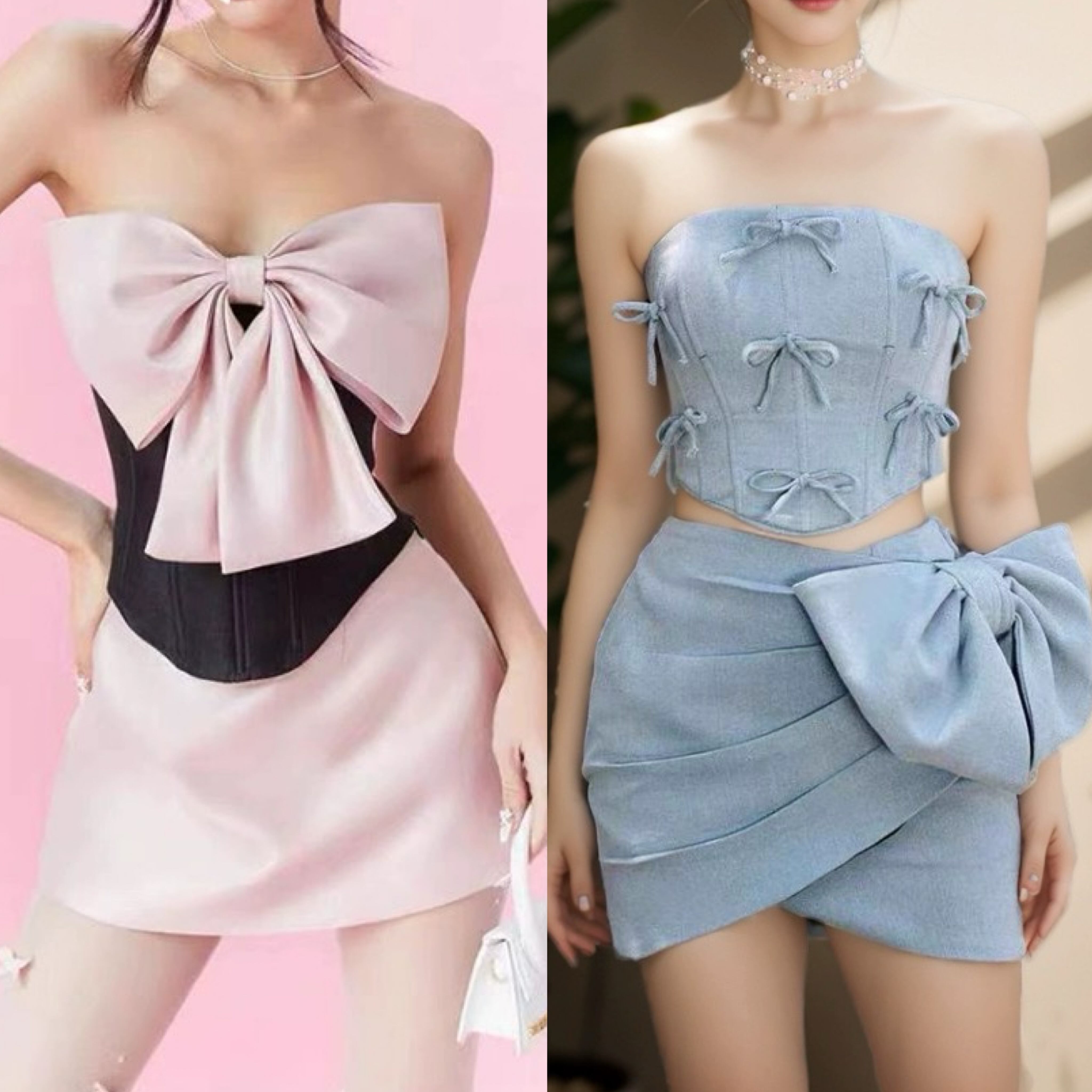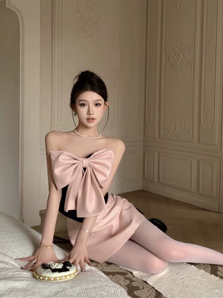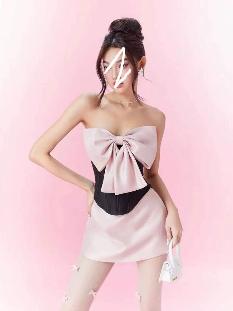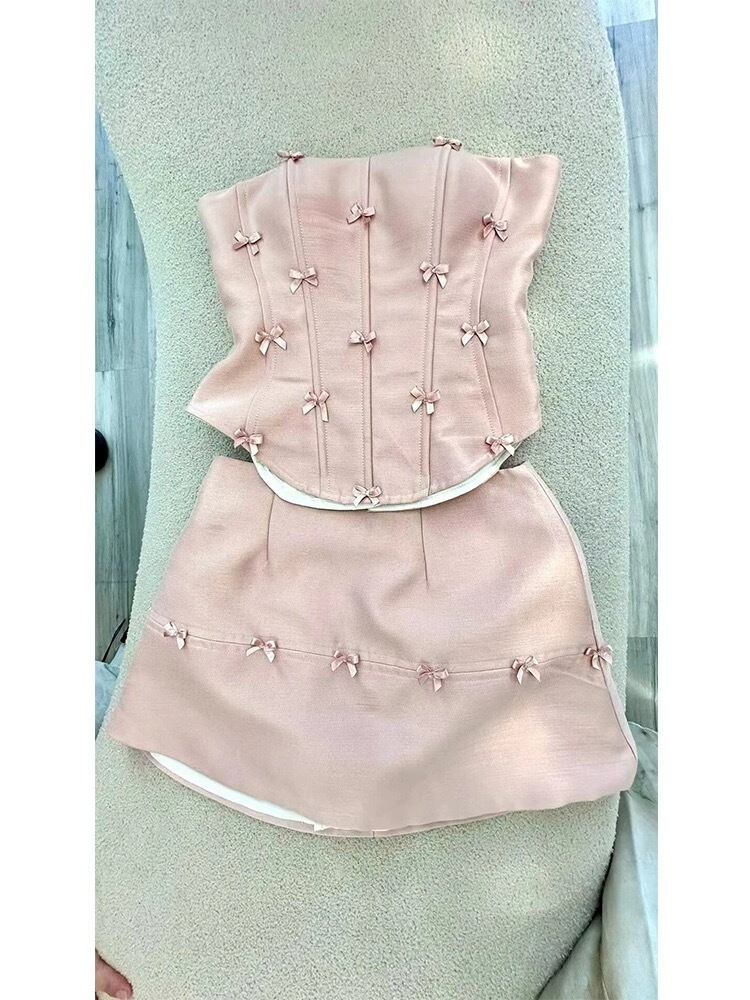 【セットアップ】リボン ピンク デニム ミニスカート ベアトップ