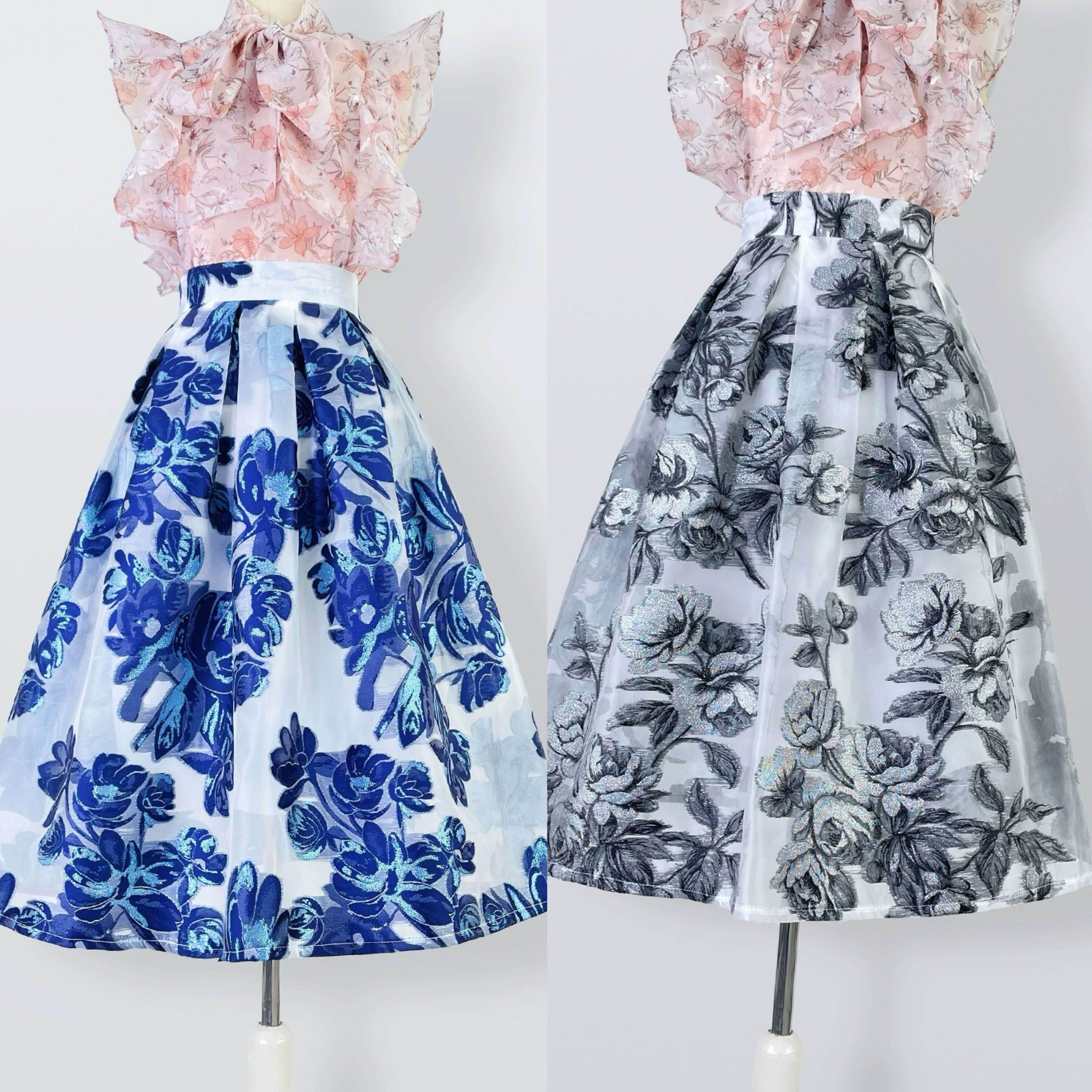 黒 グレー バラ 薔薇 フラワー 花柄 青 白 スカート