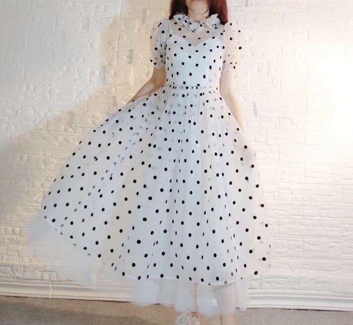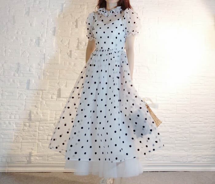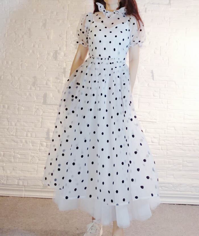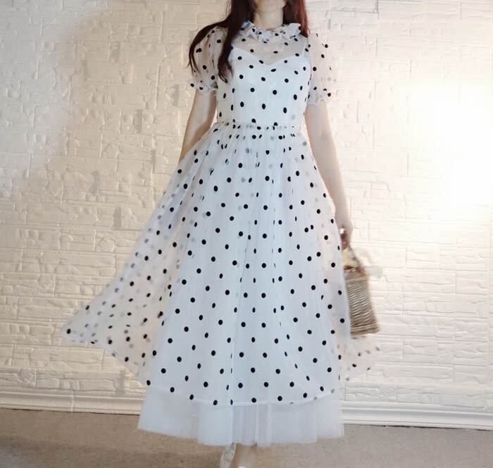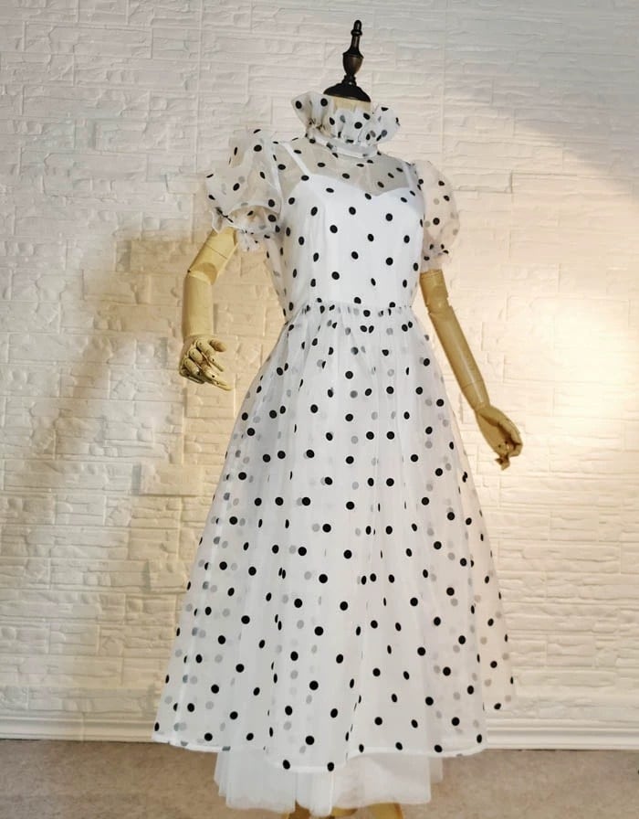水玉 ドット 白 黒 ハイネック ブラウス スカート