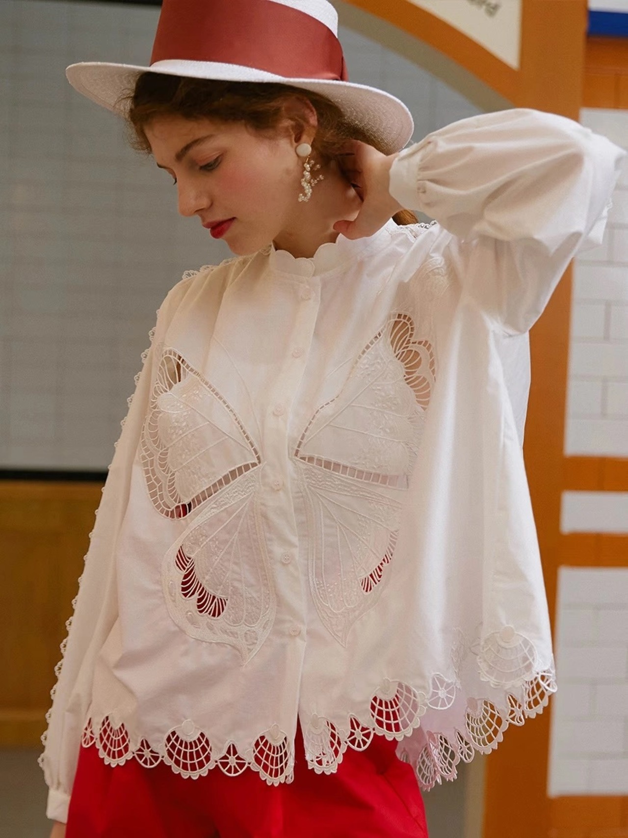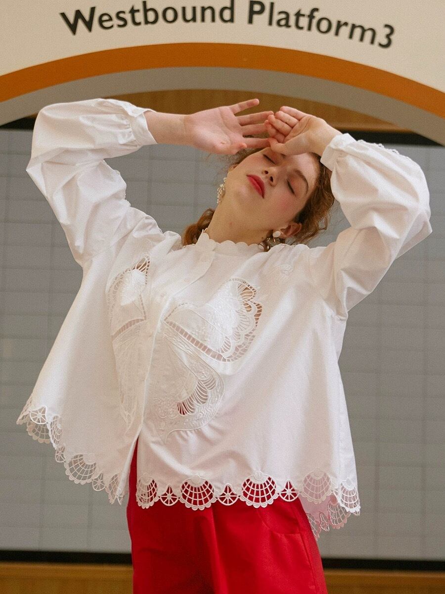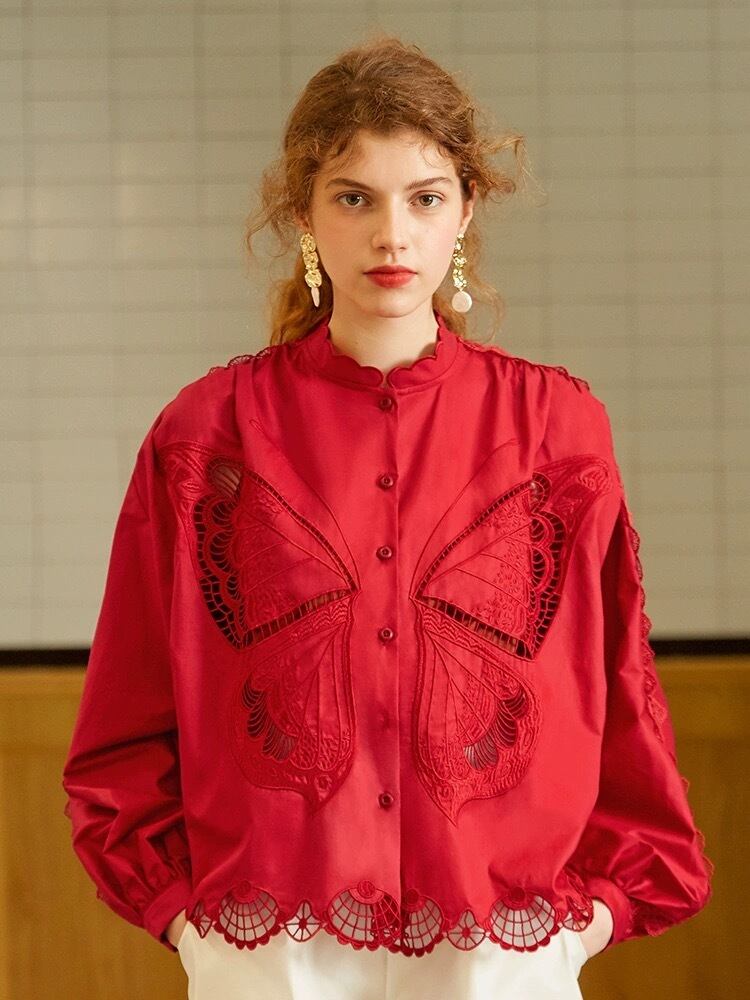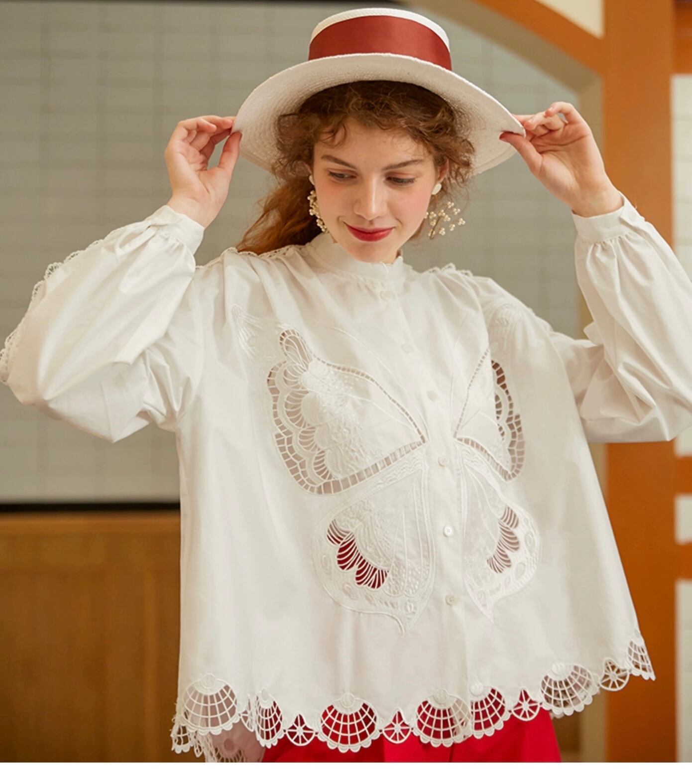 ブラウス 白 赤 バタフライ 蝶々 ガーリー シャツ