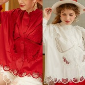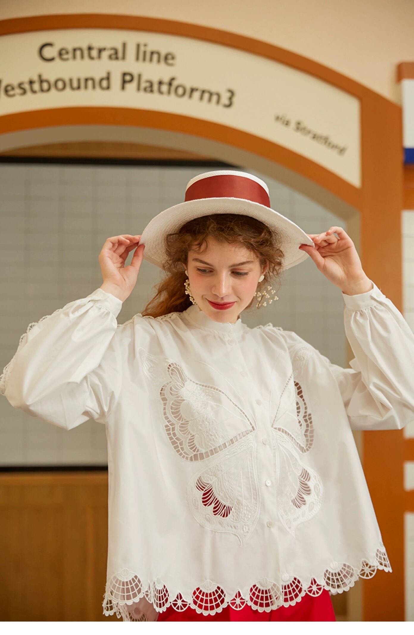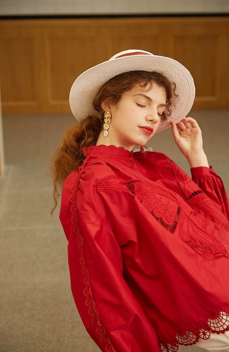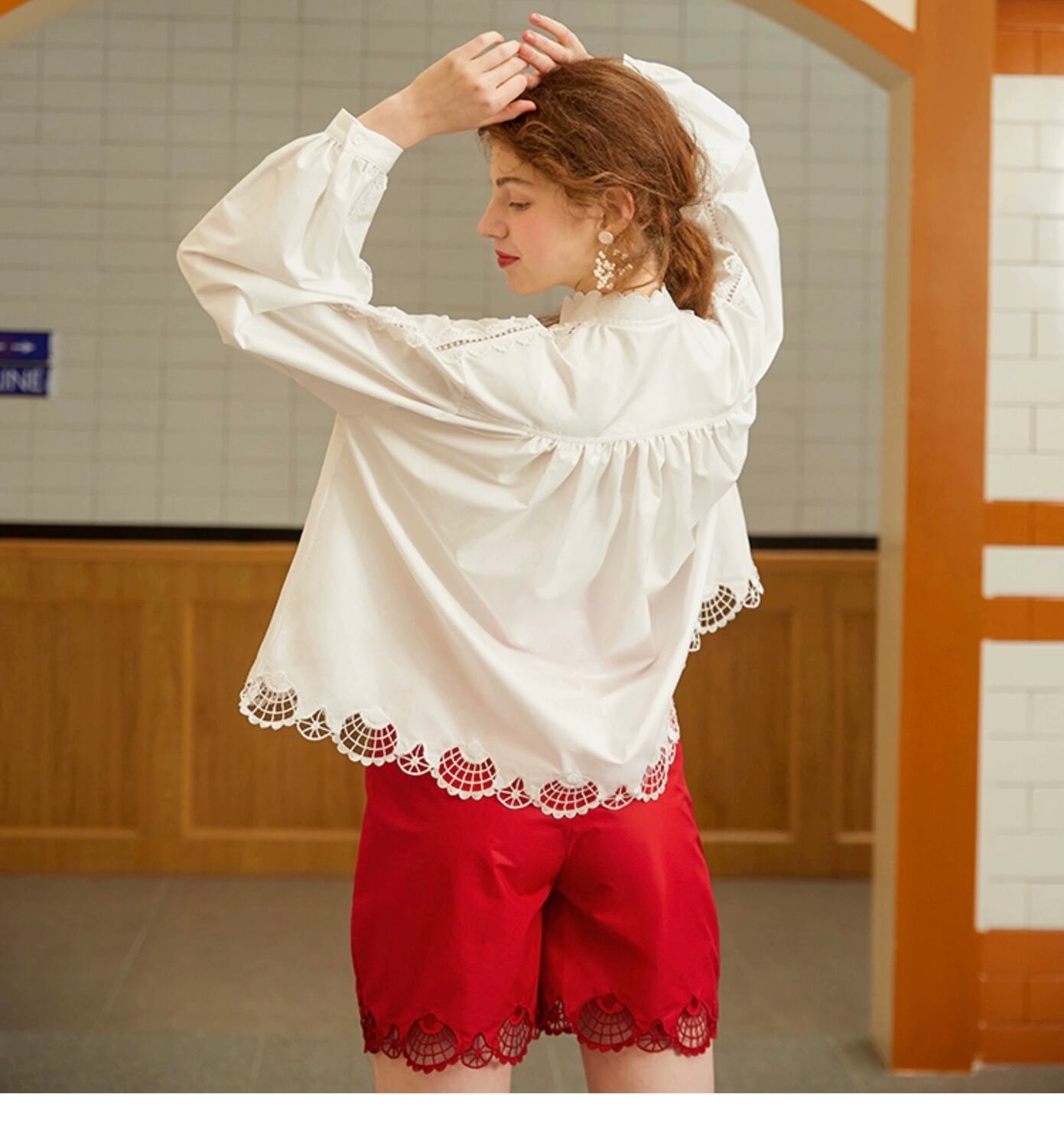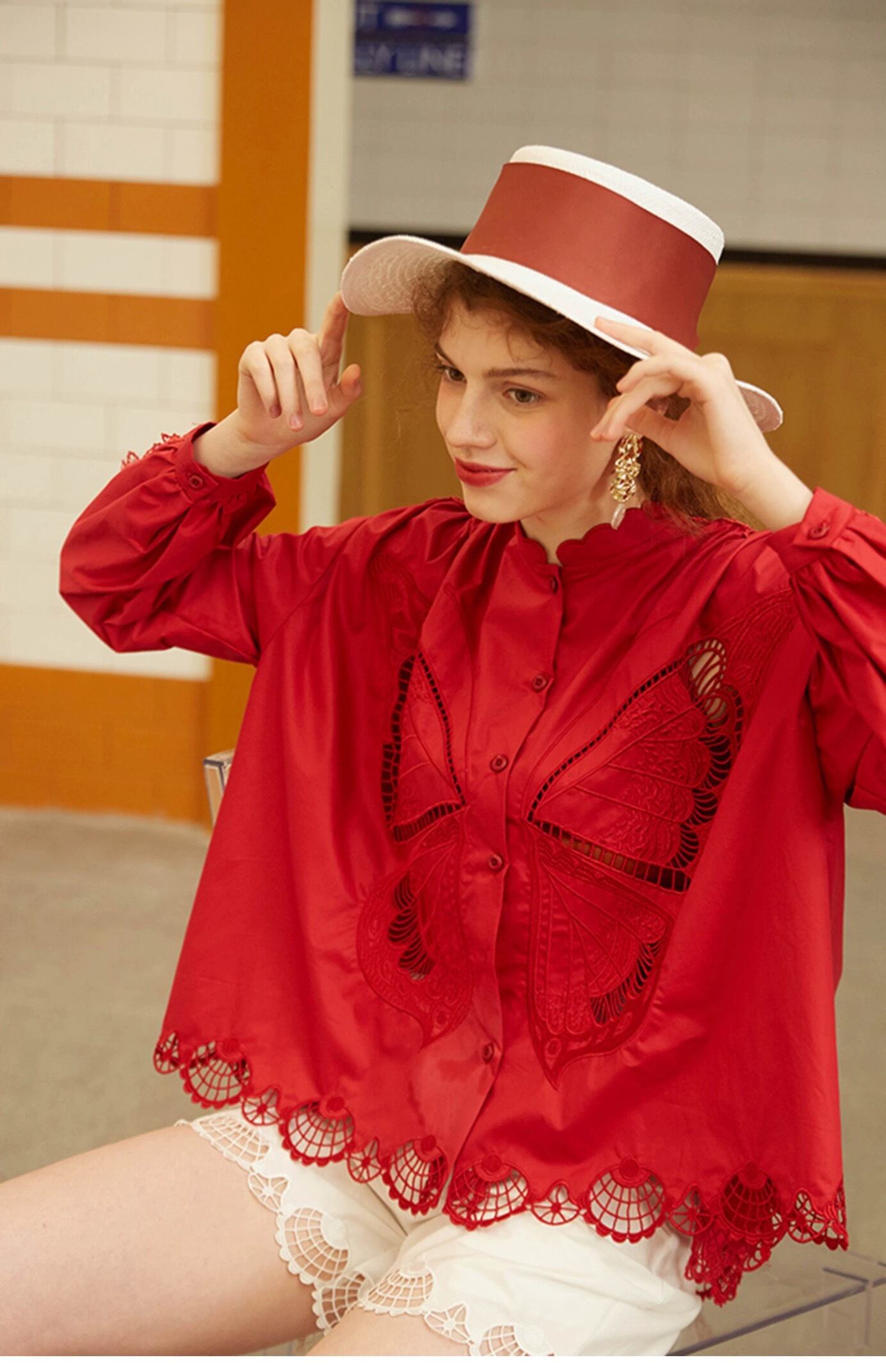 ブラウス 白 赤 バタフライ 蝶々 ガーリー シャツ