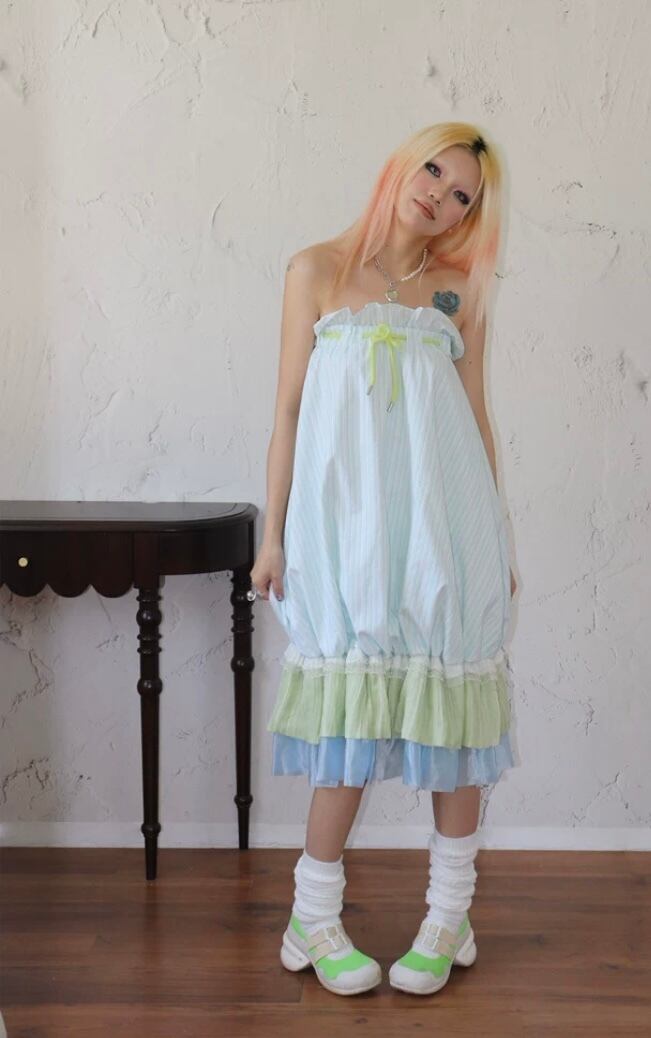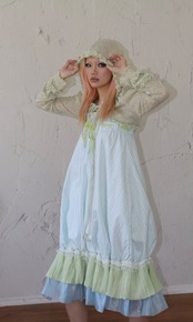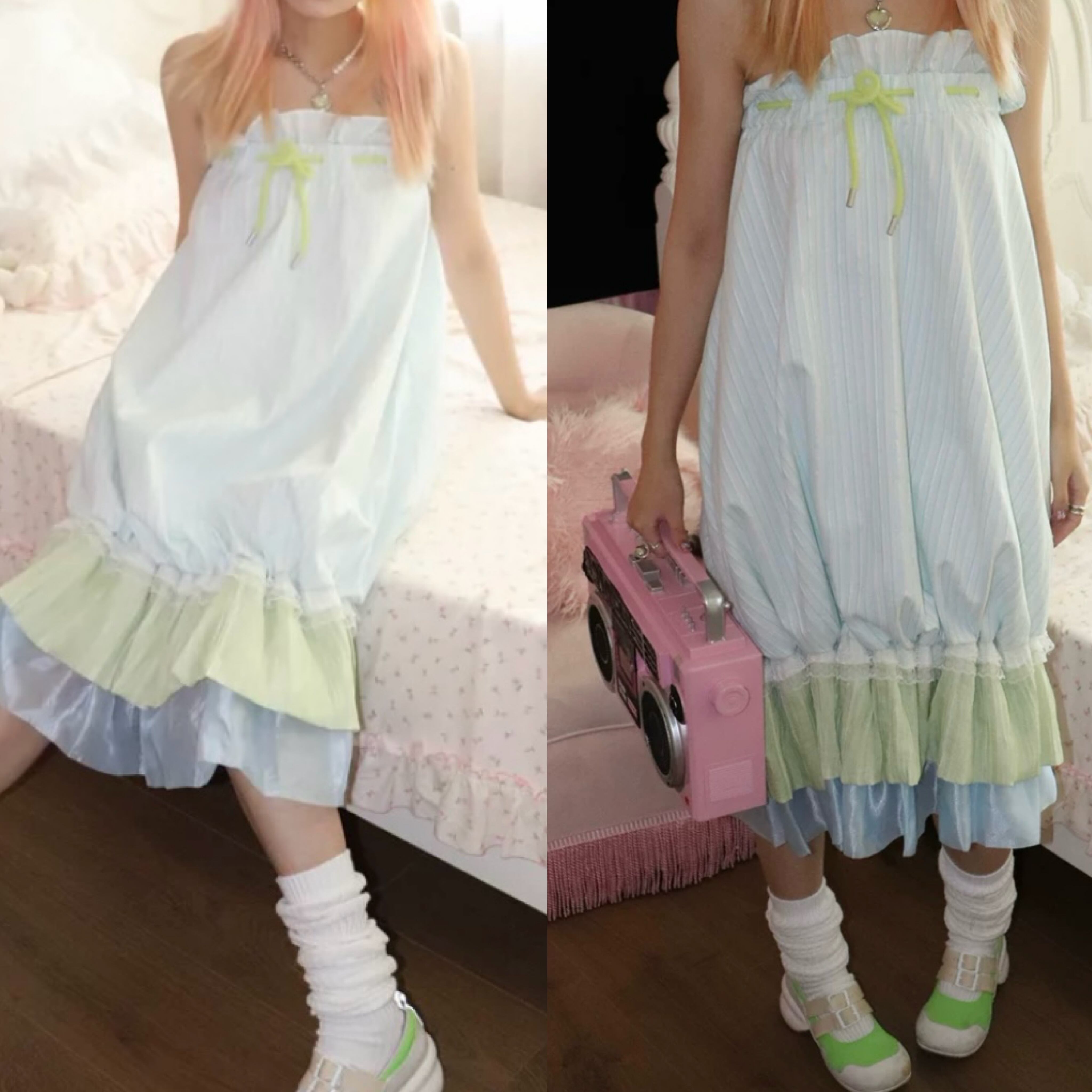 【2way】緑 水色 ストライプ チェック スカート ワンピース