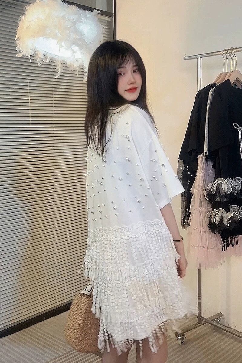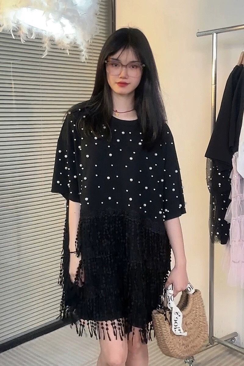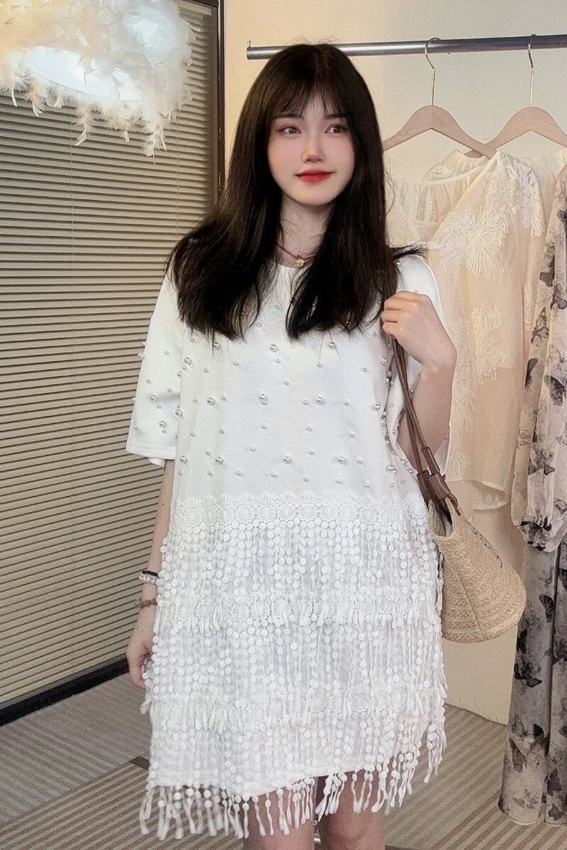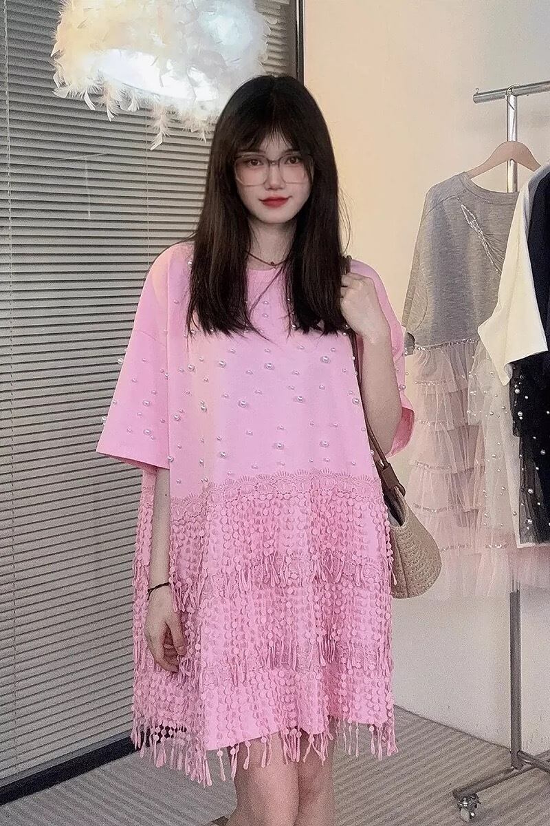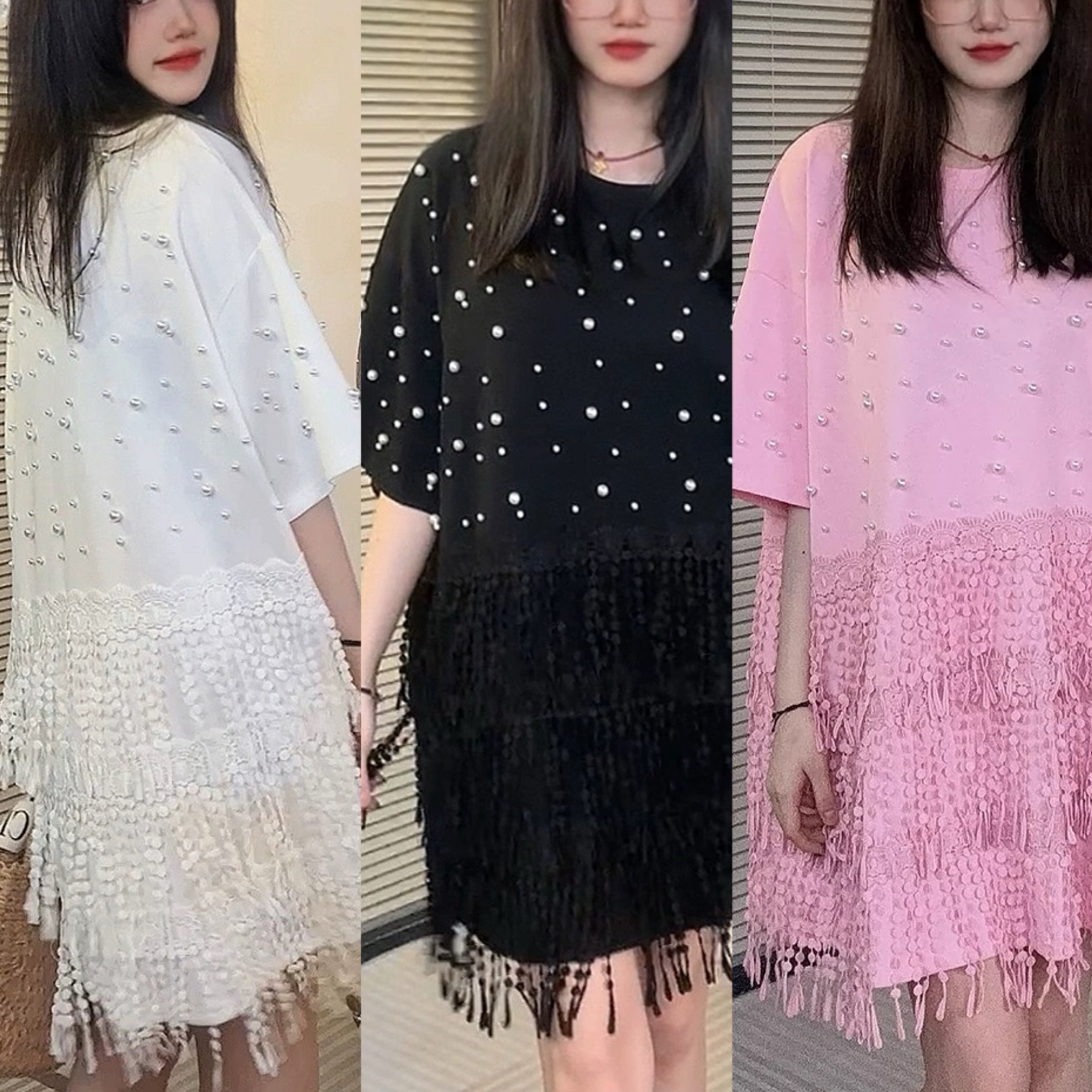 パール 黒 ピンク 白 カジュアル ワンピース フリンジ