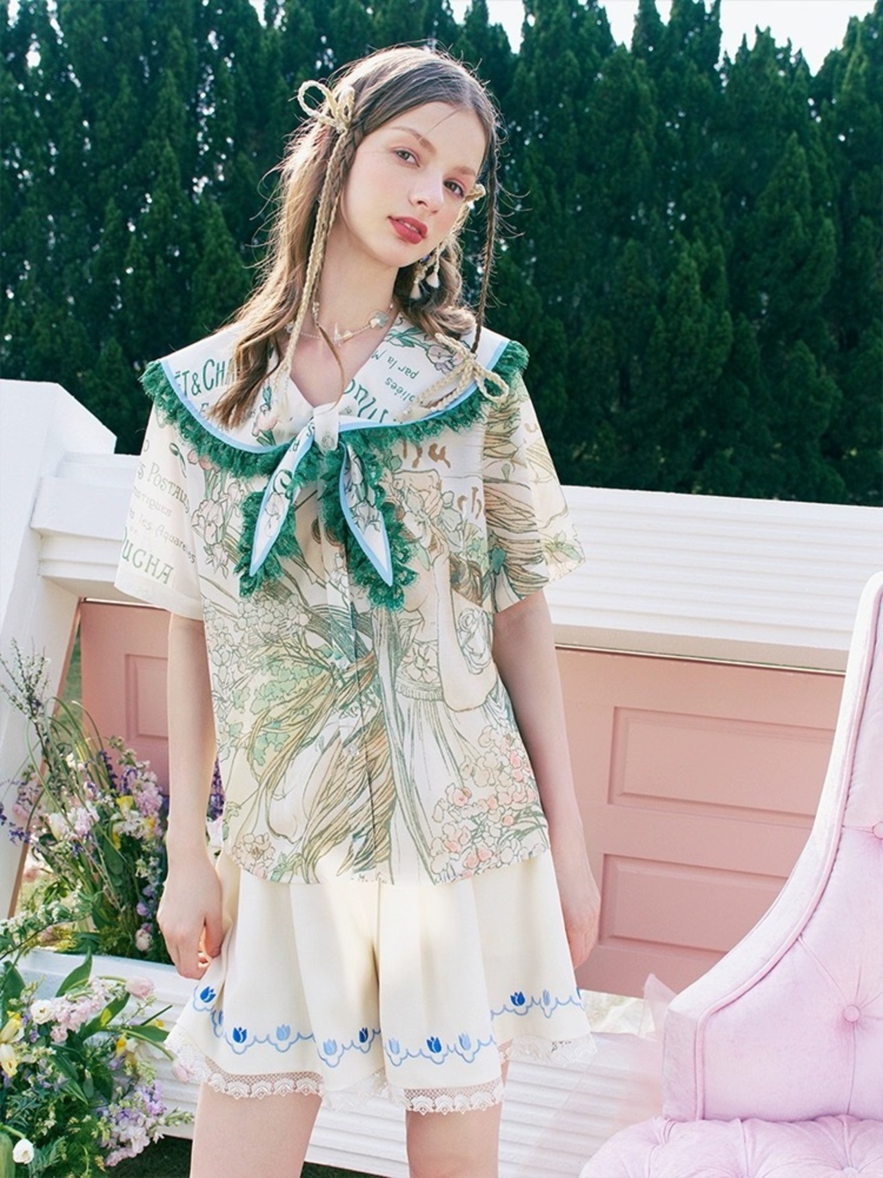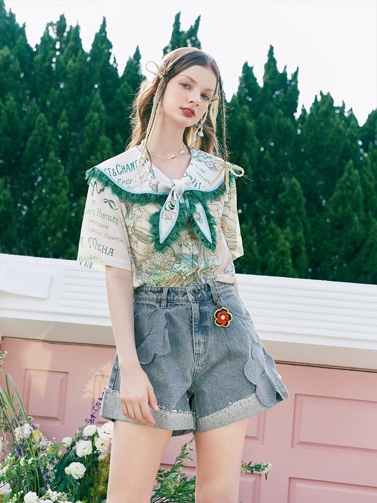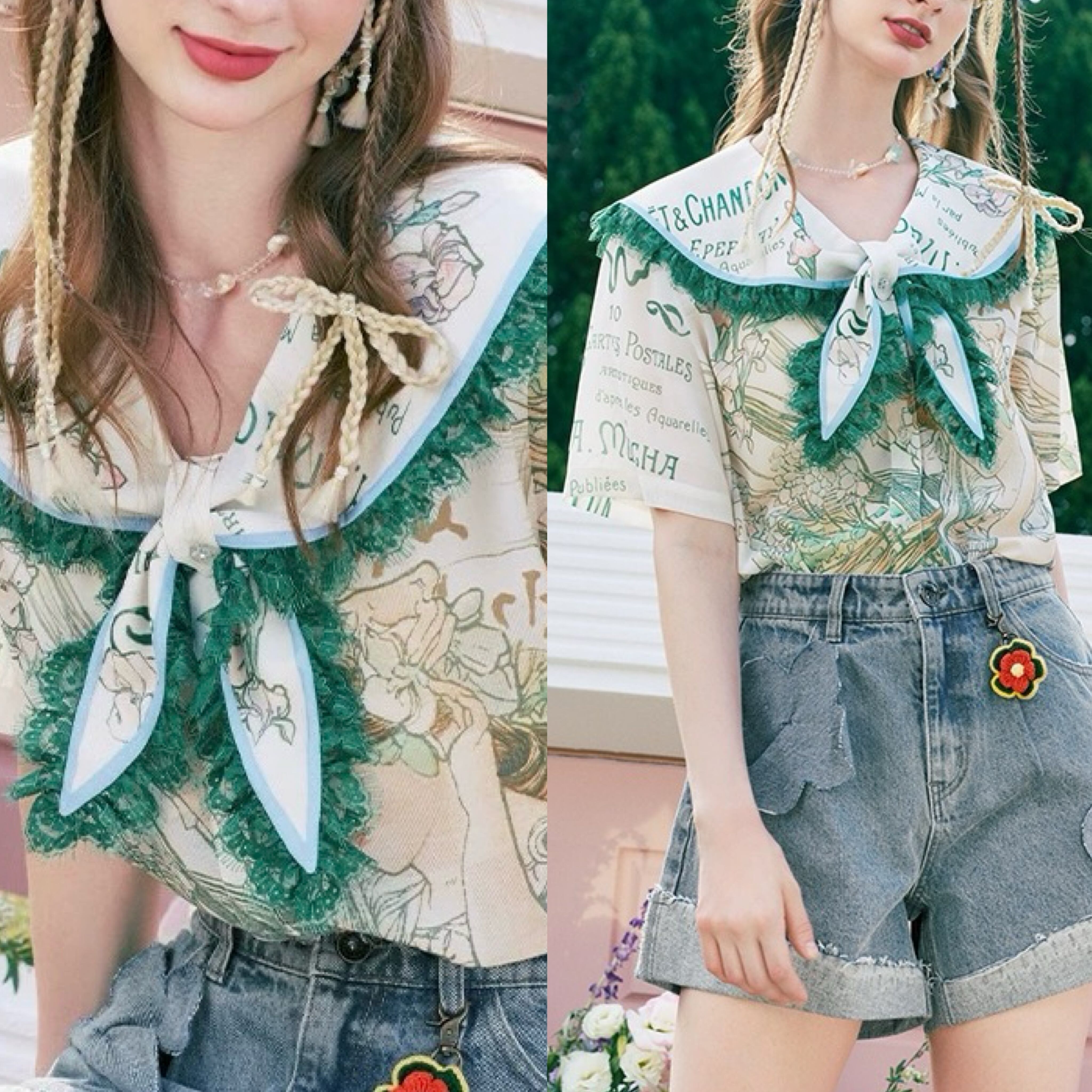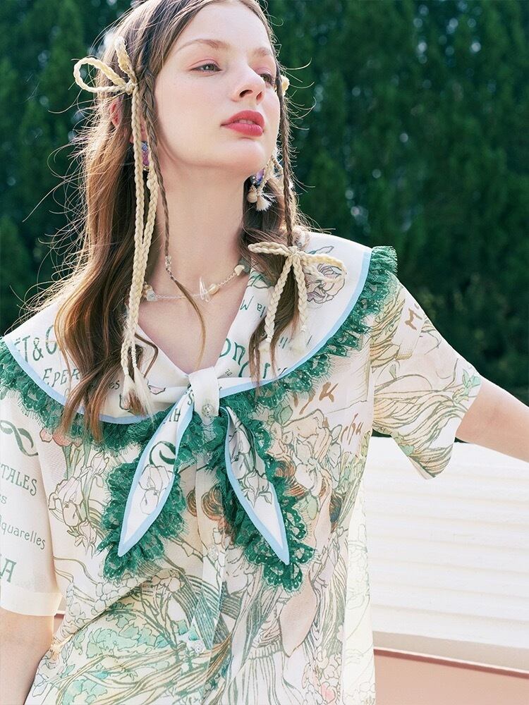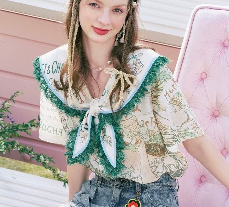 緑 リボン セーラ ブラウス ガーリー シャツ