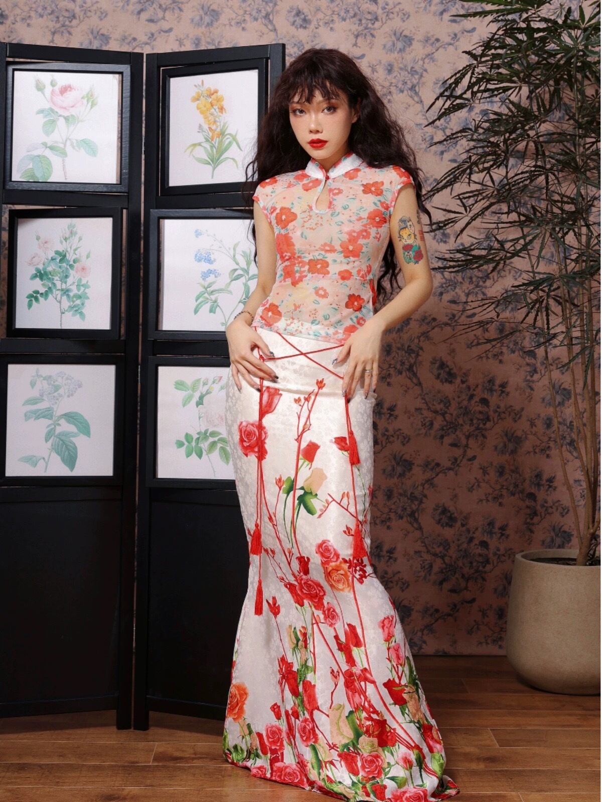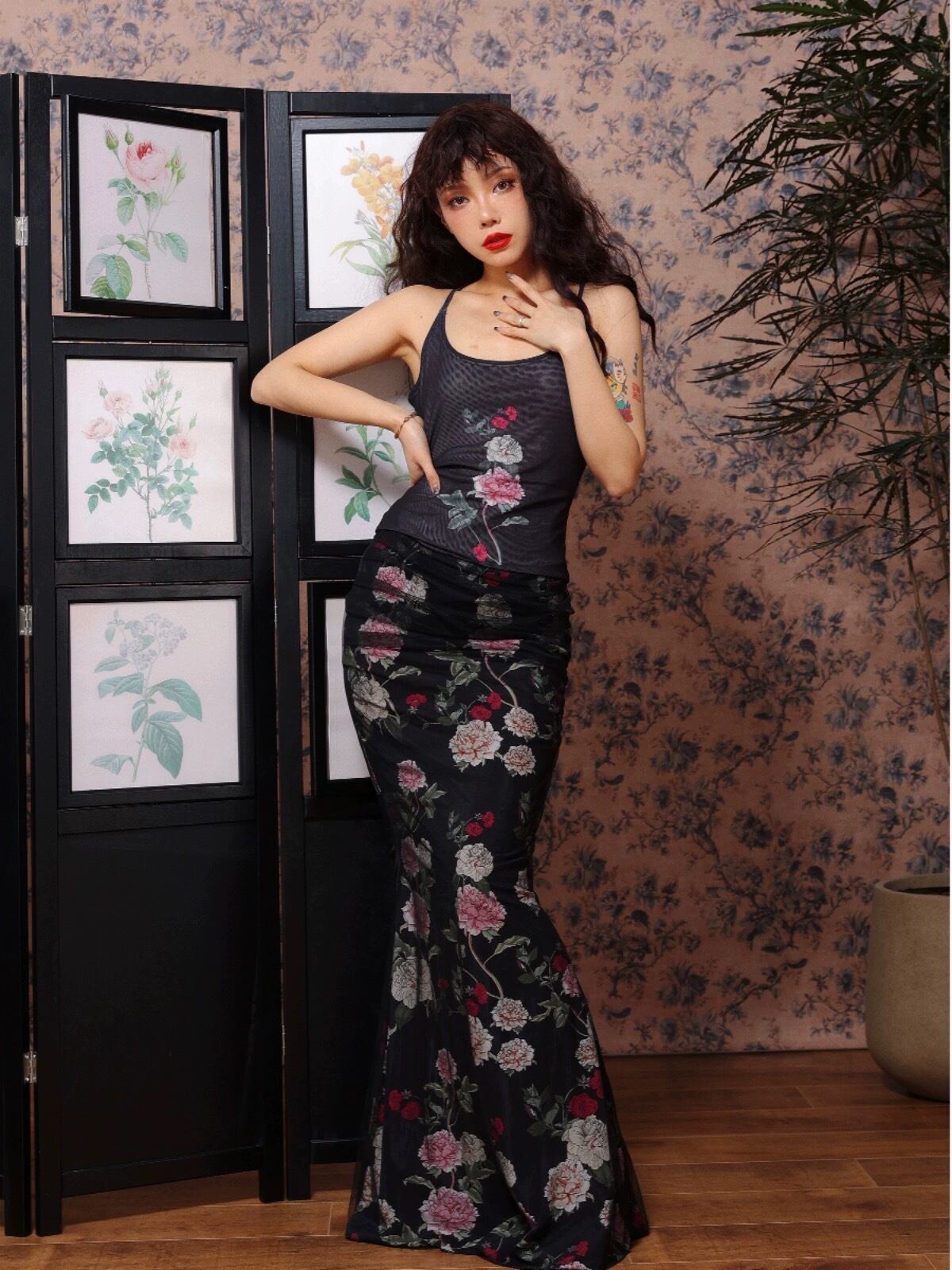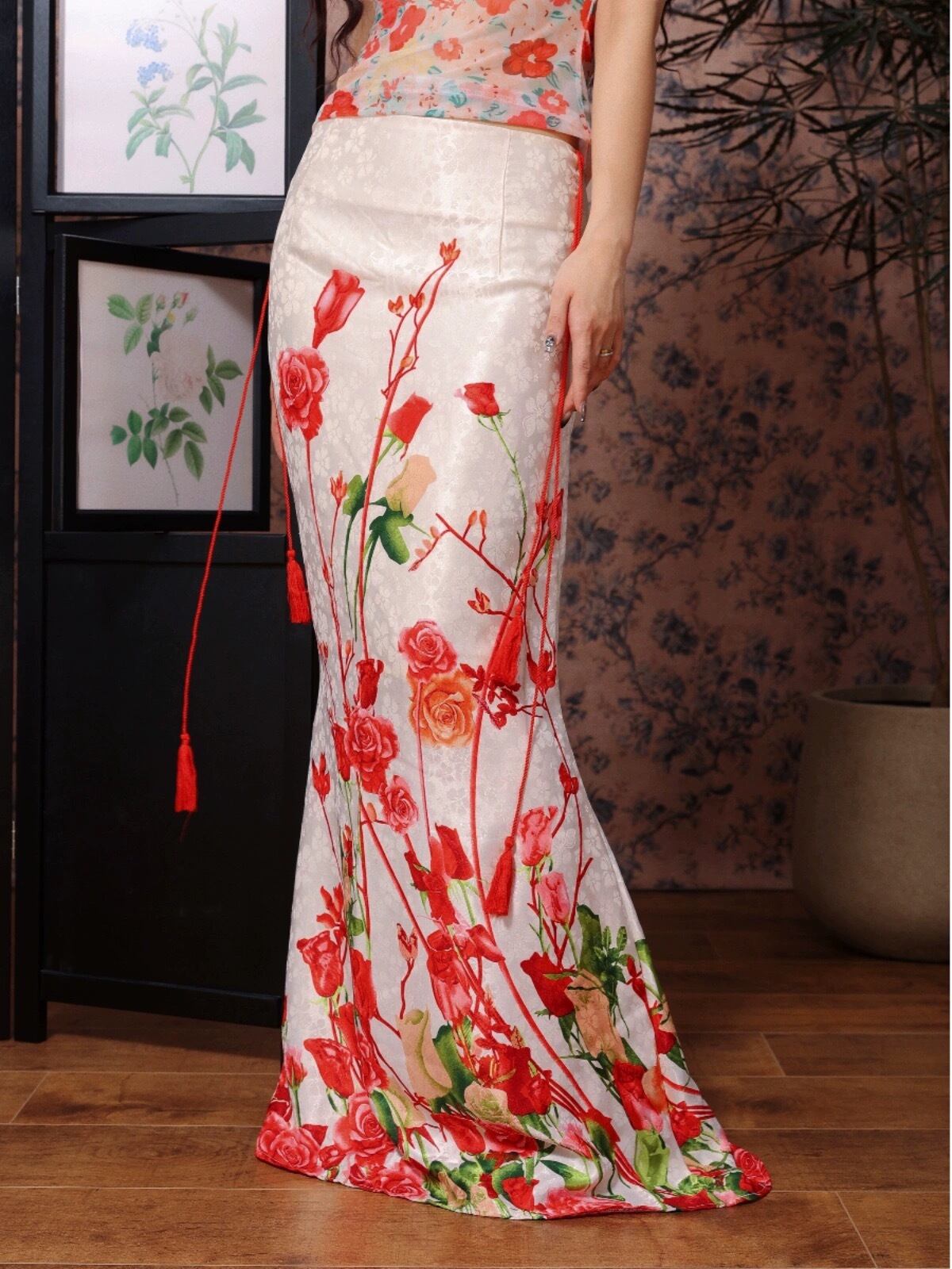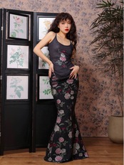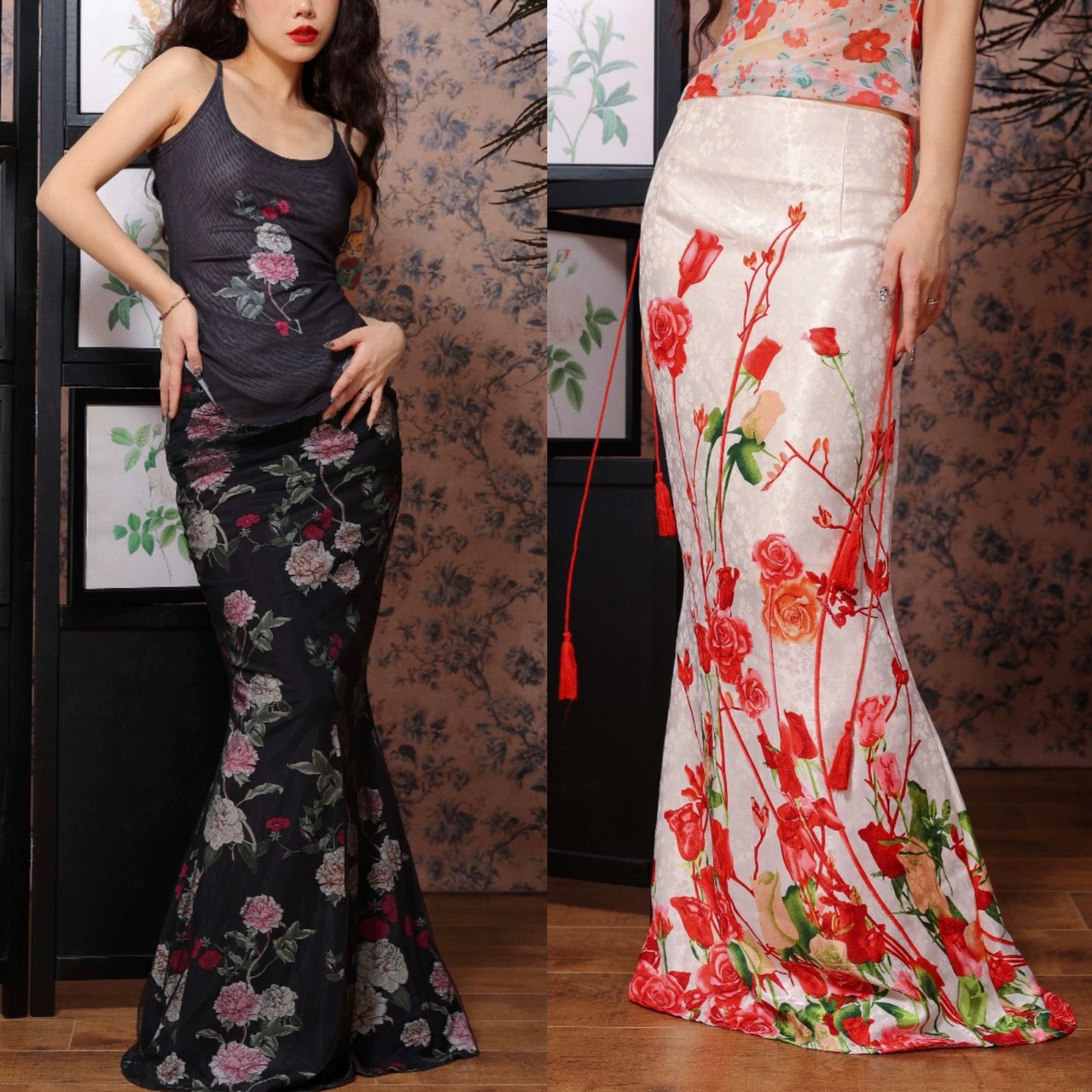 和柄 花柄 黒 白 マーメイド タイト スカート 着物 チャイナ服