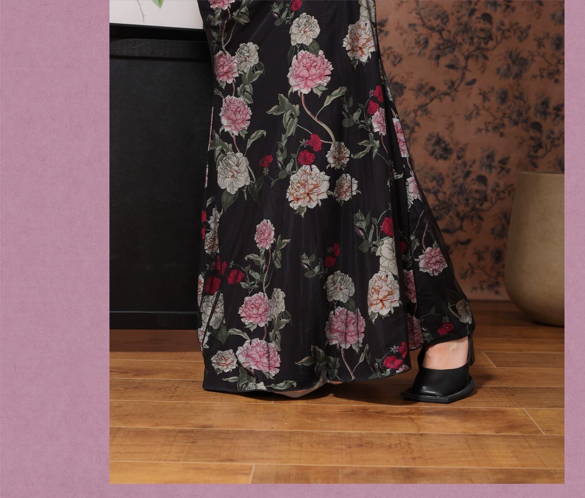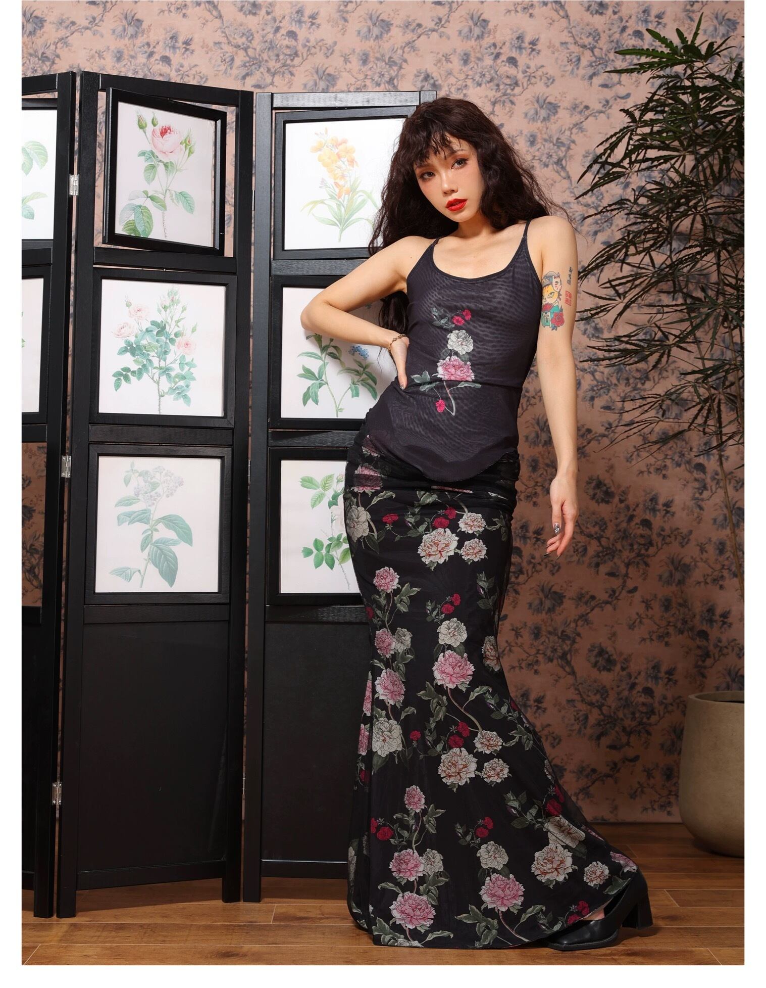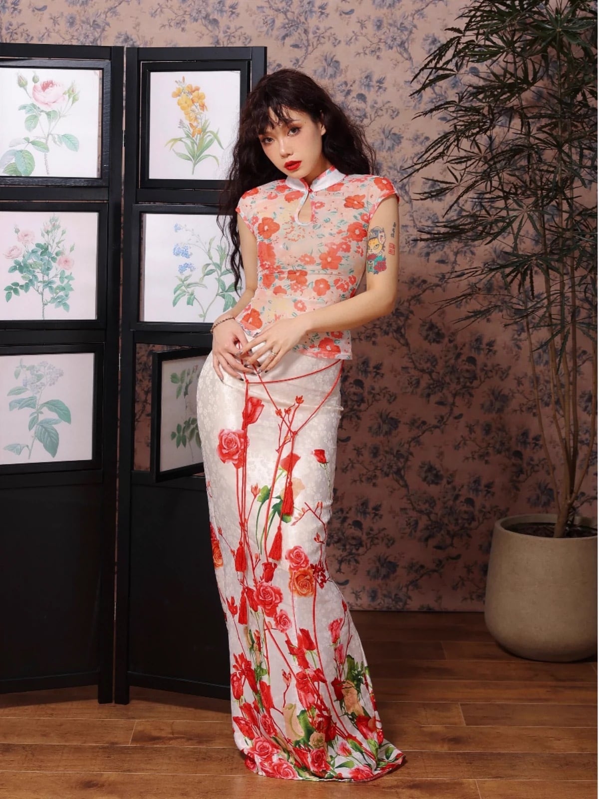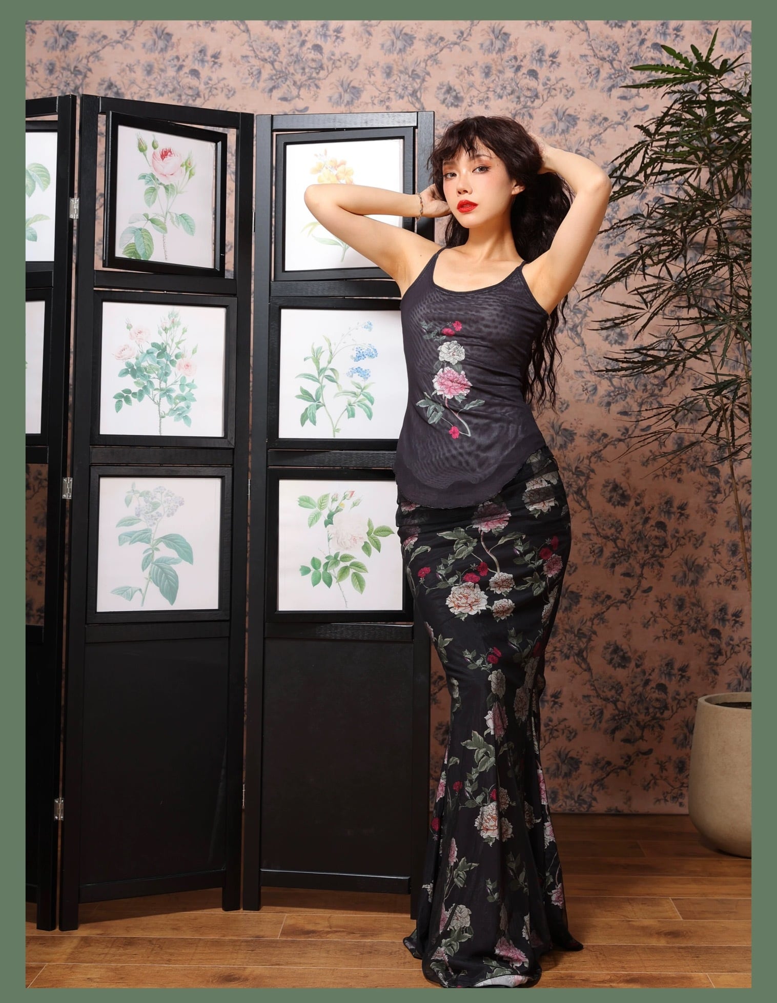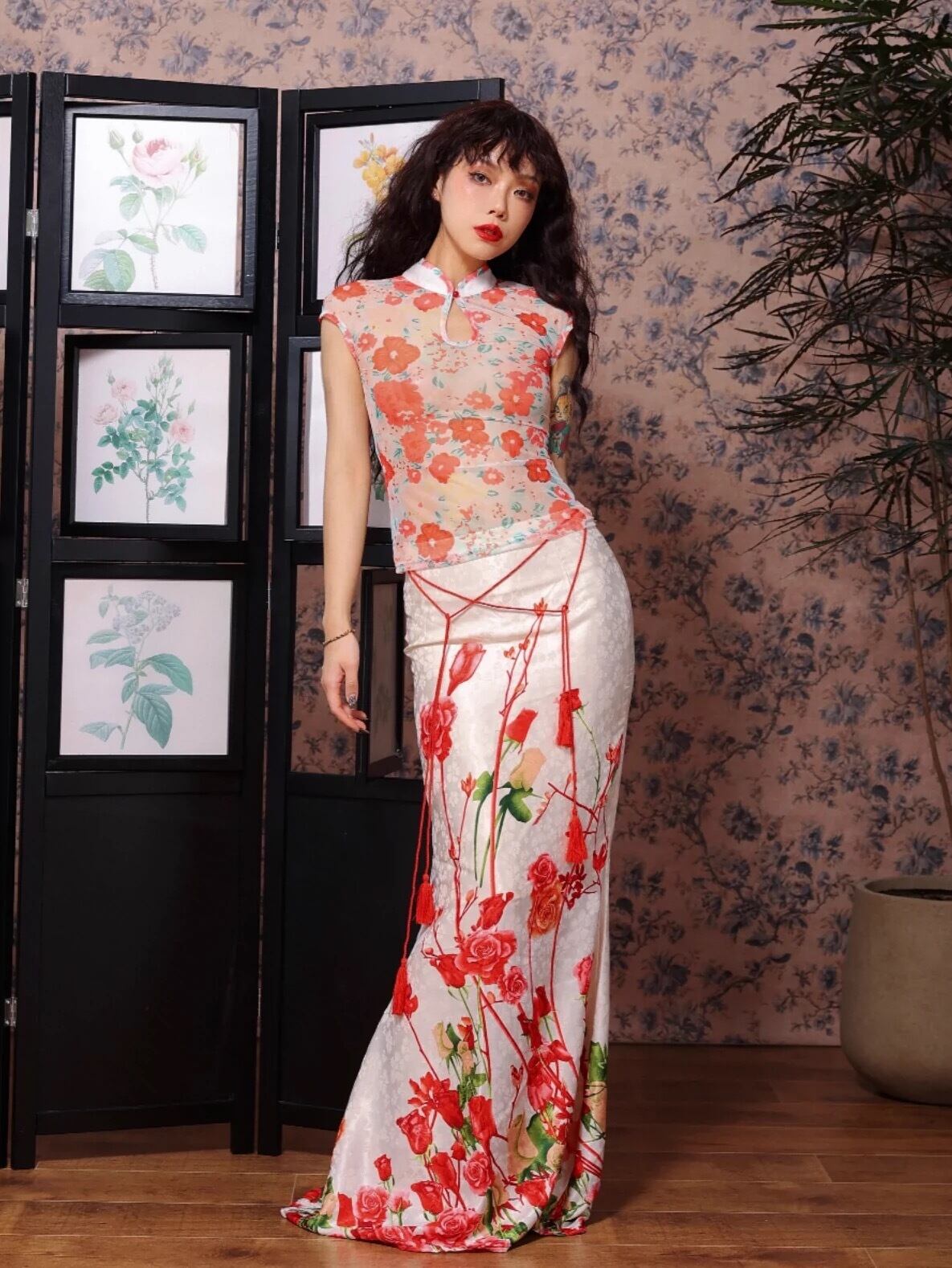 和柄 花柄 黒 白 マーメイド タイト スカート 着物 チャイナ服