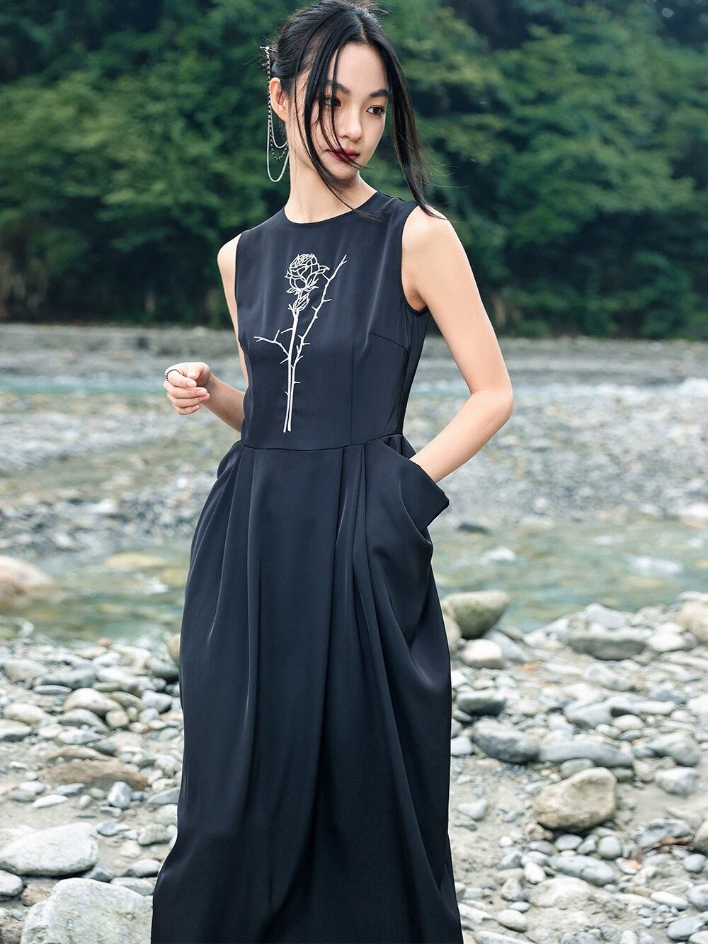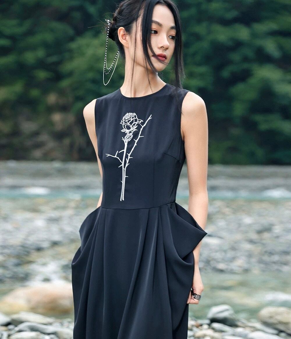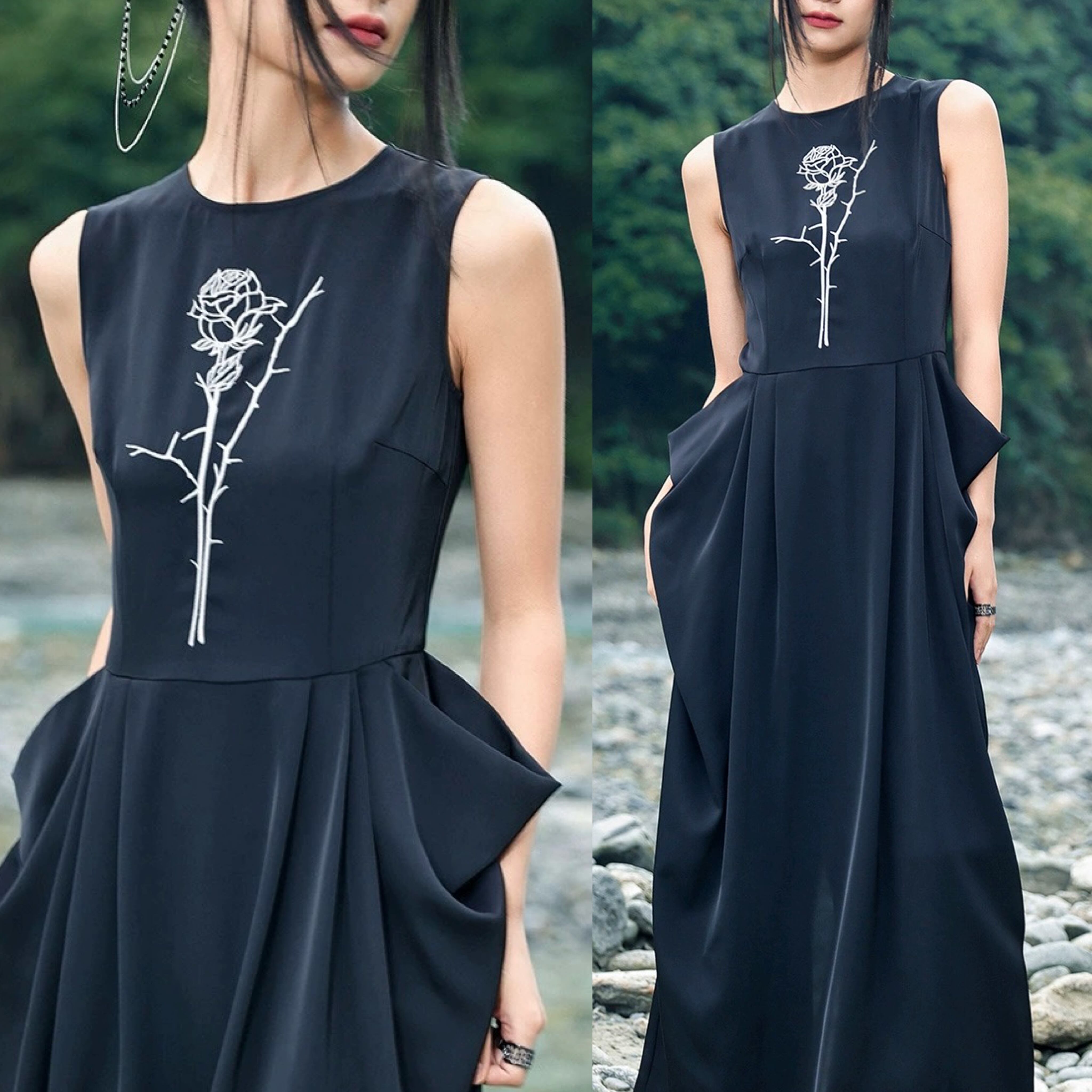 バラ 薔薇 花柄 フラワー 黒 ワンピース マキシ モード ブラック