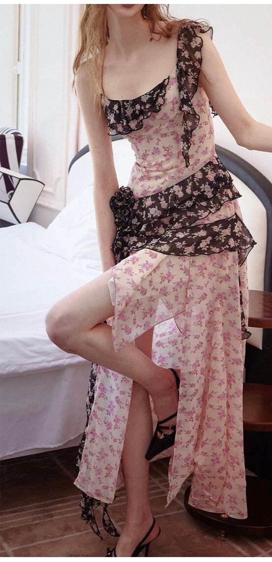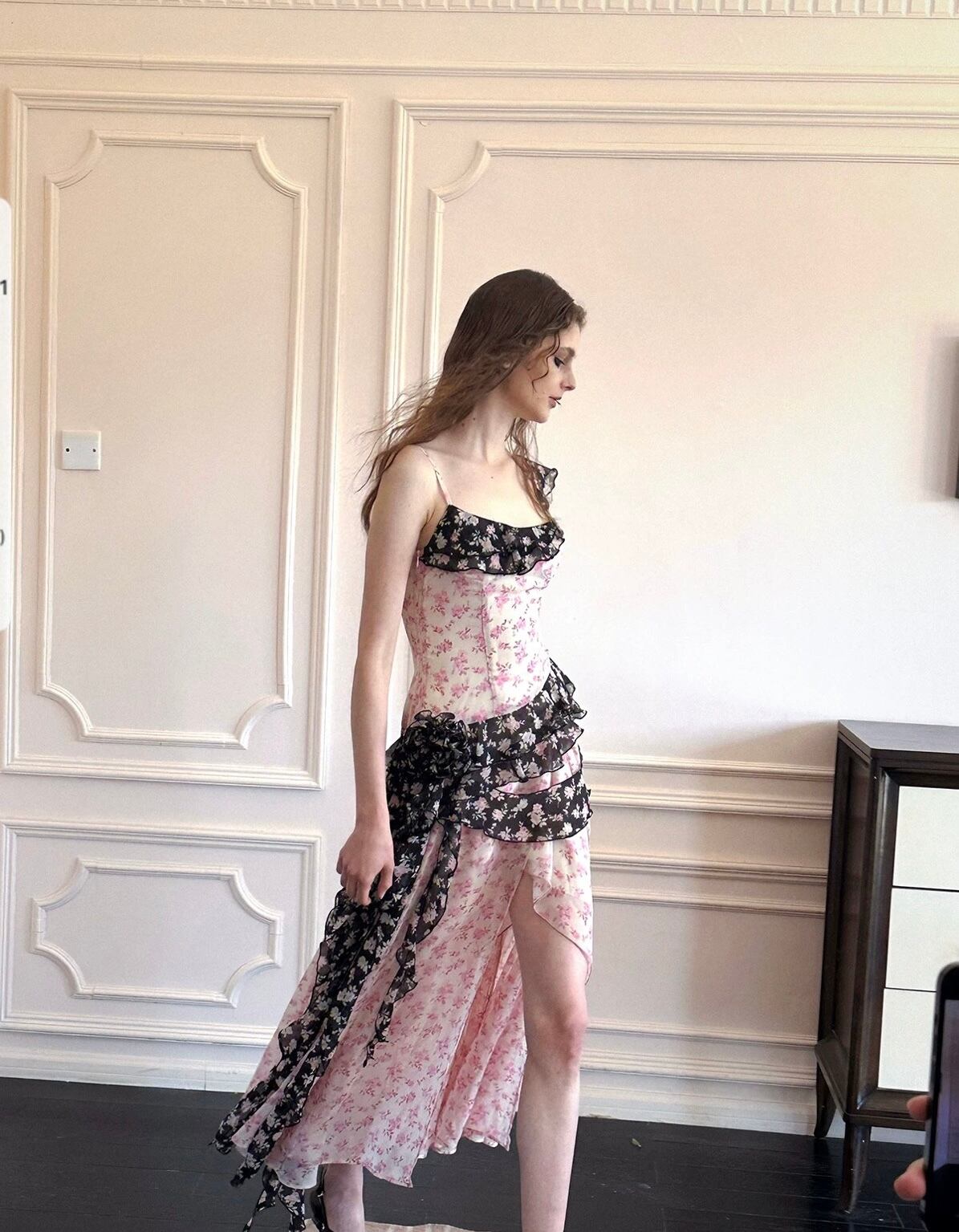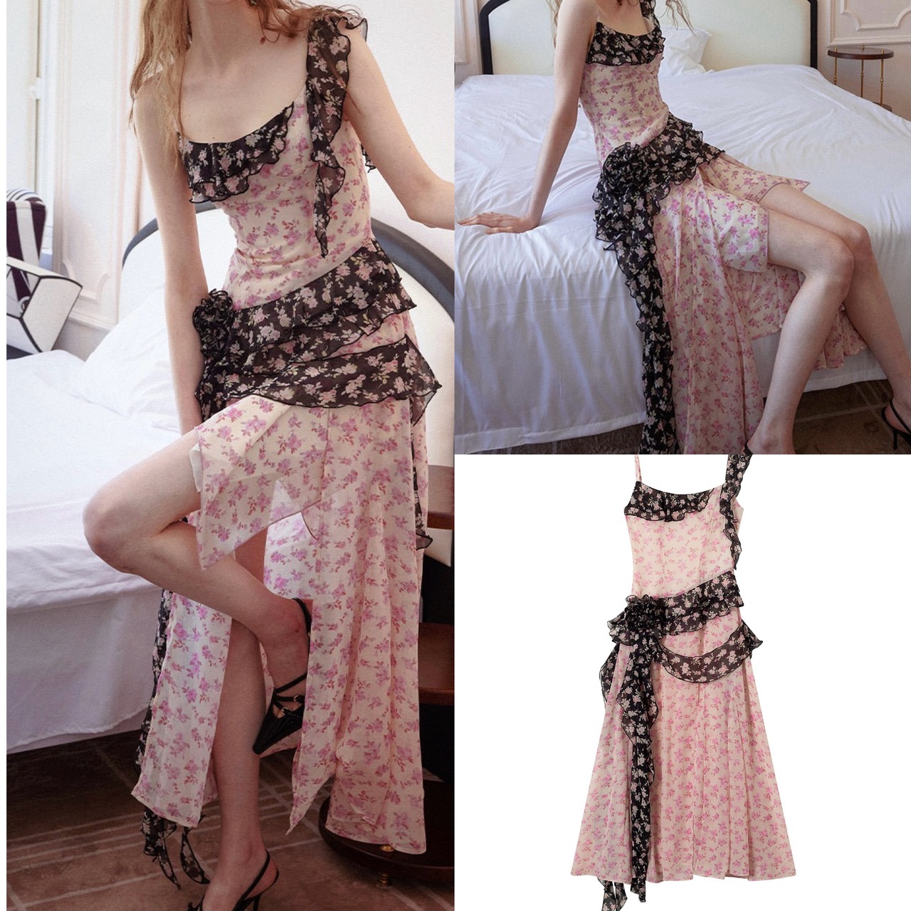 パッチワーク ピンク 黒 ワンピース キャミソール 花柄 フラワー