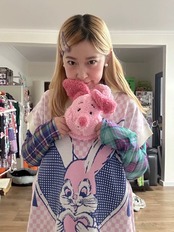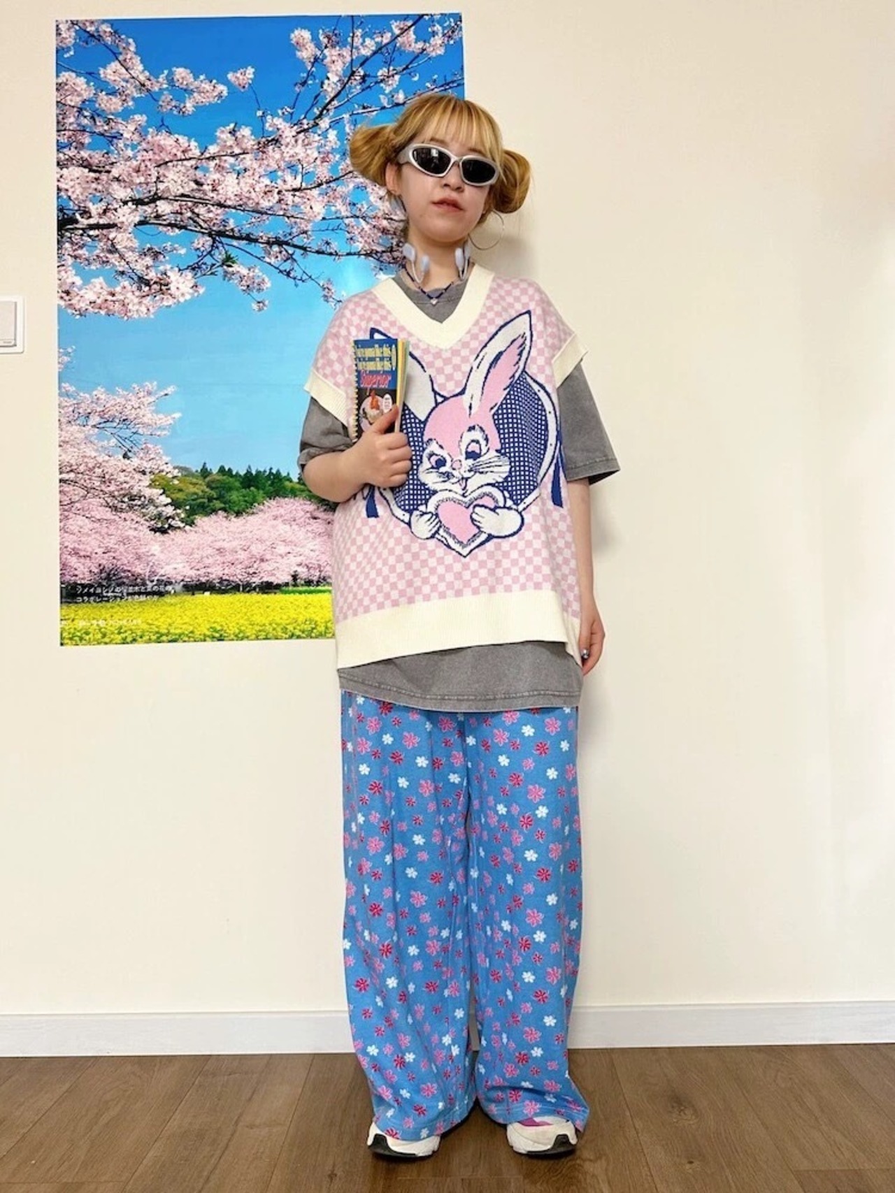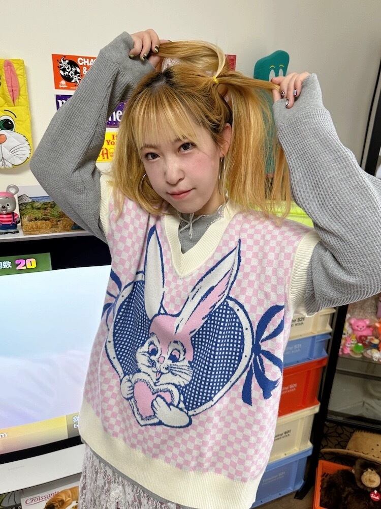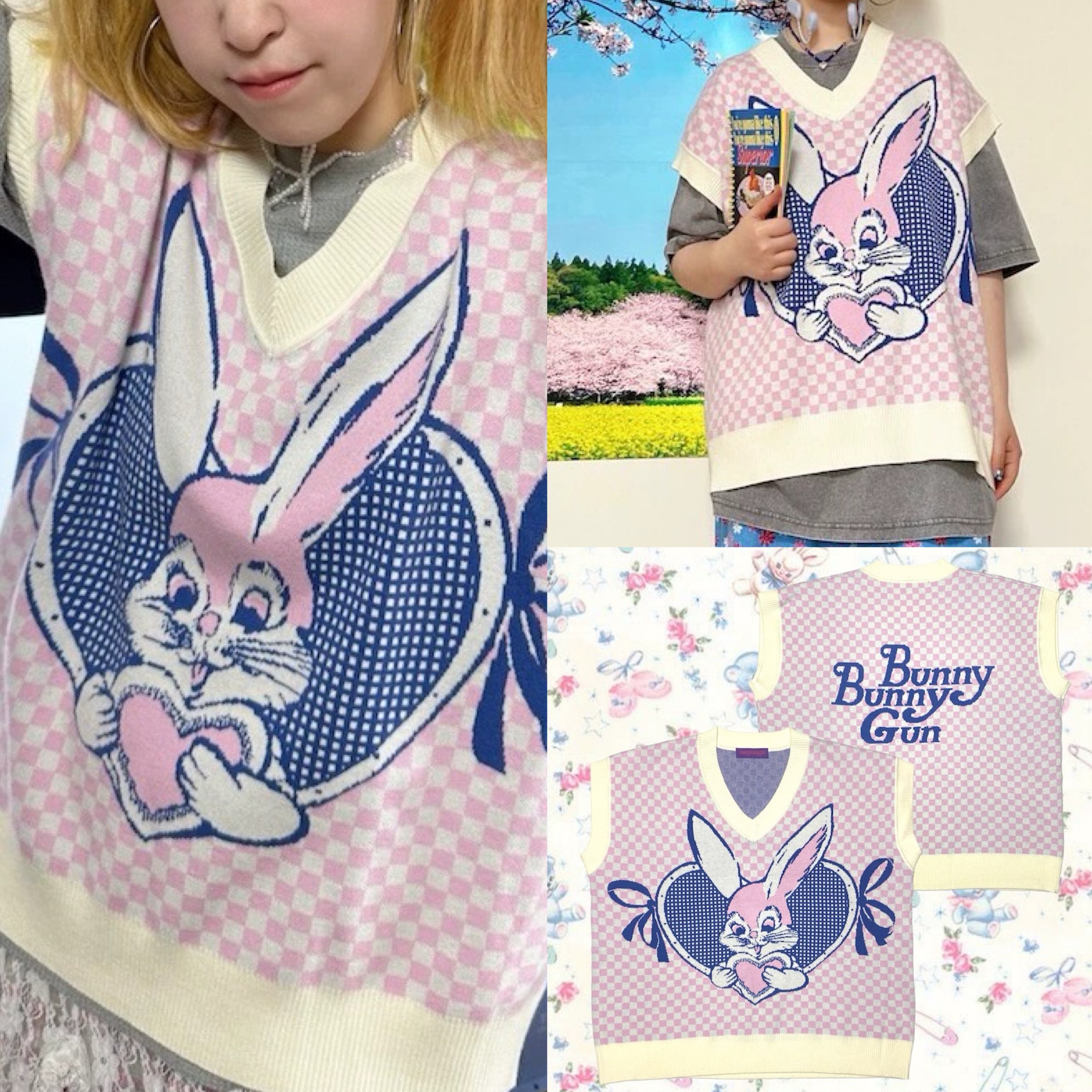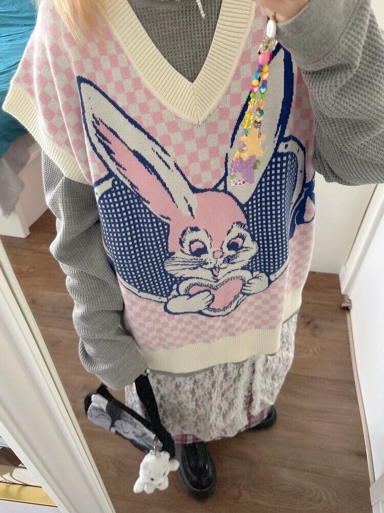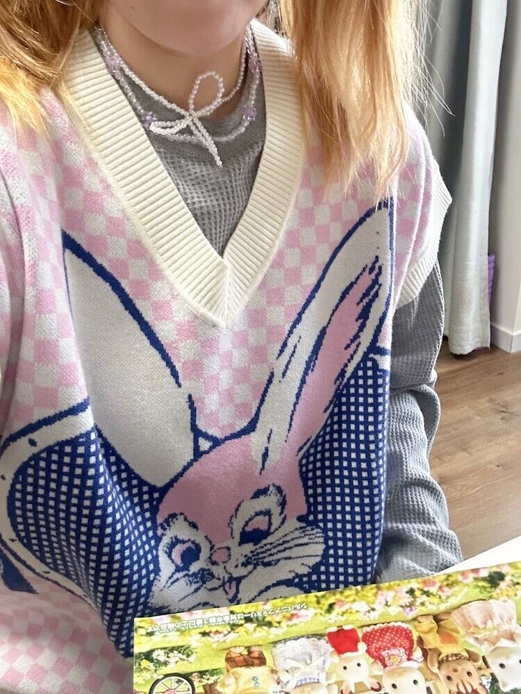ベスト うさぎ ピンク チェック カーディガン トップス