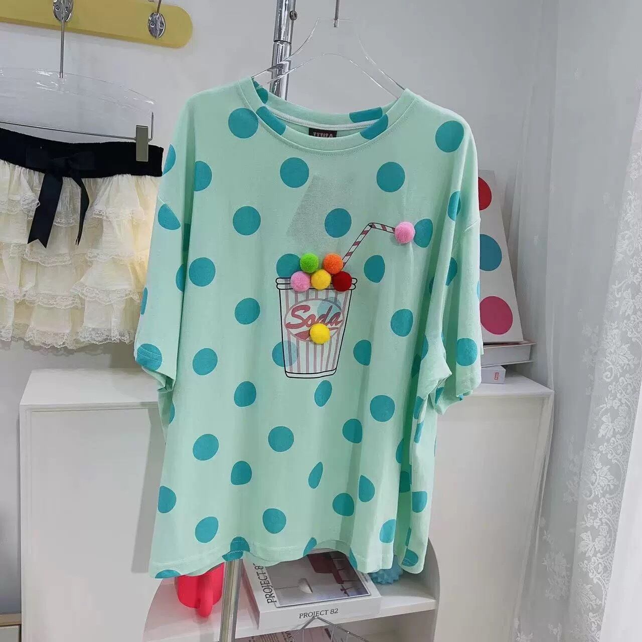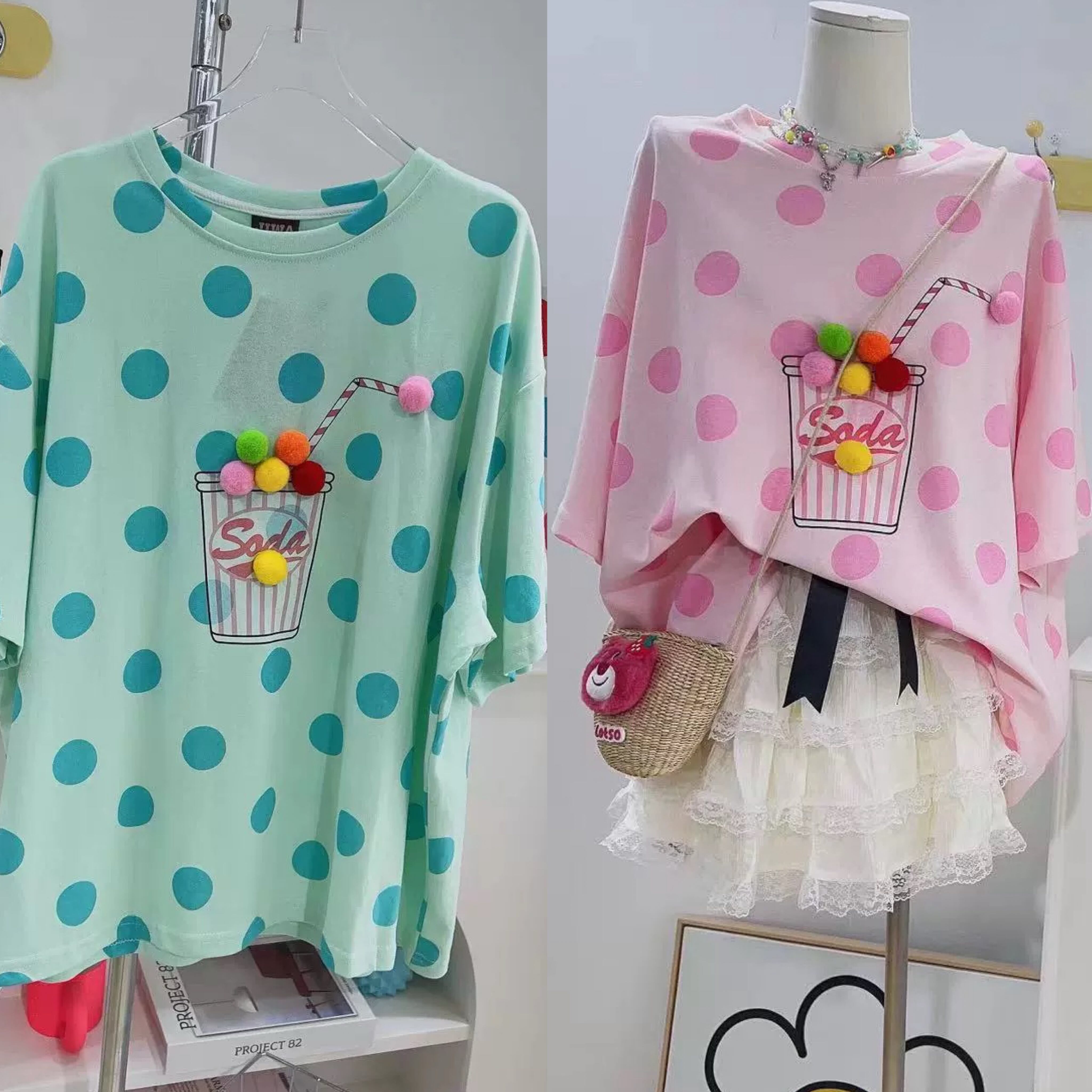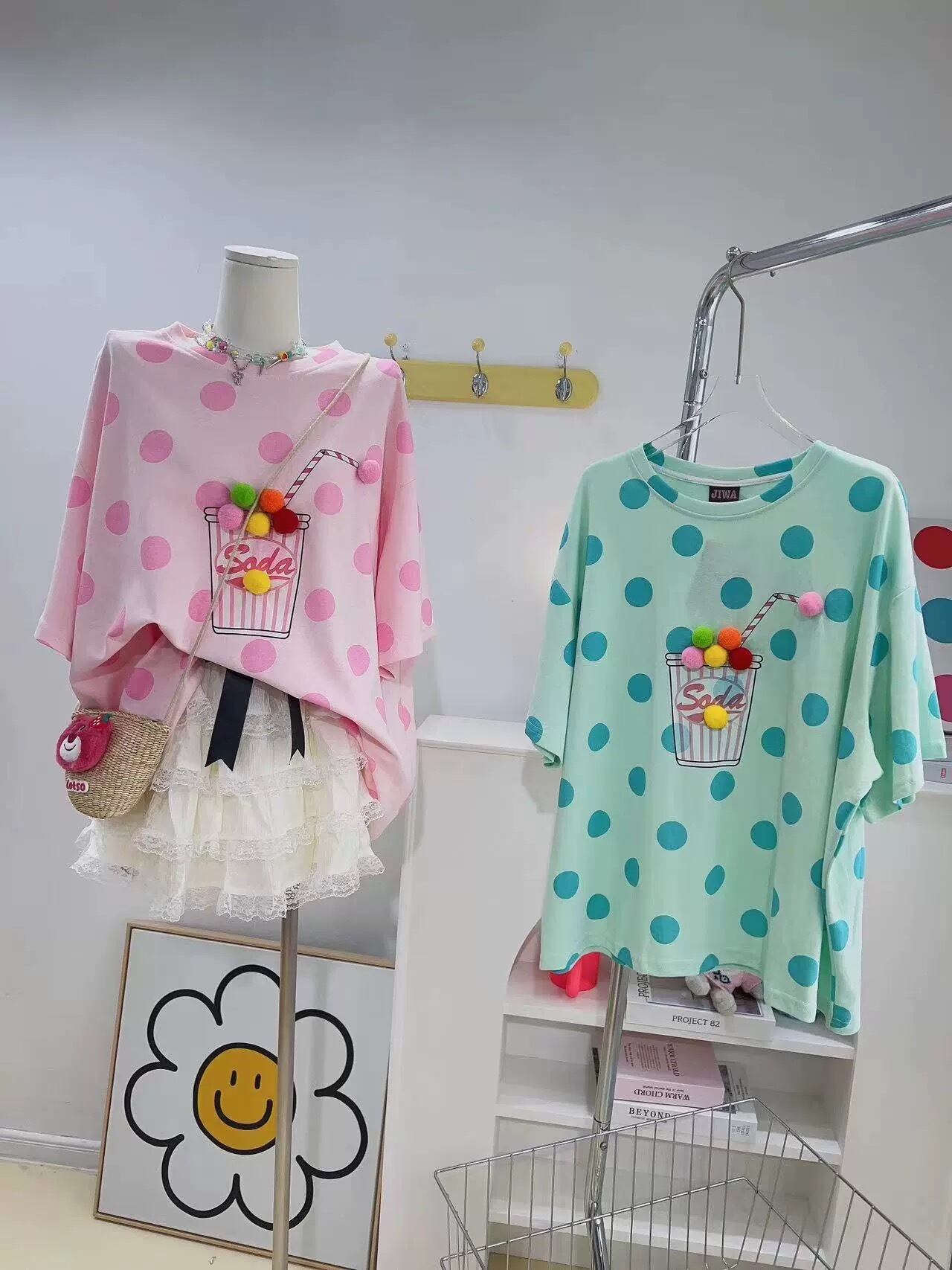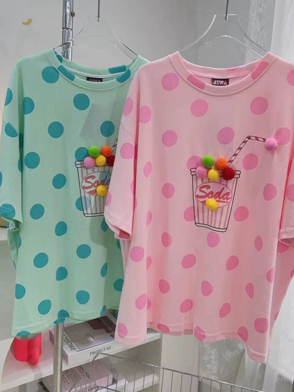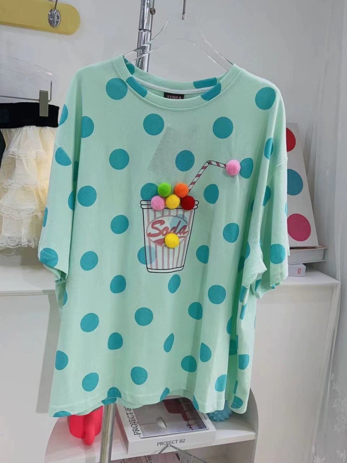 水玉 ピンク 緑 ドット Tシャツ ガーリー カジュアル