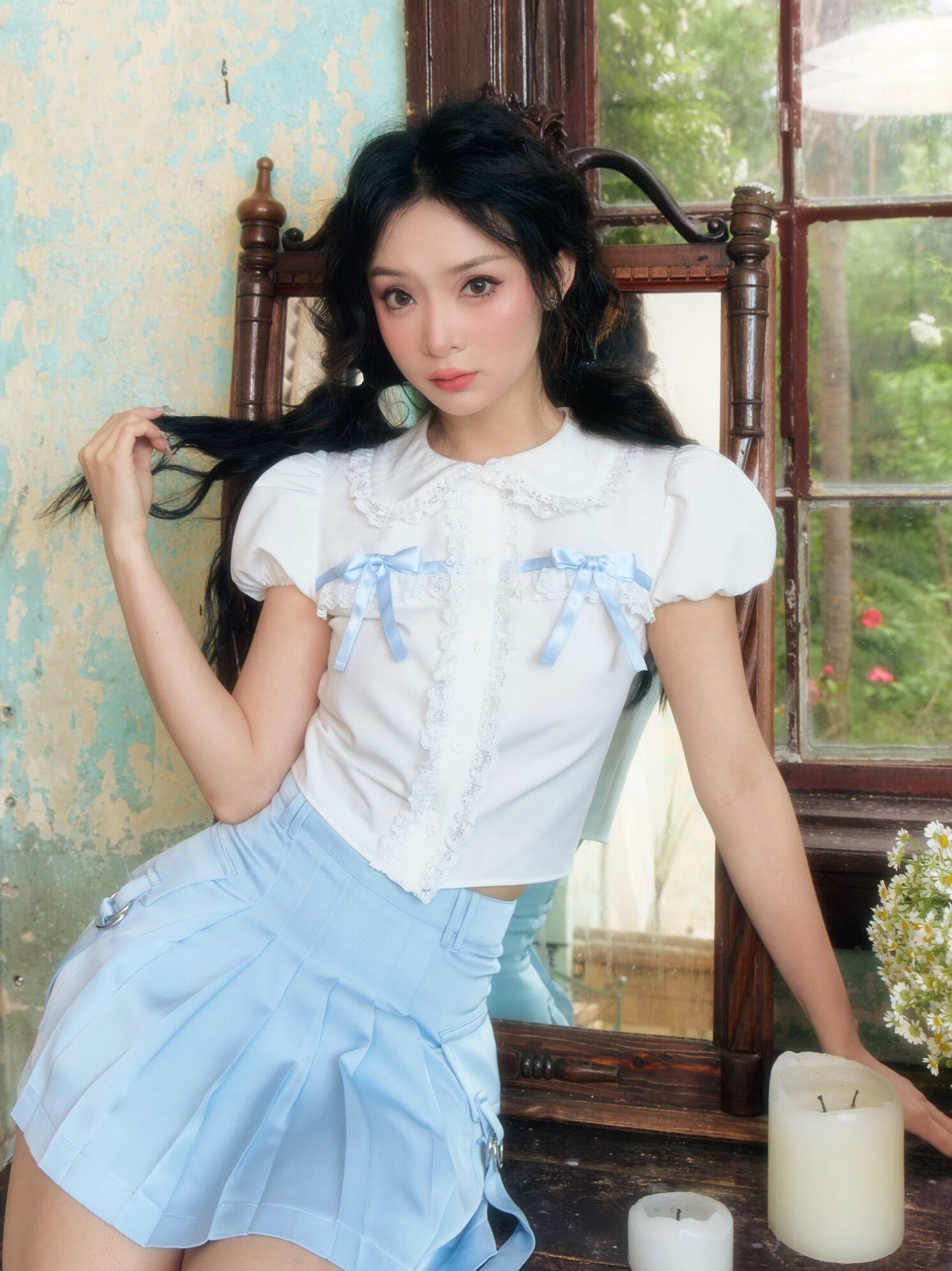ブラウス 白 ホワイト ガーリー 水色 可愛い トップス