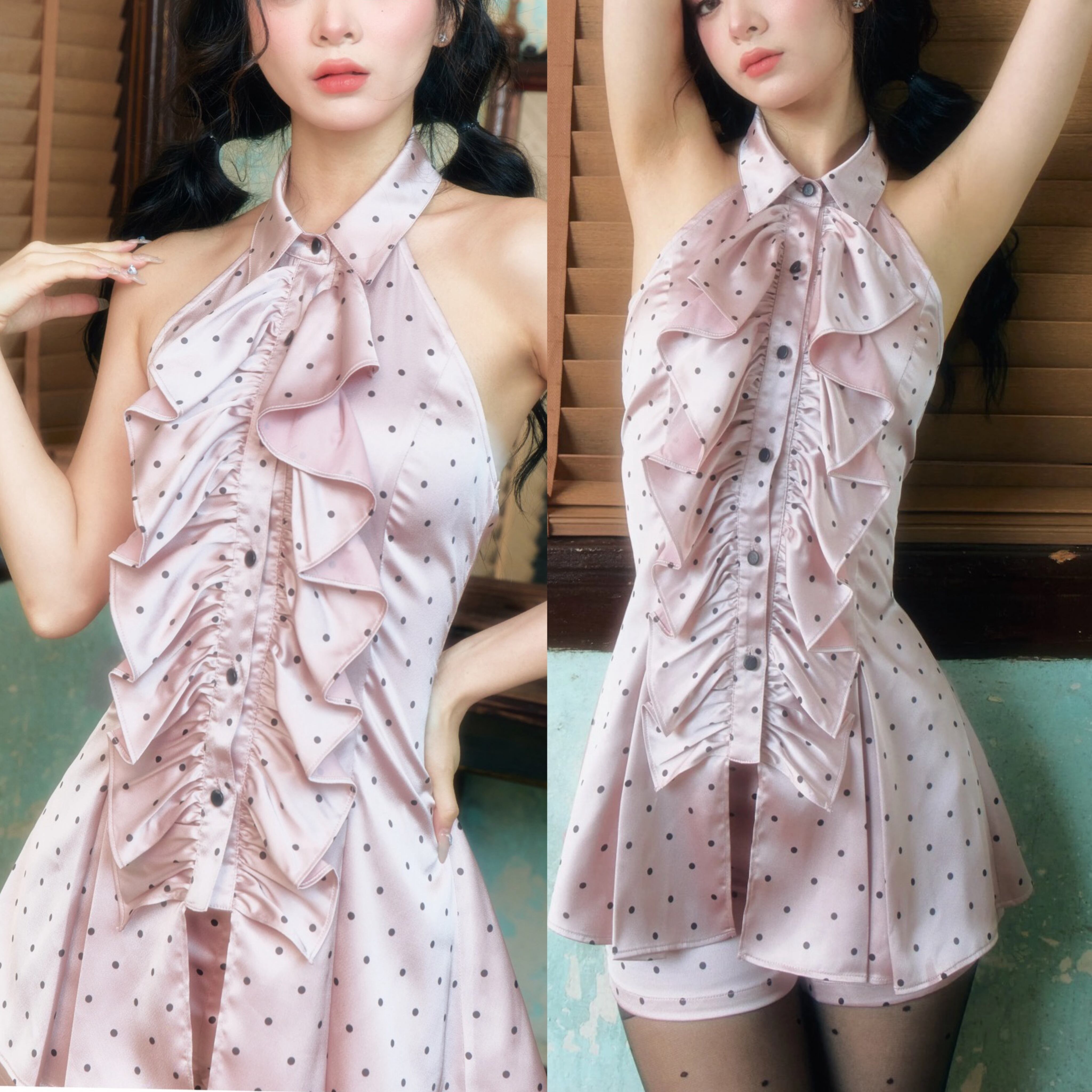 ピンク 水玉 ホルダーネック ガーリー ブラウス 可愛い シャツ トップス
