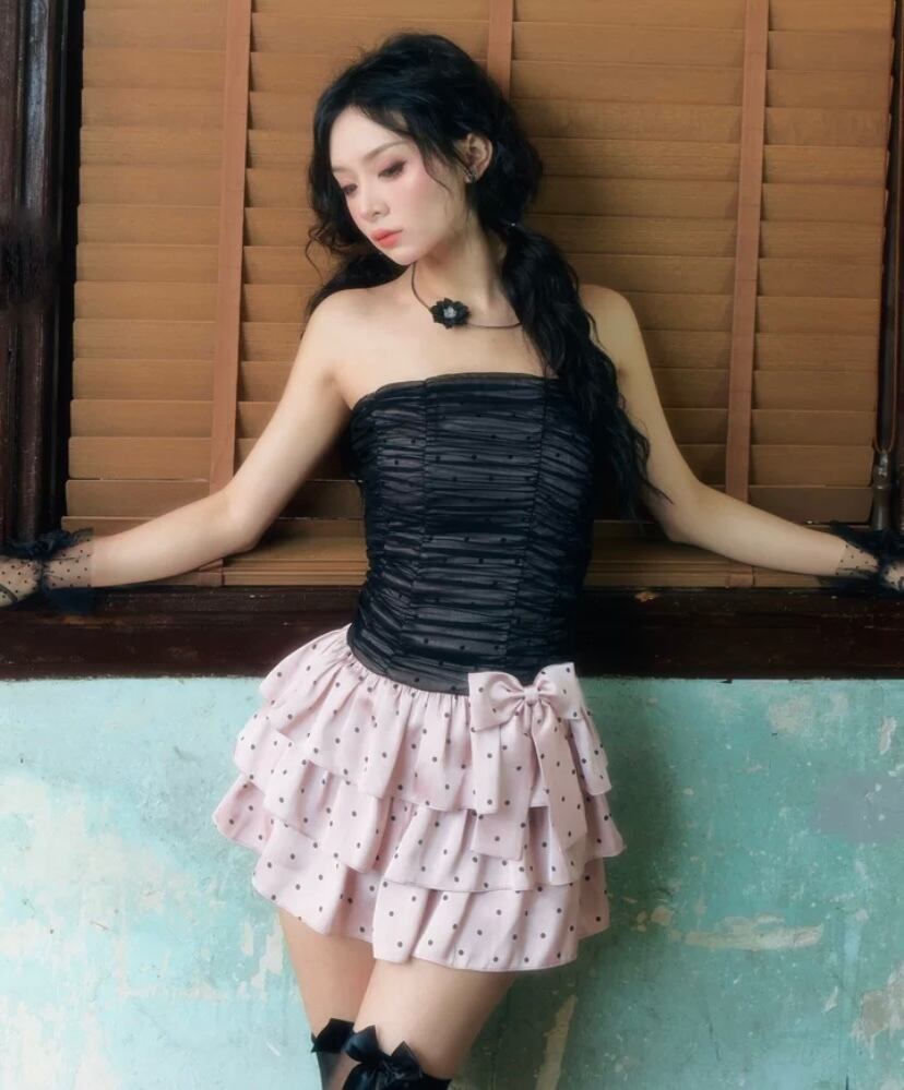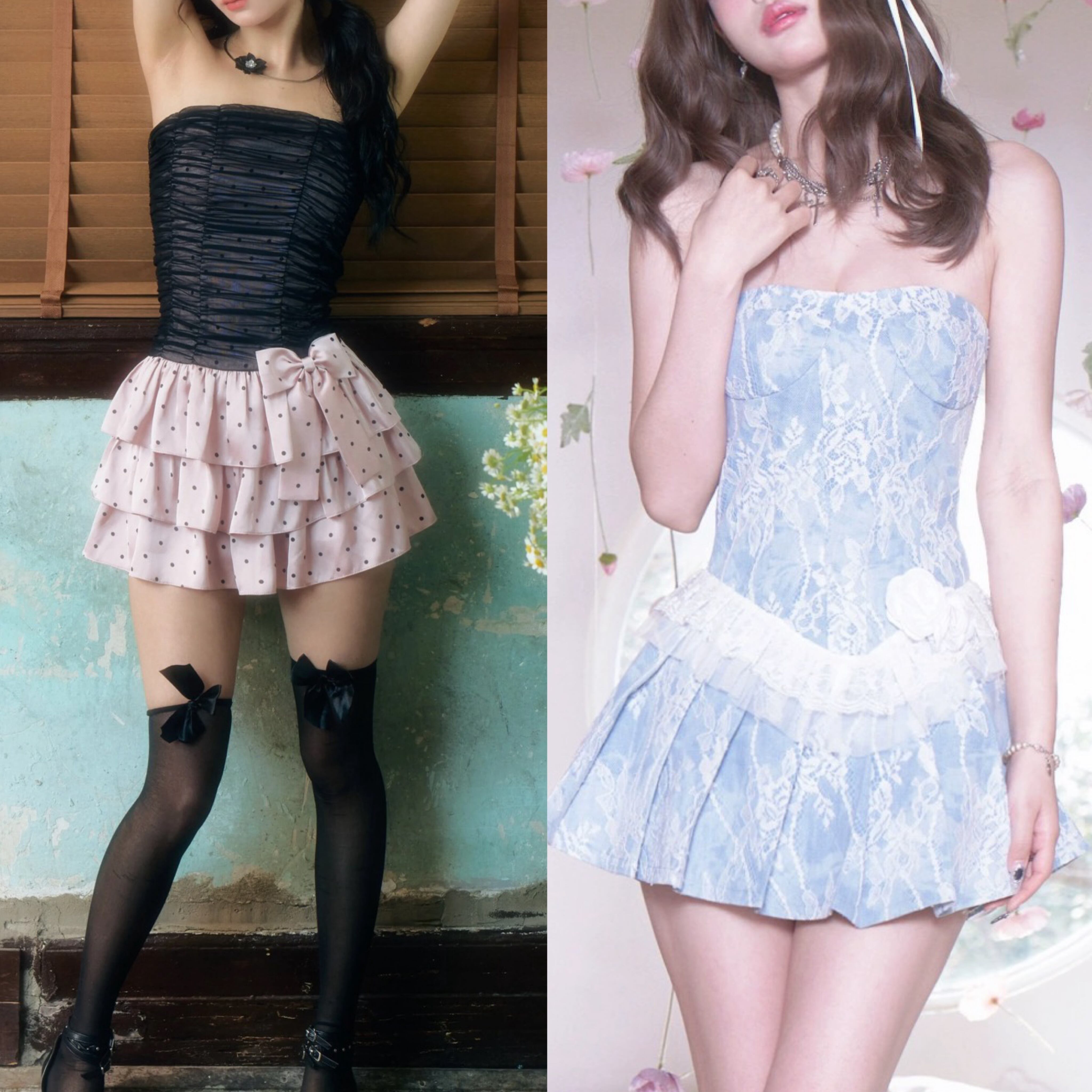 ベアトップ ワンピース ガーリー リボン 水色 レース ピンク ミニスカート