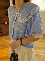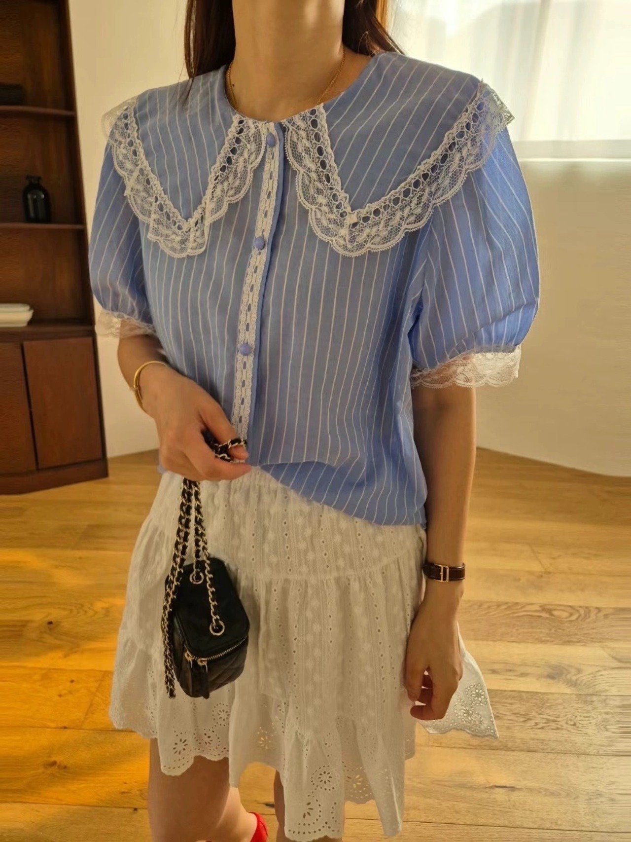 ボーダー ストライプ 黒 丸襟 可愛い ブラウス 水色 チェック