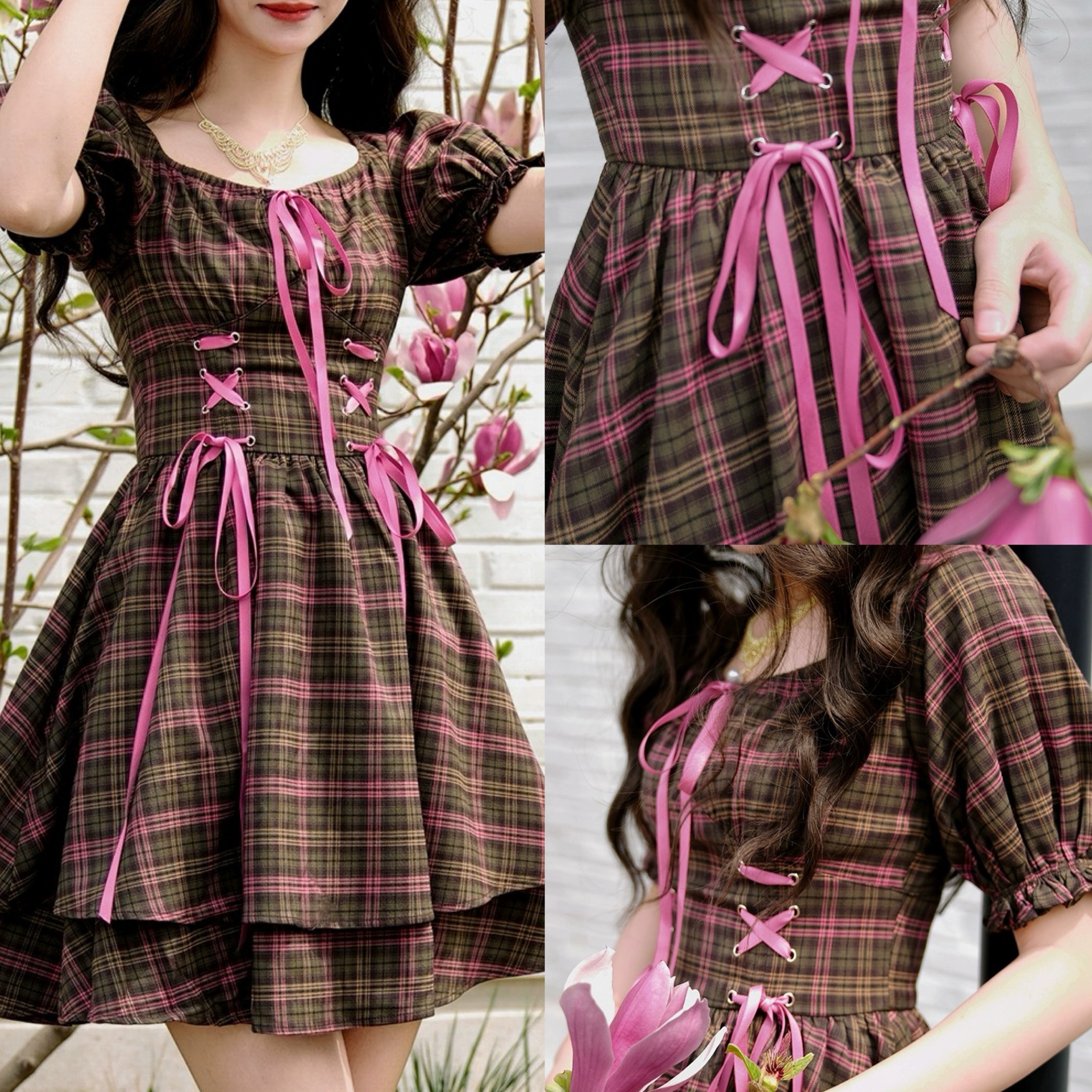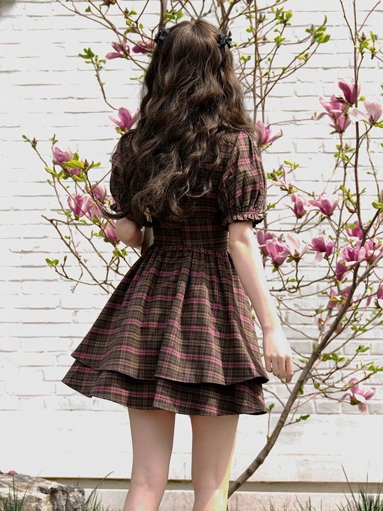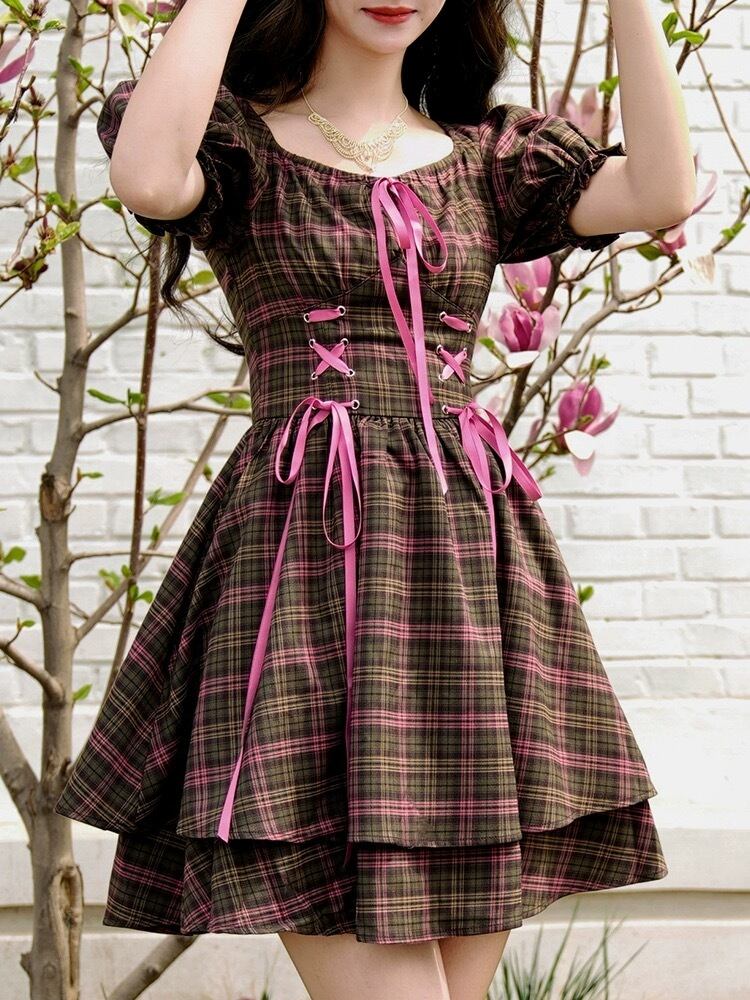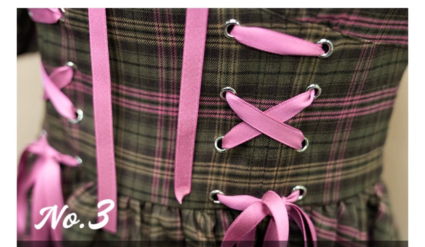 茶色 チェック リボン 紫 ガーリー 可愛い ワンピース