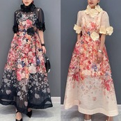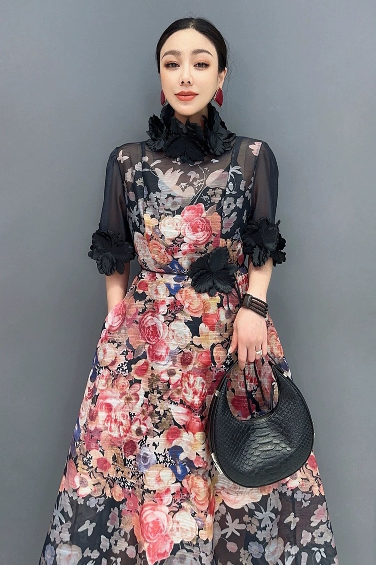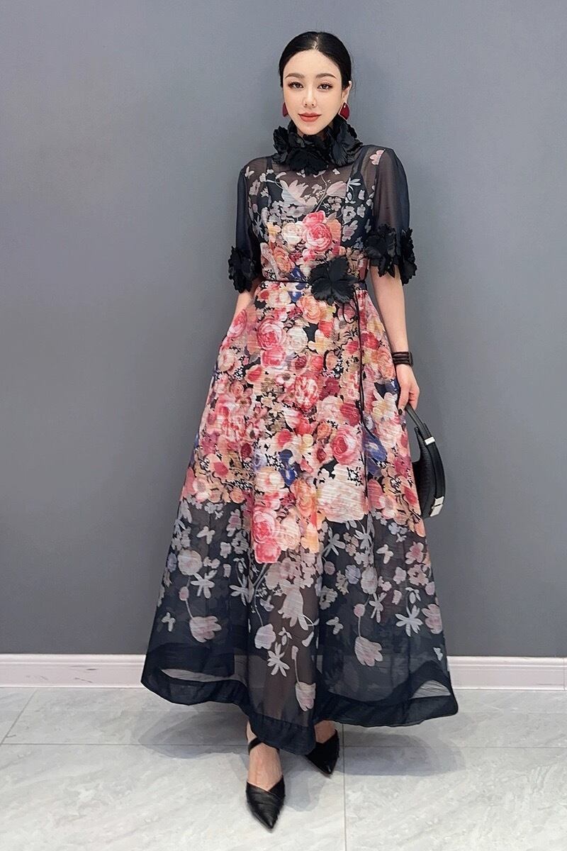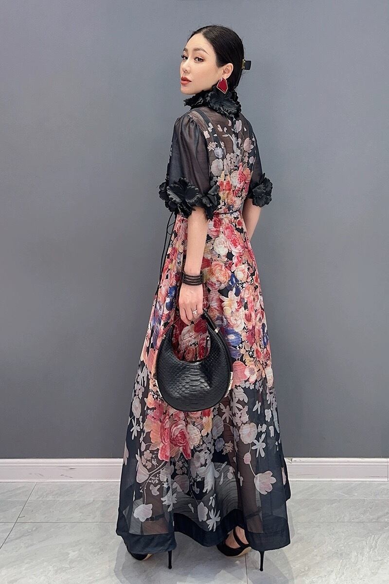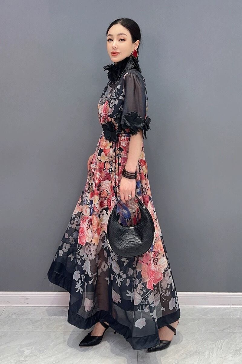 お花 フラワー 花柄 デコレーション 黒 ベージュ ハイネック ゴージャス エレガント