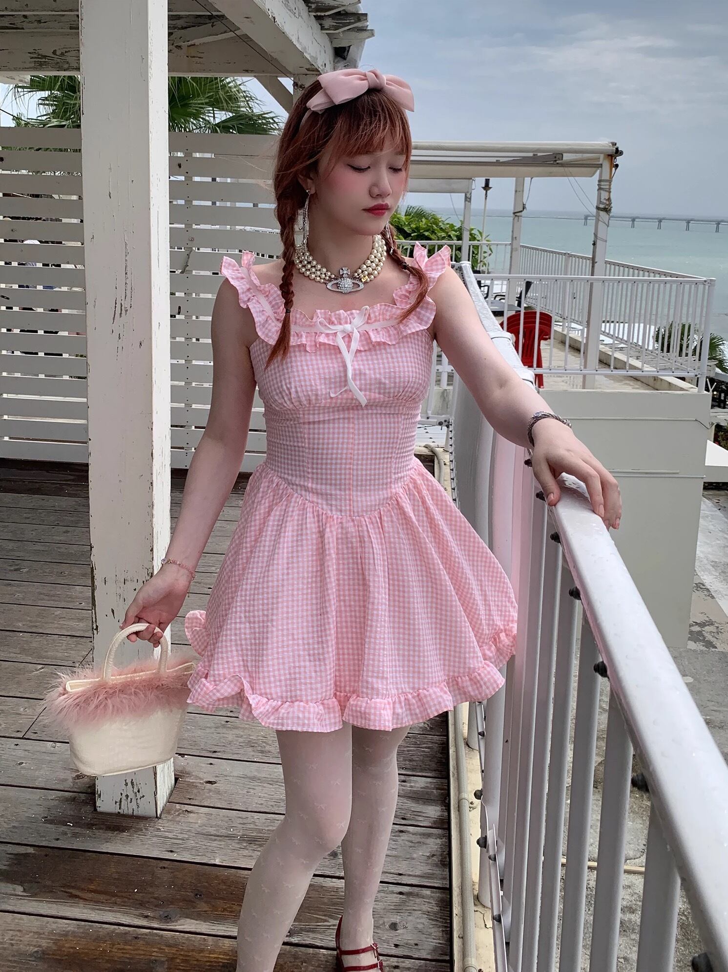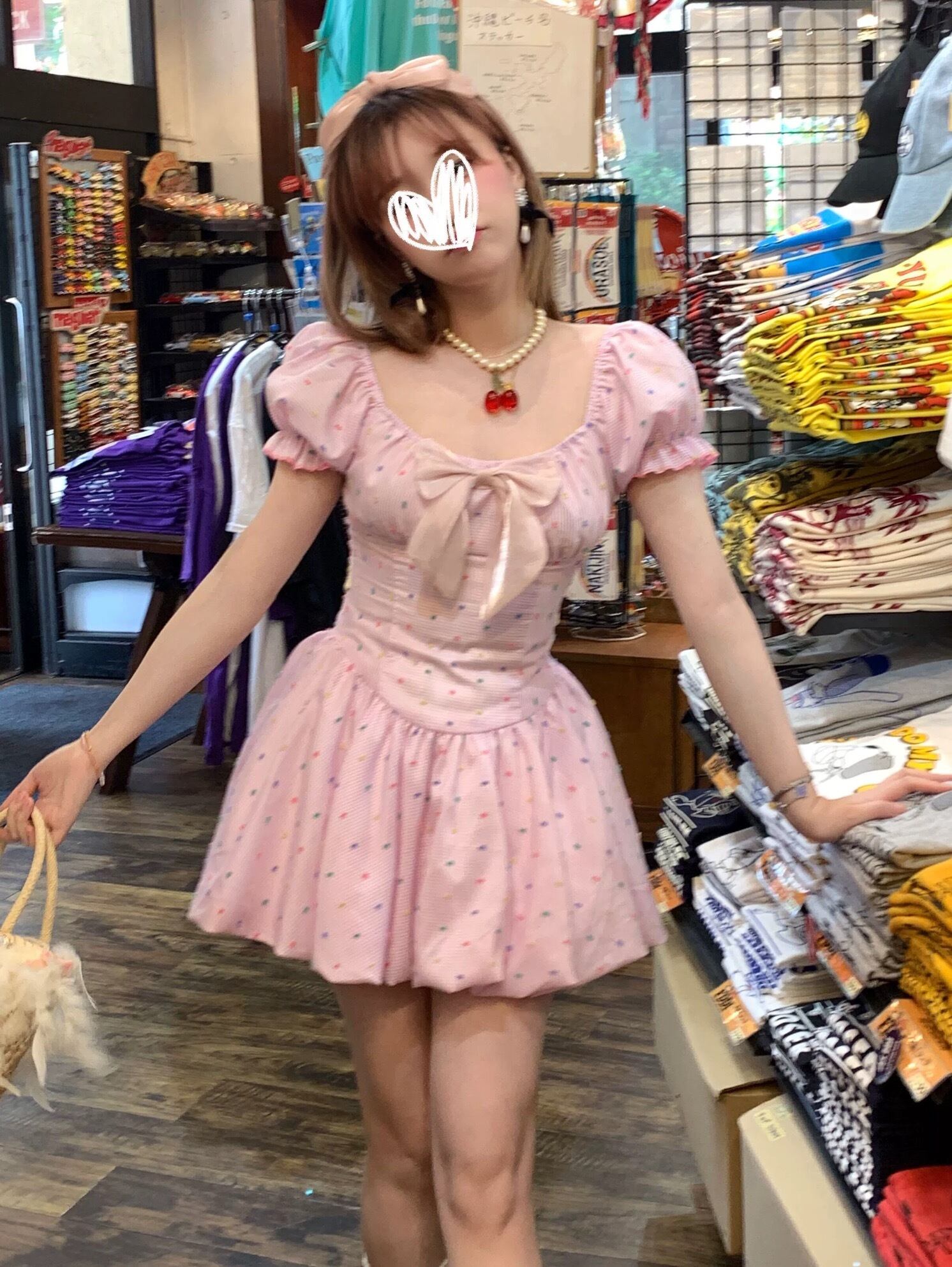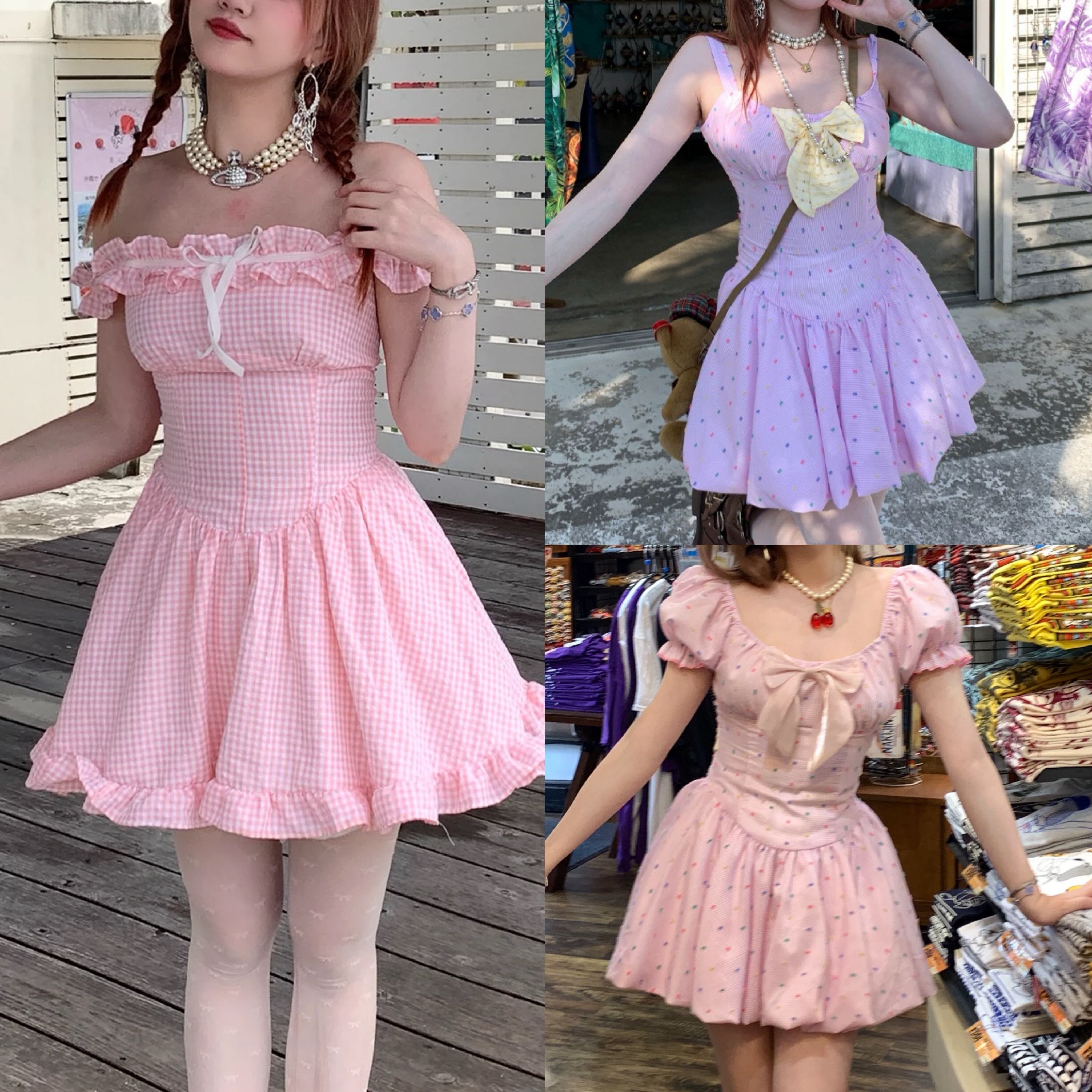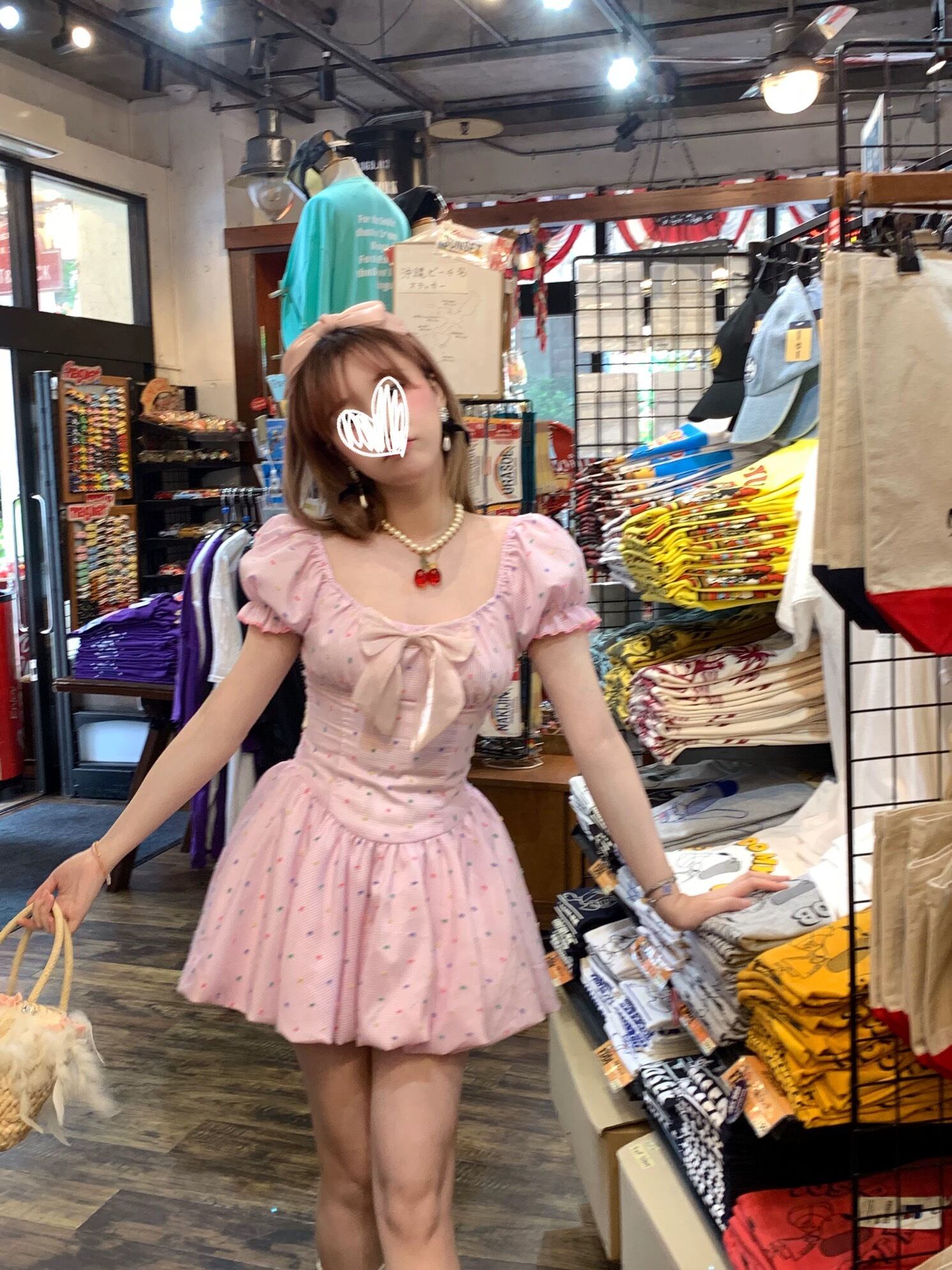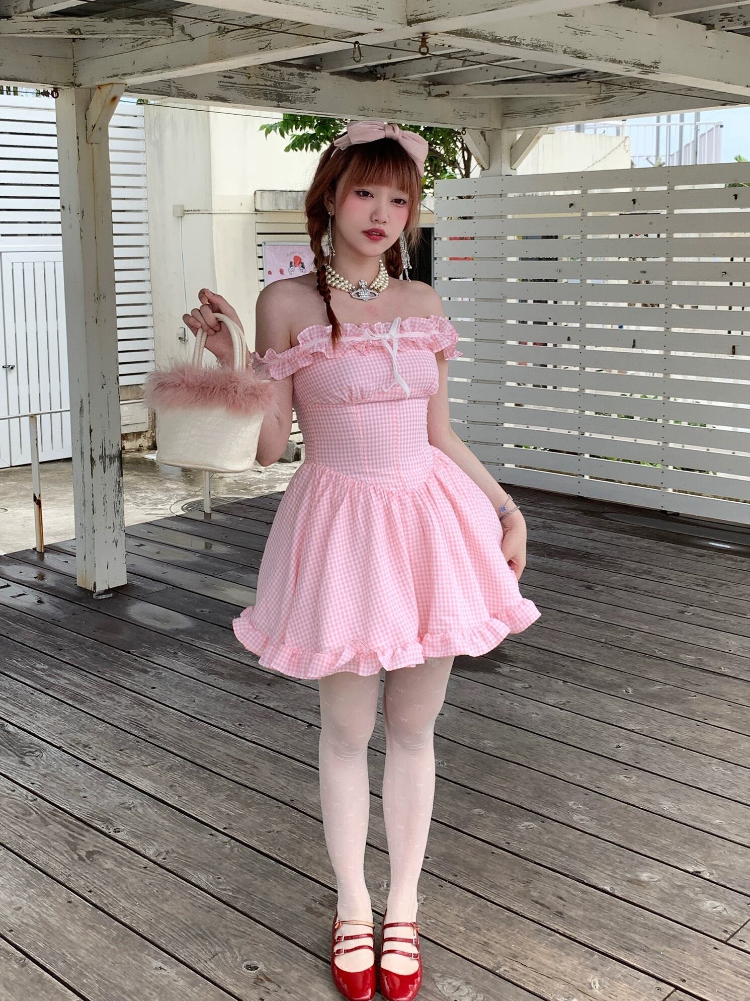 ピンク リボン チェック オフショルダー ガーリー 可愛い リボン 黄色