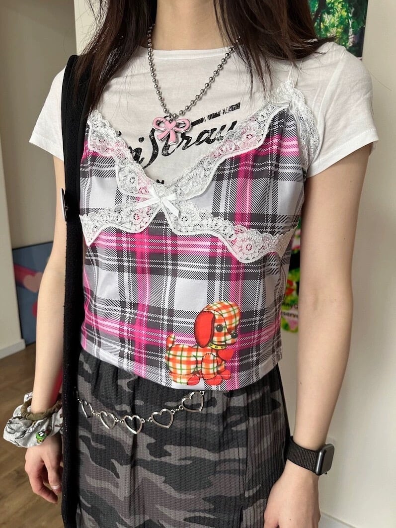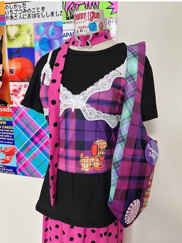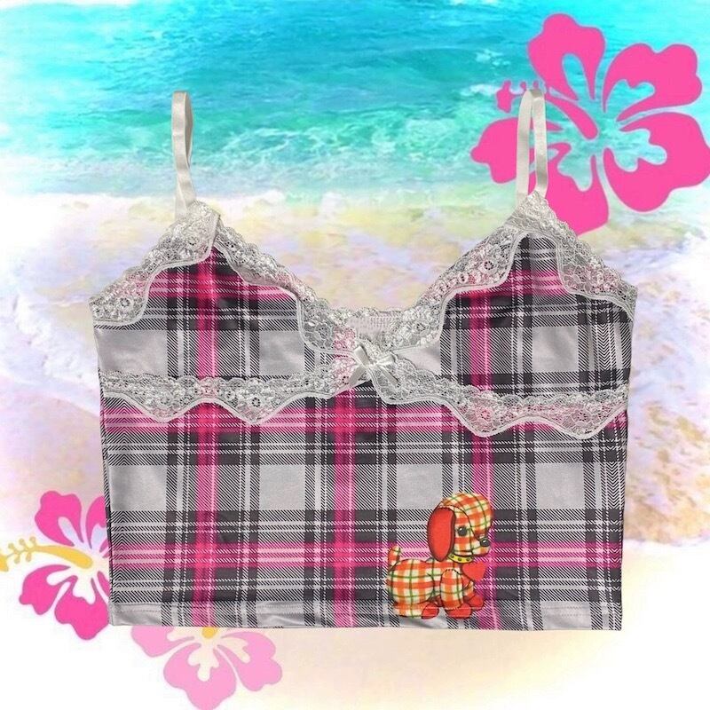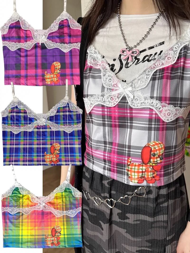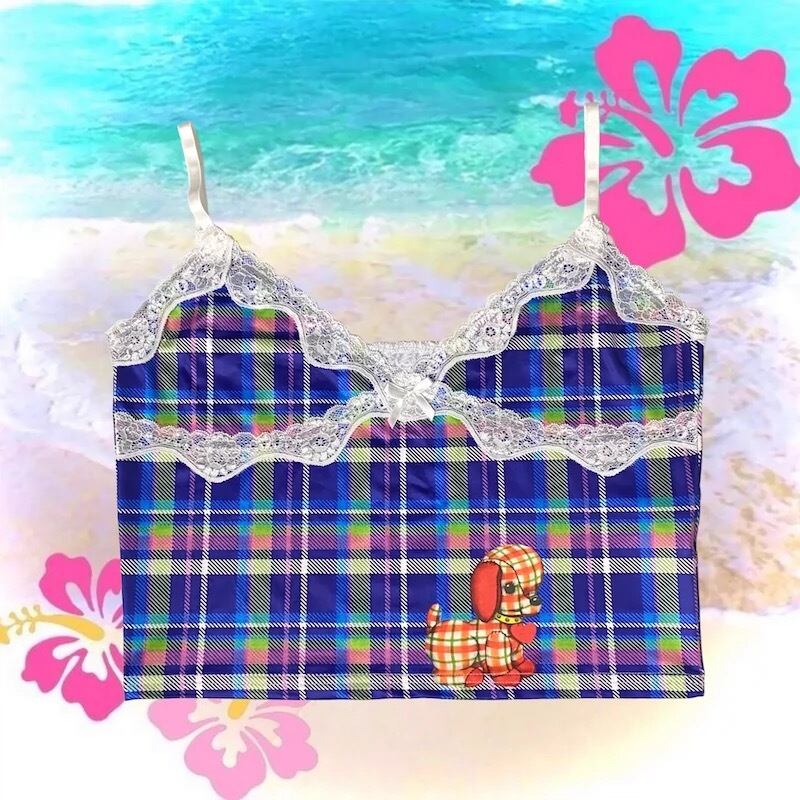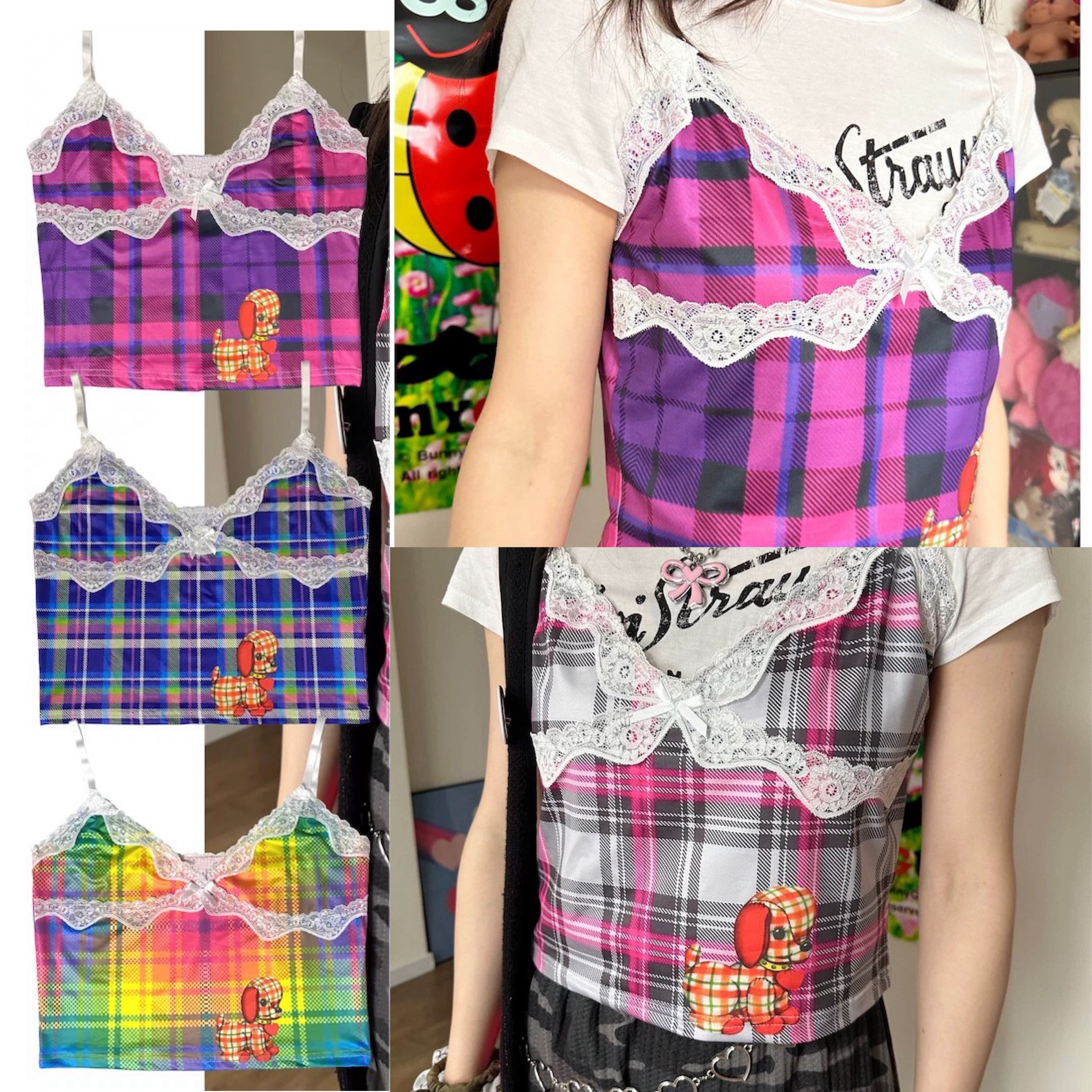 カラフル 紫 ピンク ブルー チェック キャミソール トップス ブルー 虹 レインボー