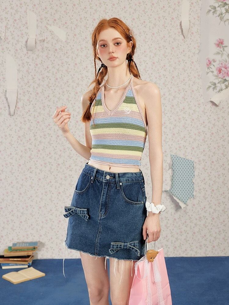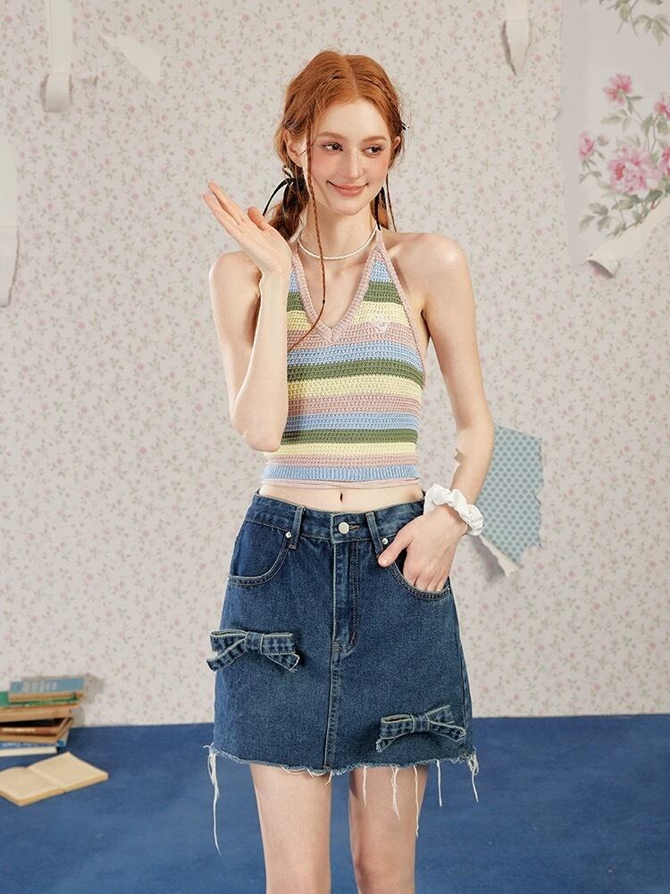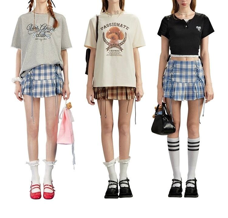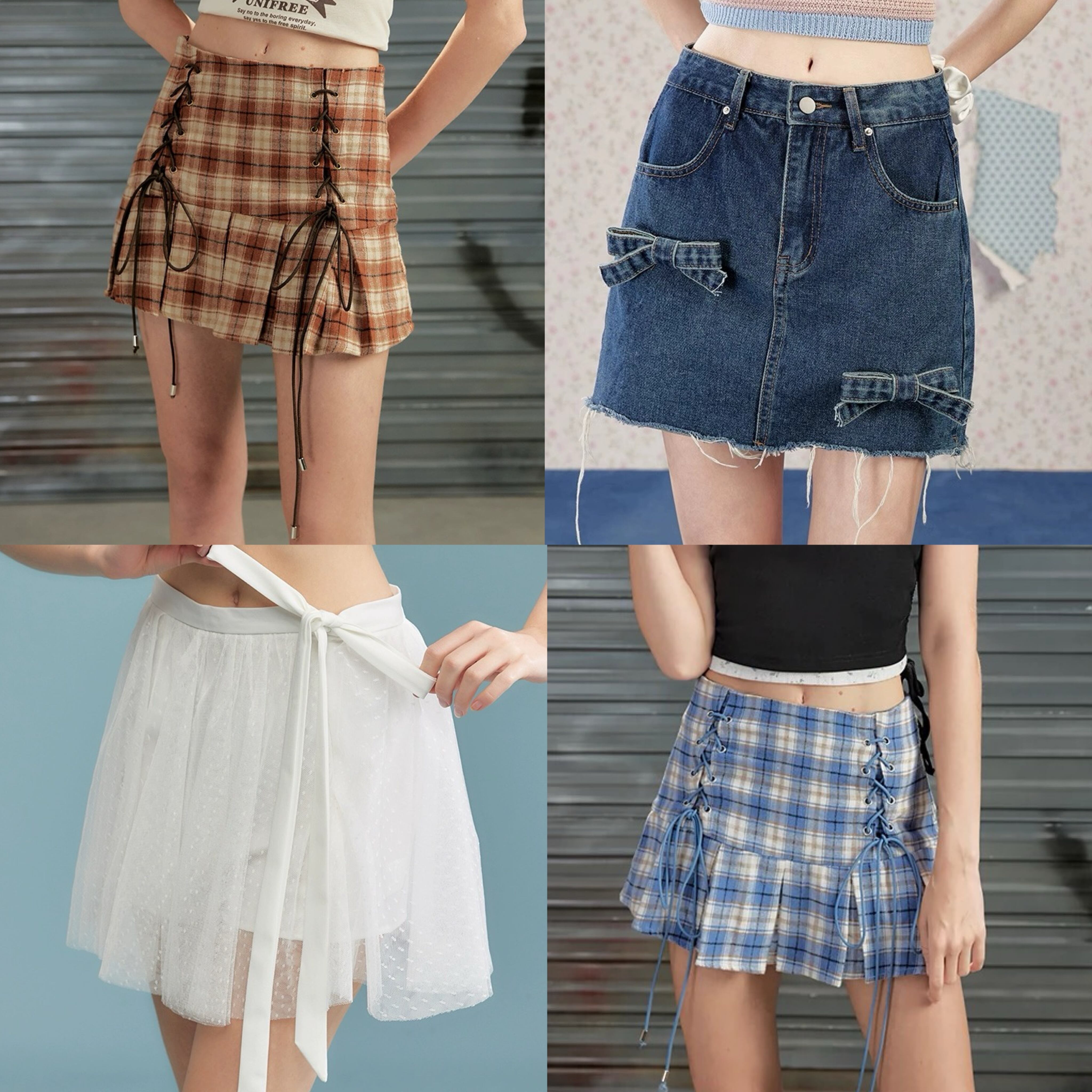 チェック 水色 黄色 ミニスカート 白 ホワイト ボトムス プリーツ デニム