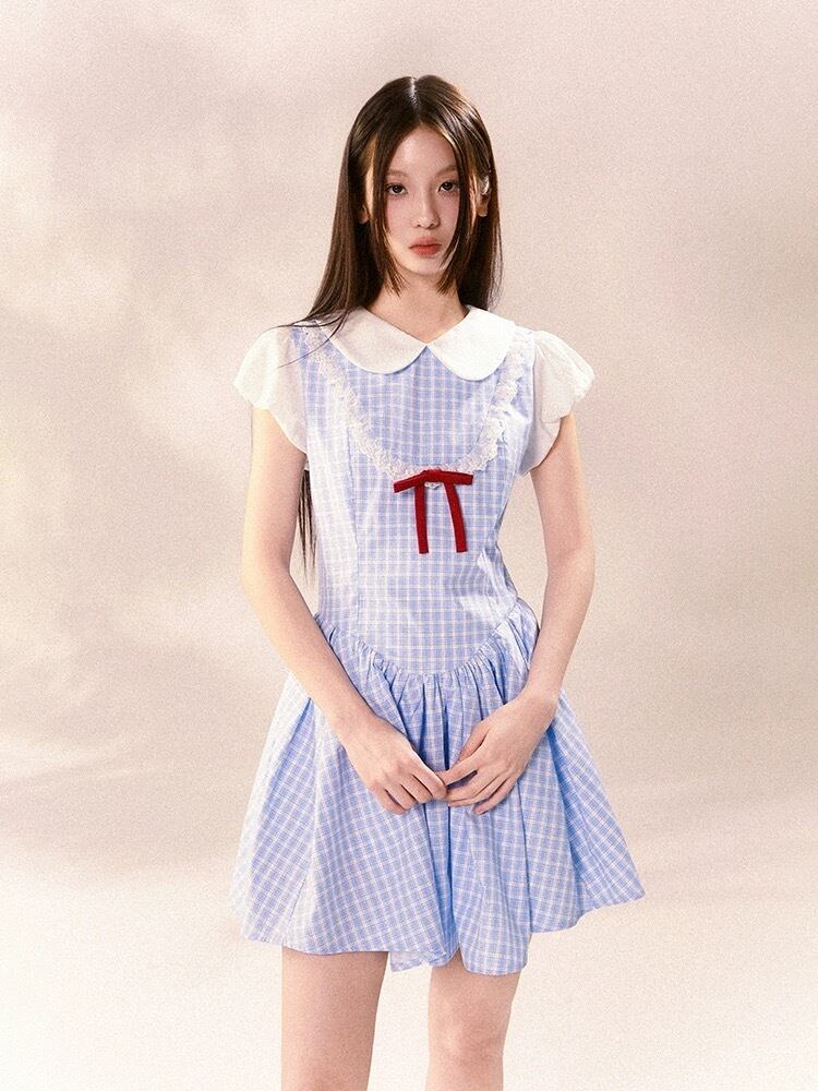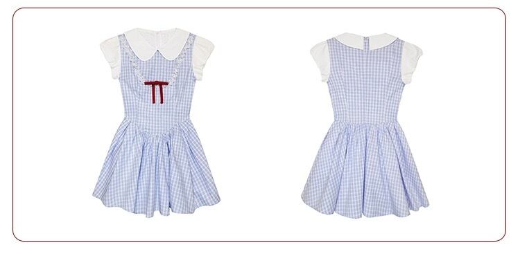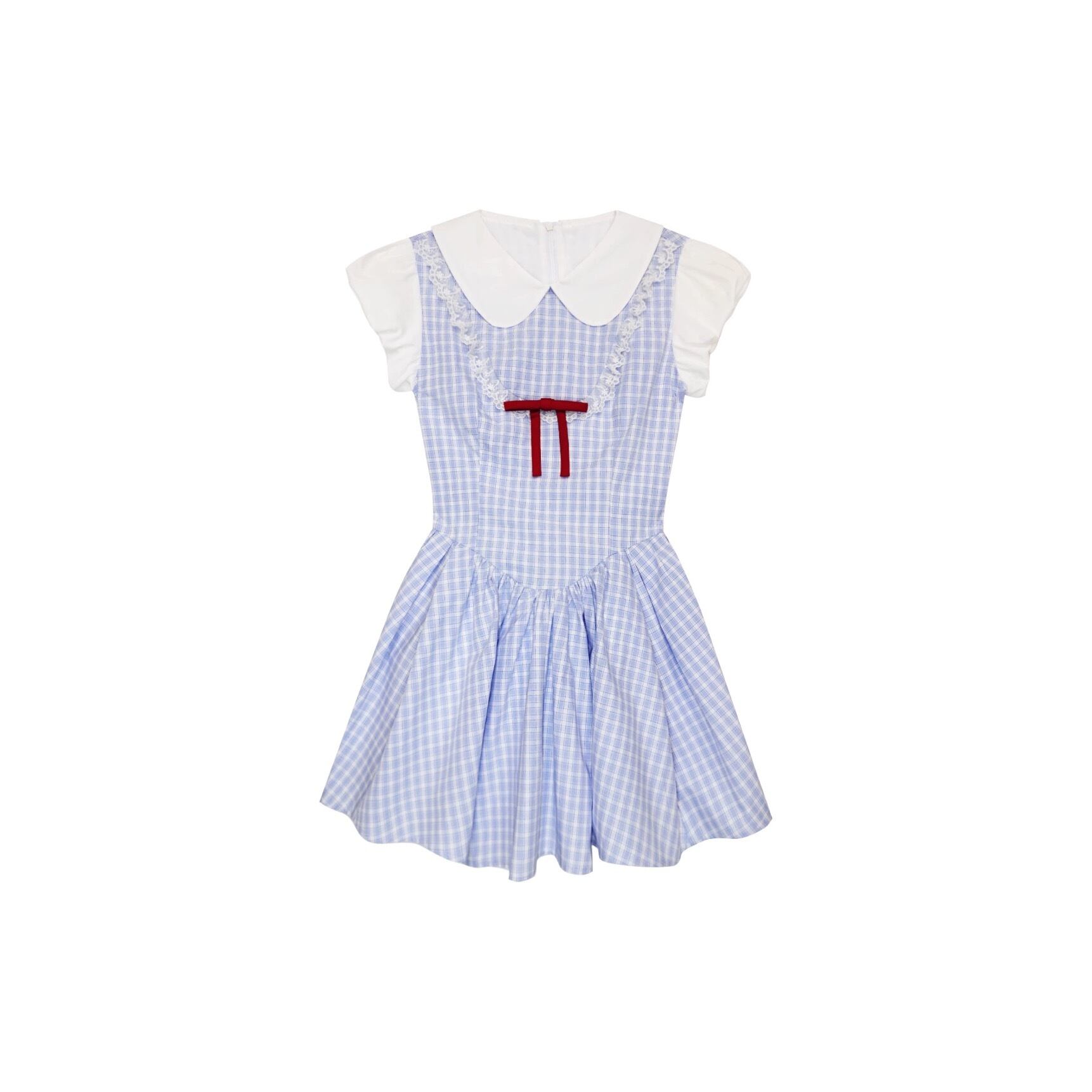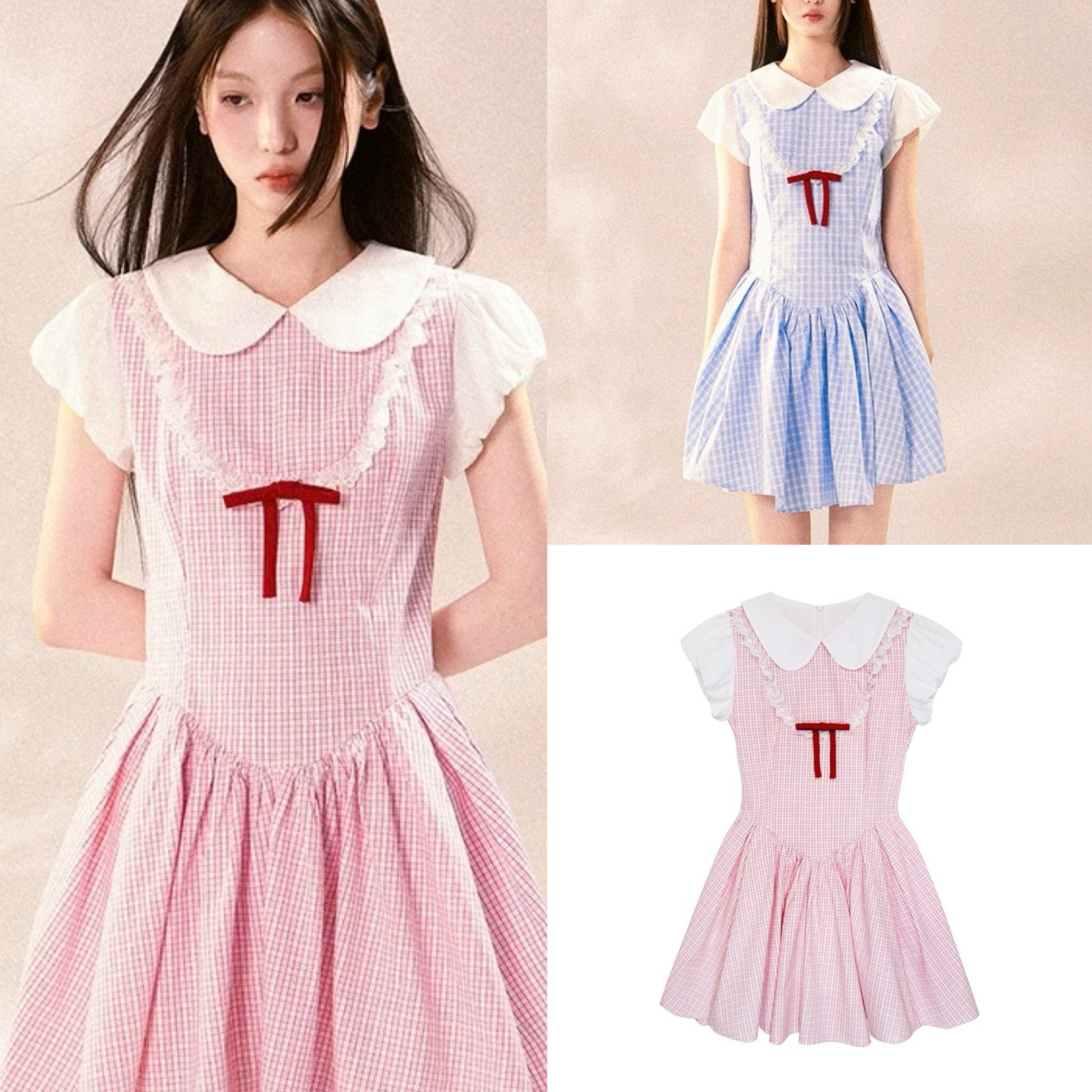 水色 ピンク 半袖 ブラウス 丸襟 ガーリー 可愛い リボン ワンピース