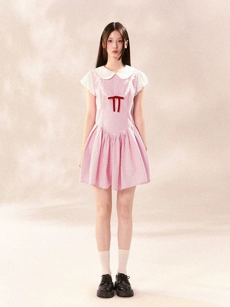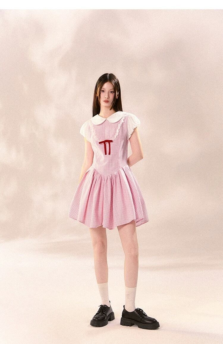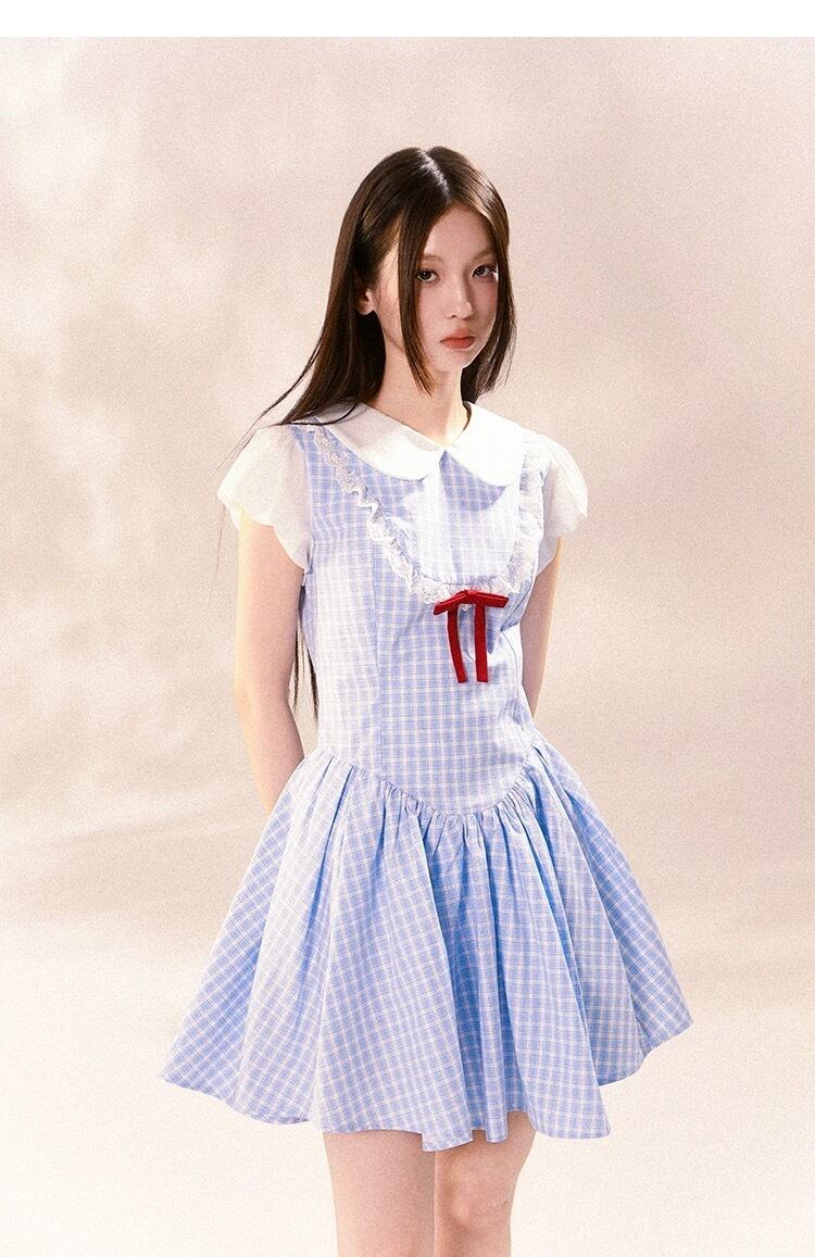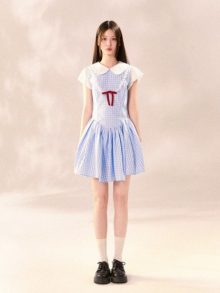 水色 ピンク 半袖 ブラウス 丸襟 ガーリー 可愛い リボン ワンピース