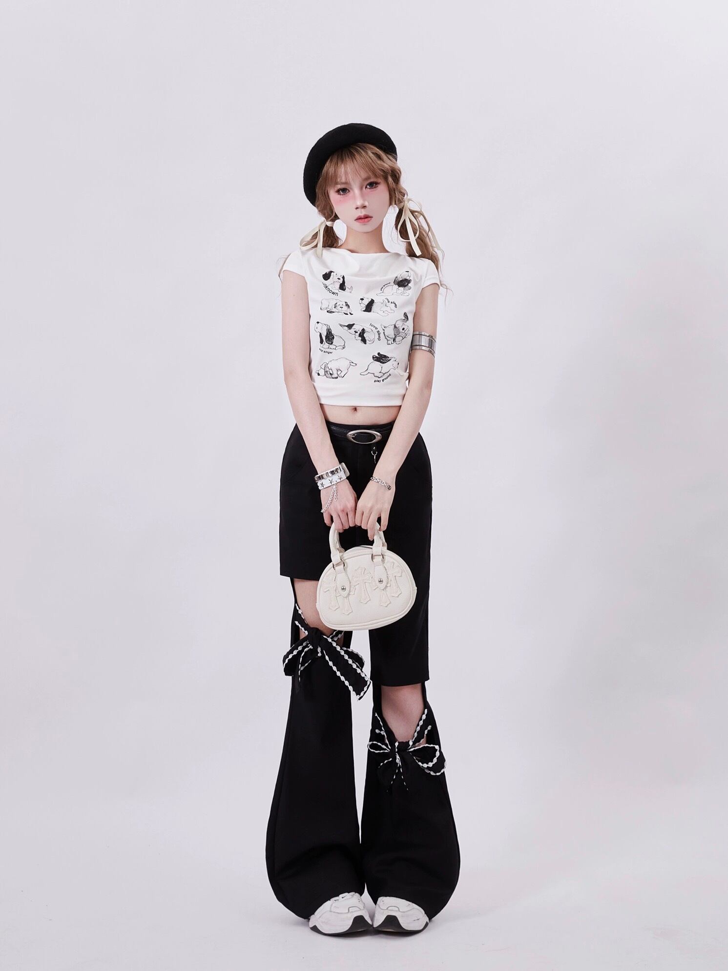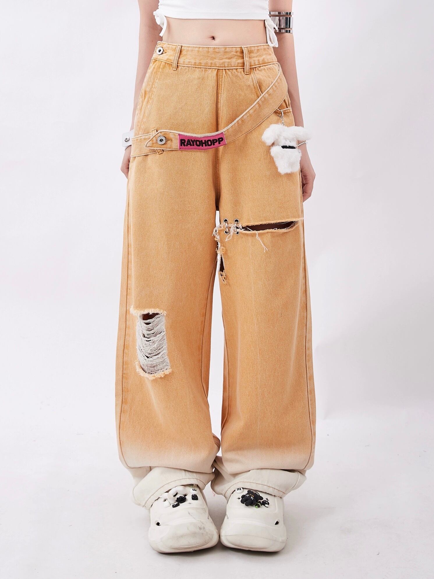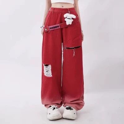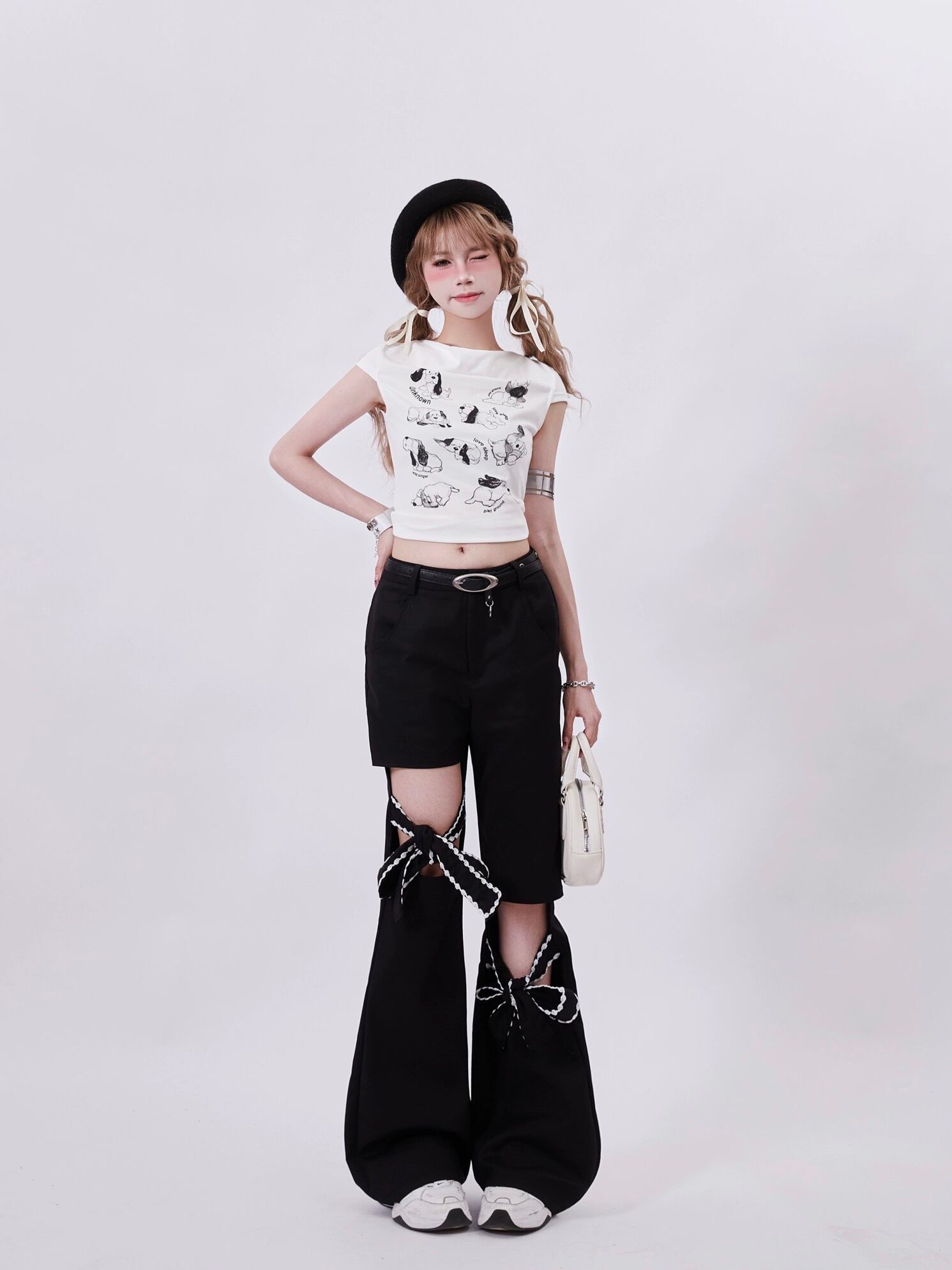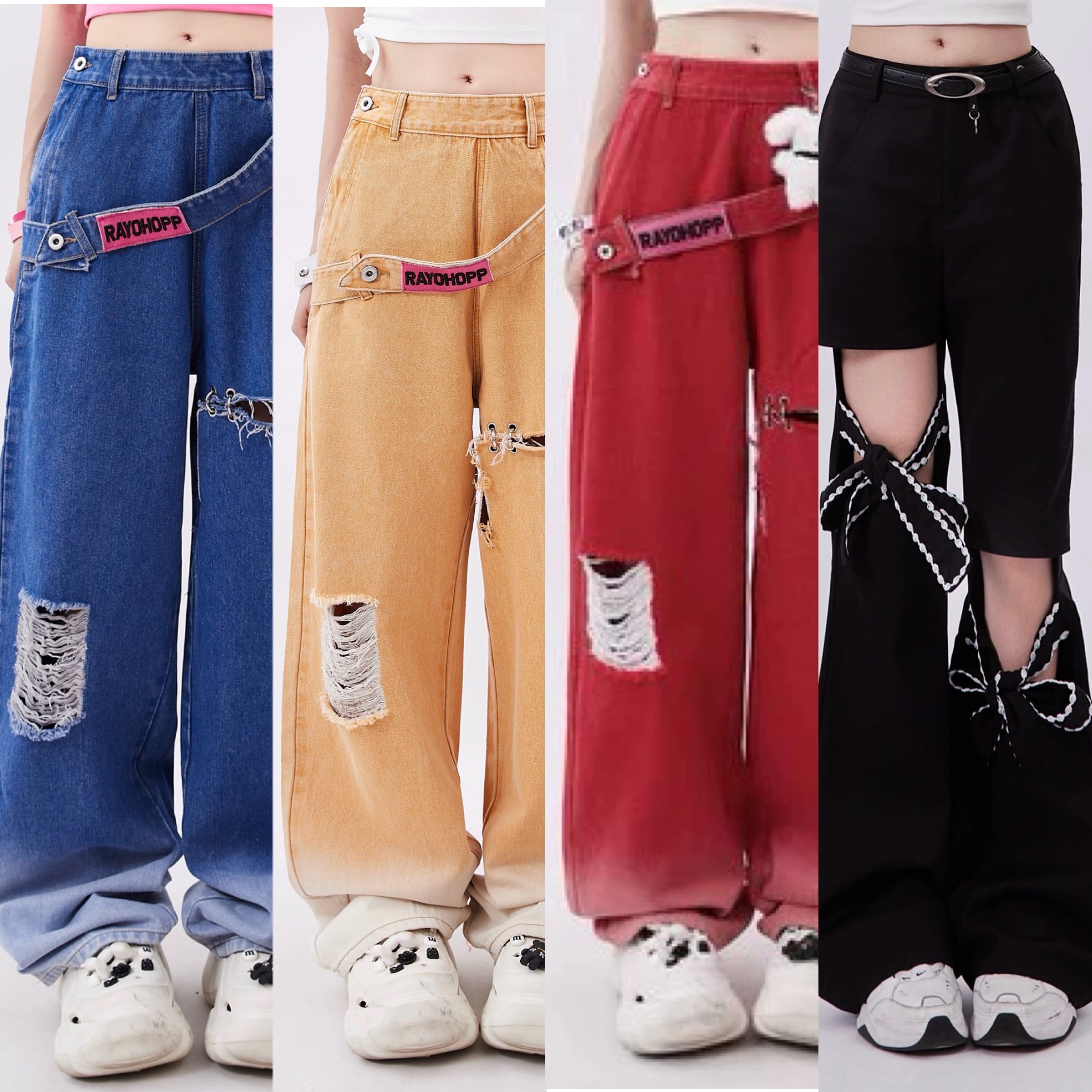 黒 リボン 黄色 赤 青 パンツ スウェット カジュアル ダメージ