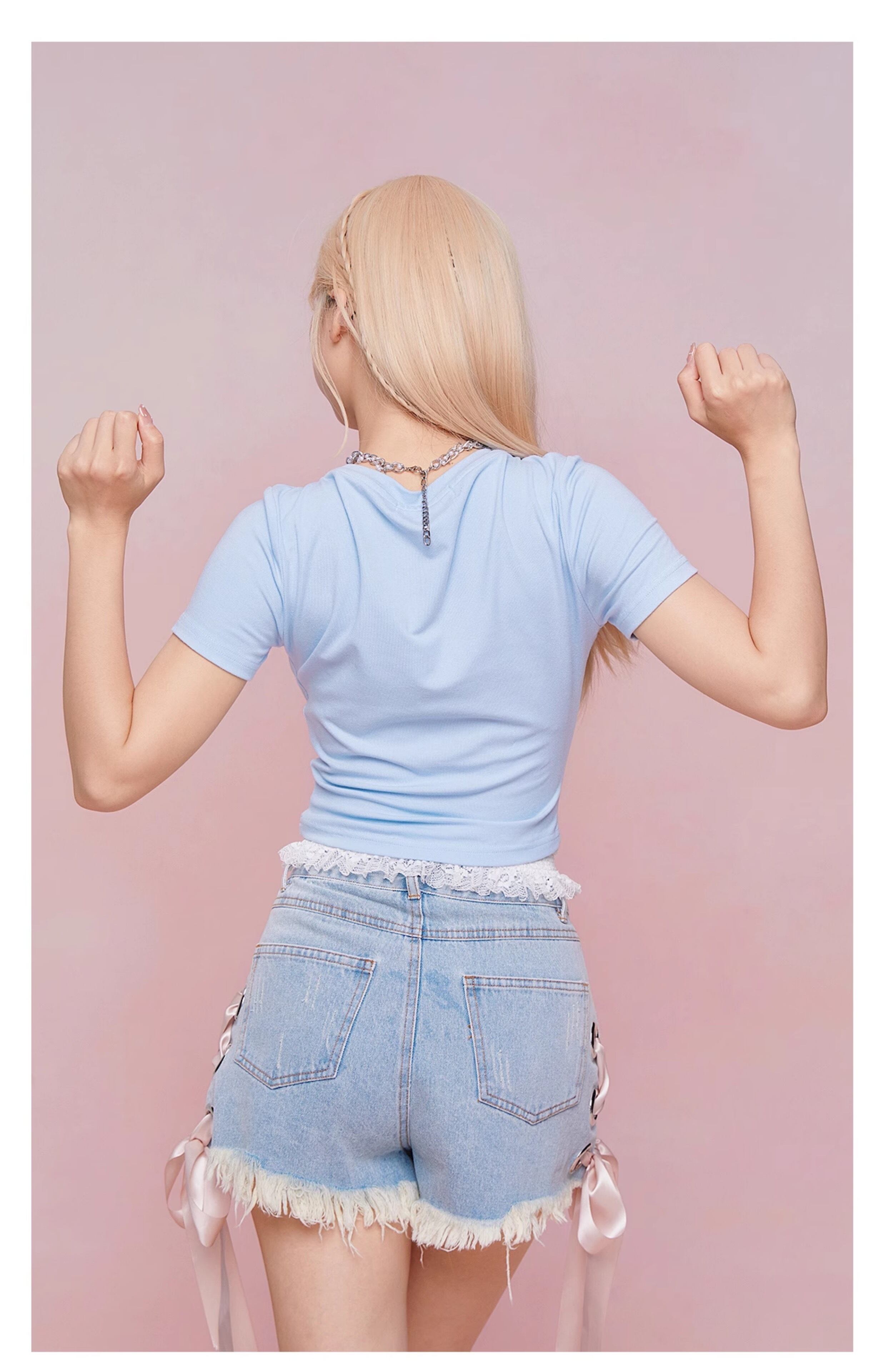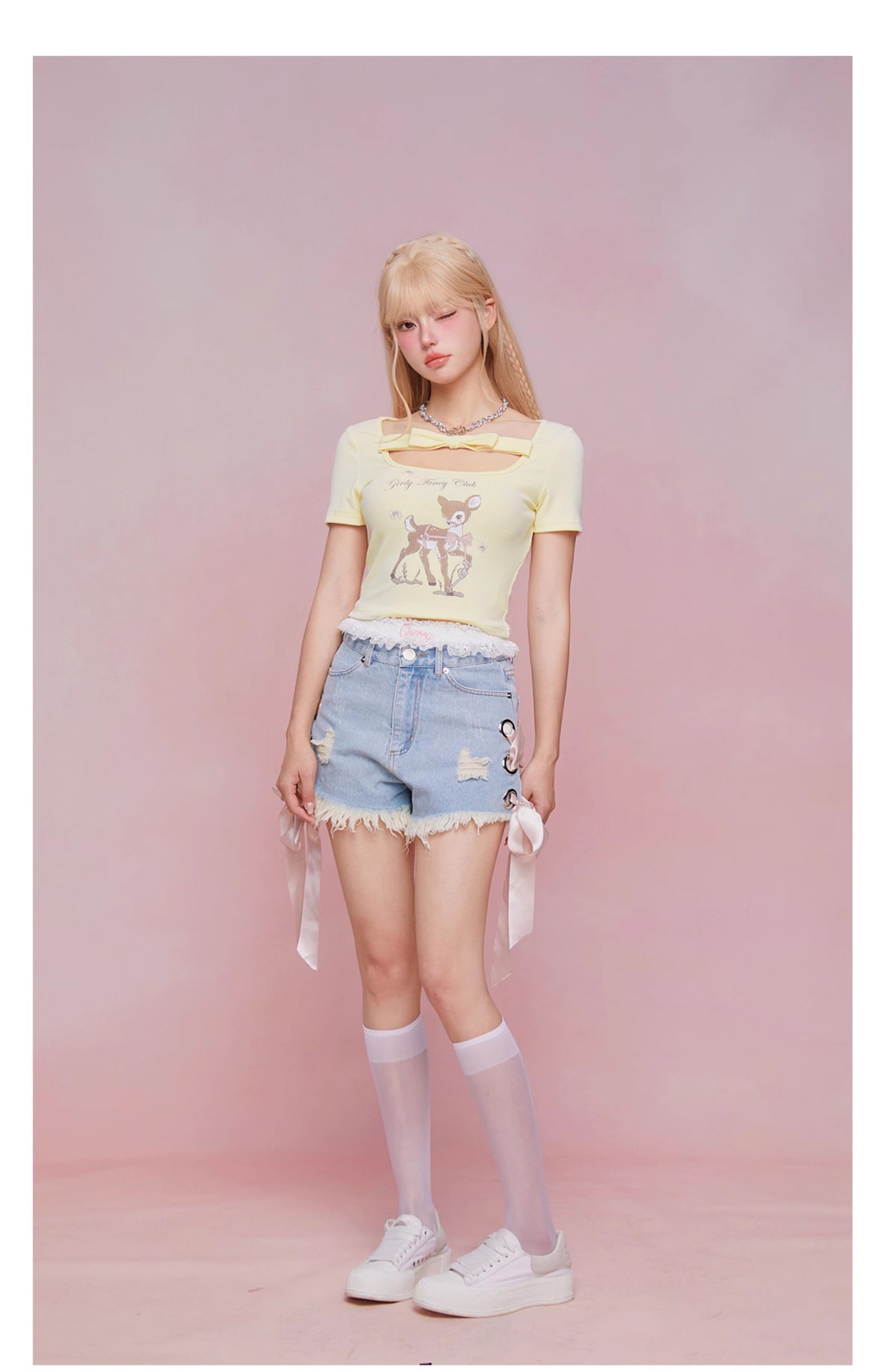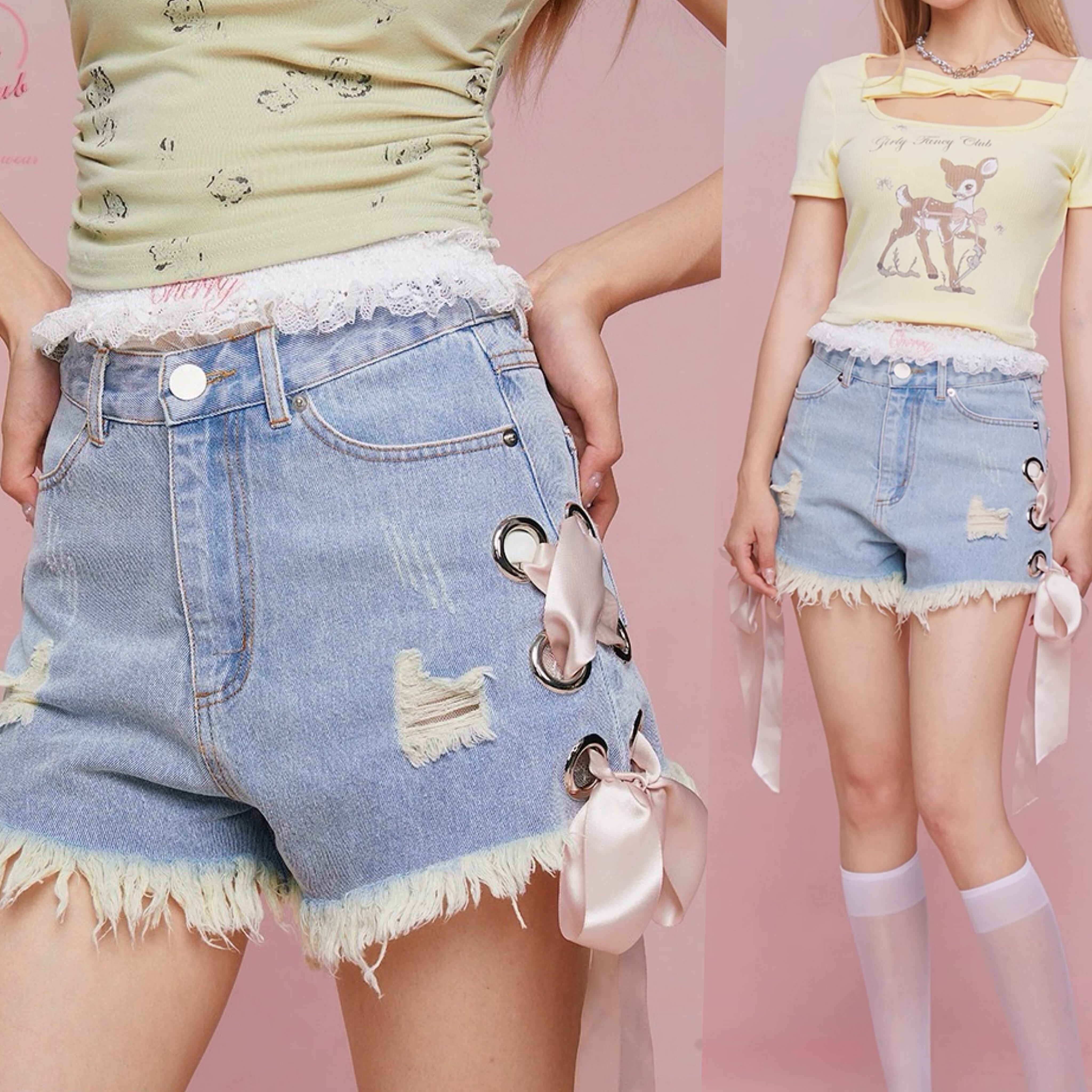 デニム ショートパンツ リボン ピンク カジュアル ボトムス