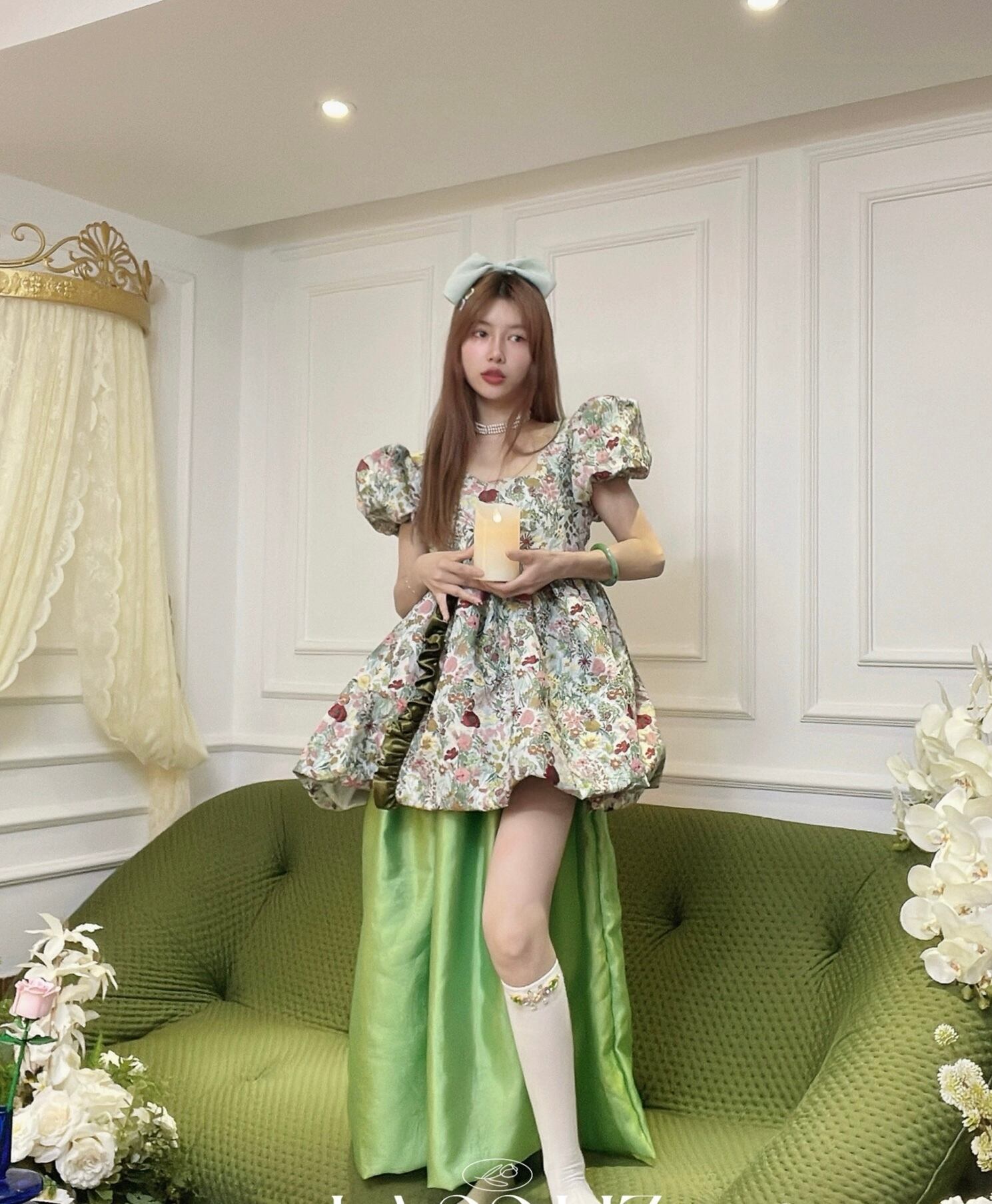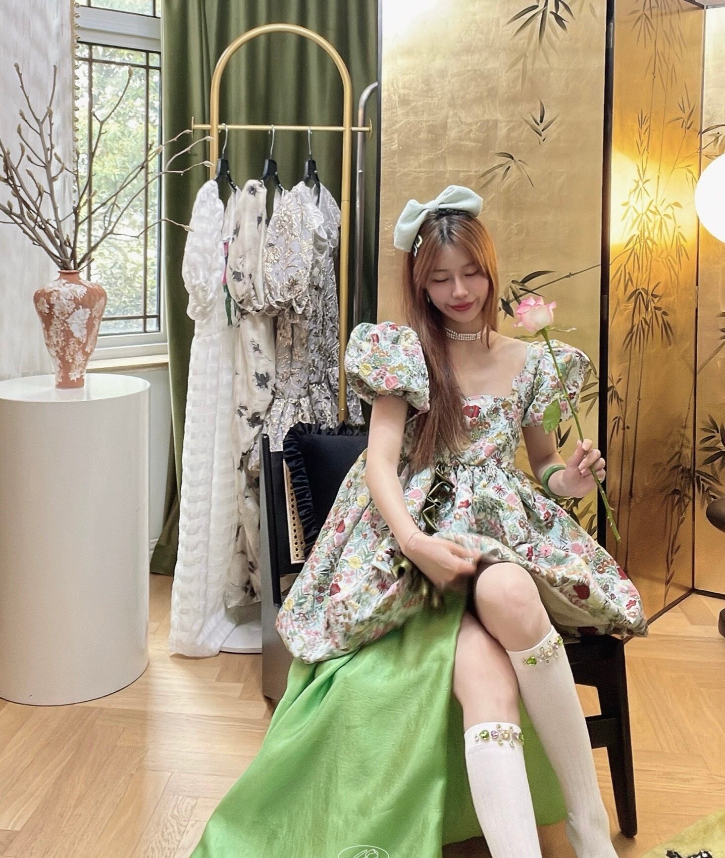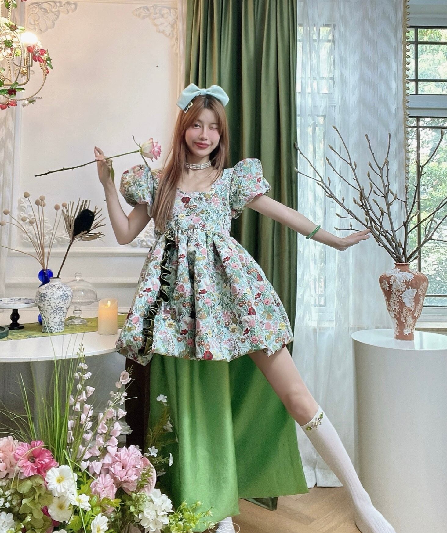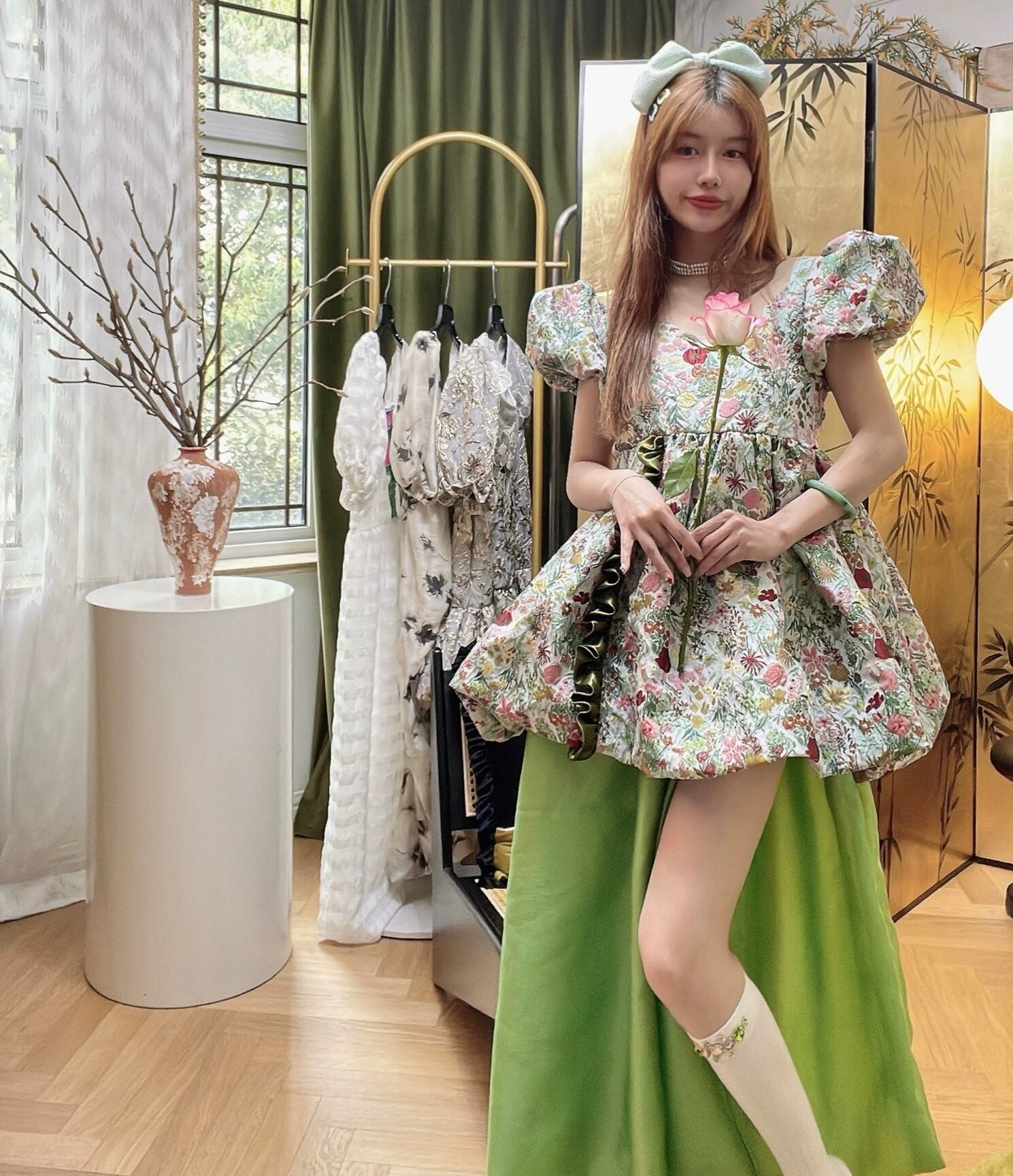 緑 花柄 フラワー ガーリー ブラウス ワンピース ドレス