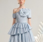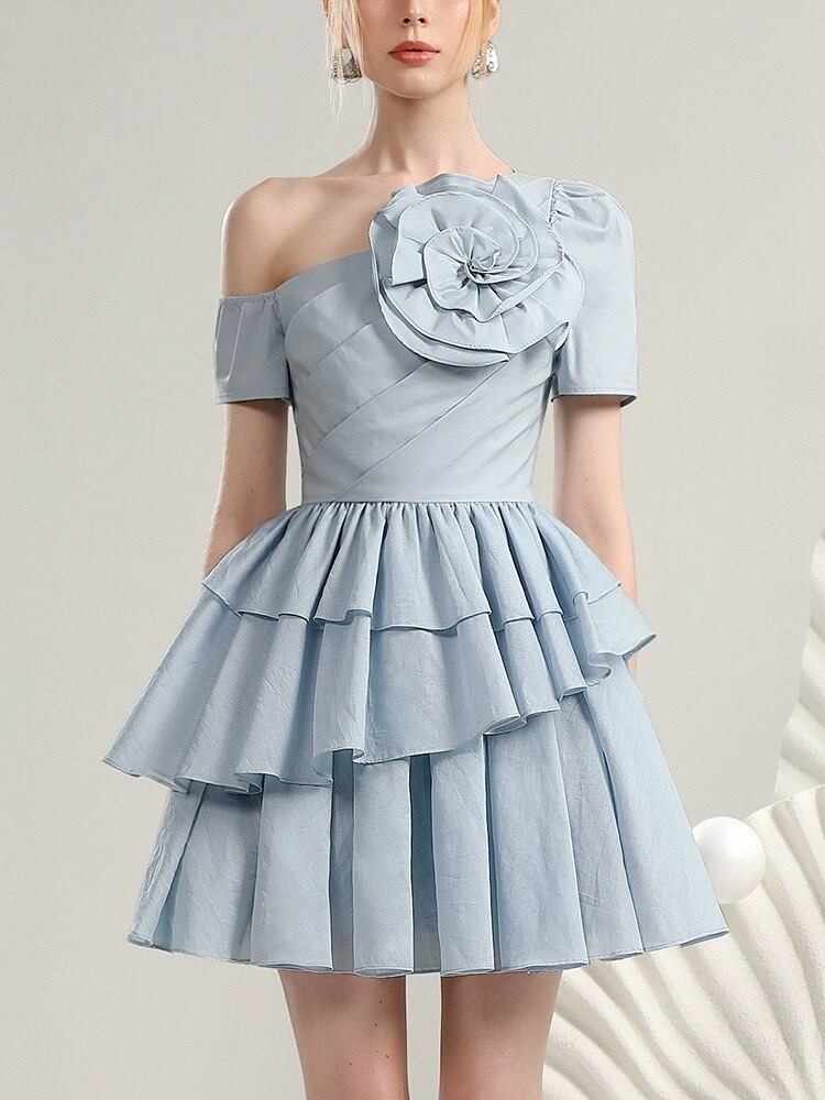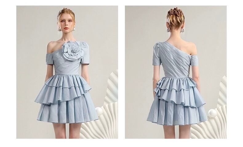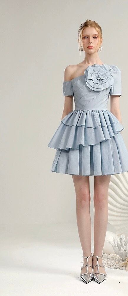 水色 オフショルダー ワンピース カメリア 薔薇 スカート ドレス