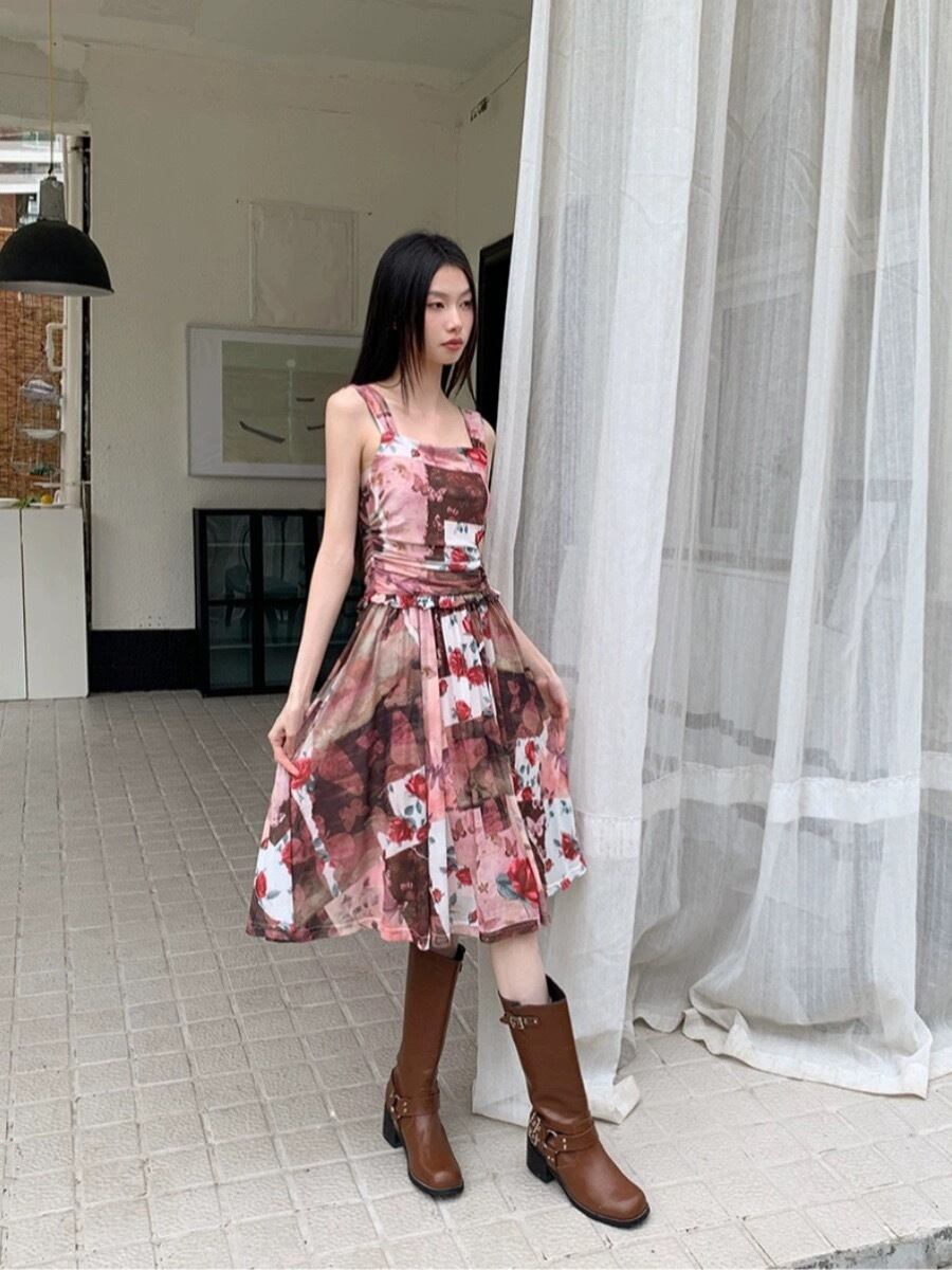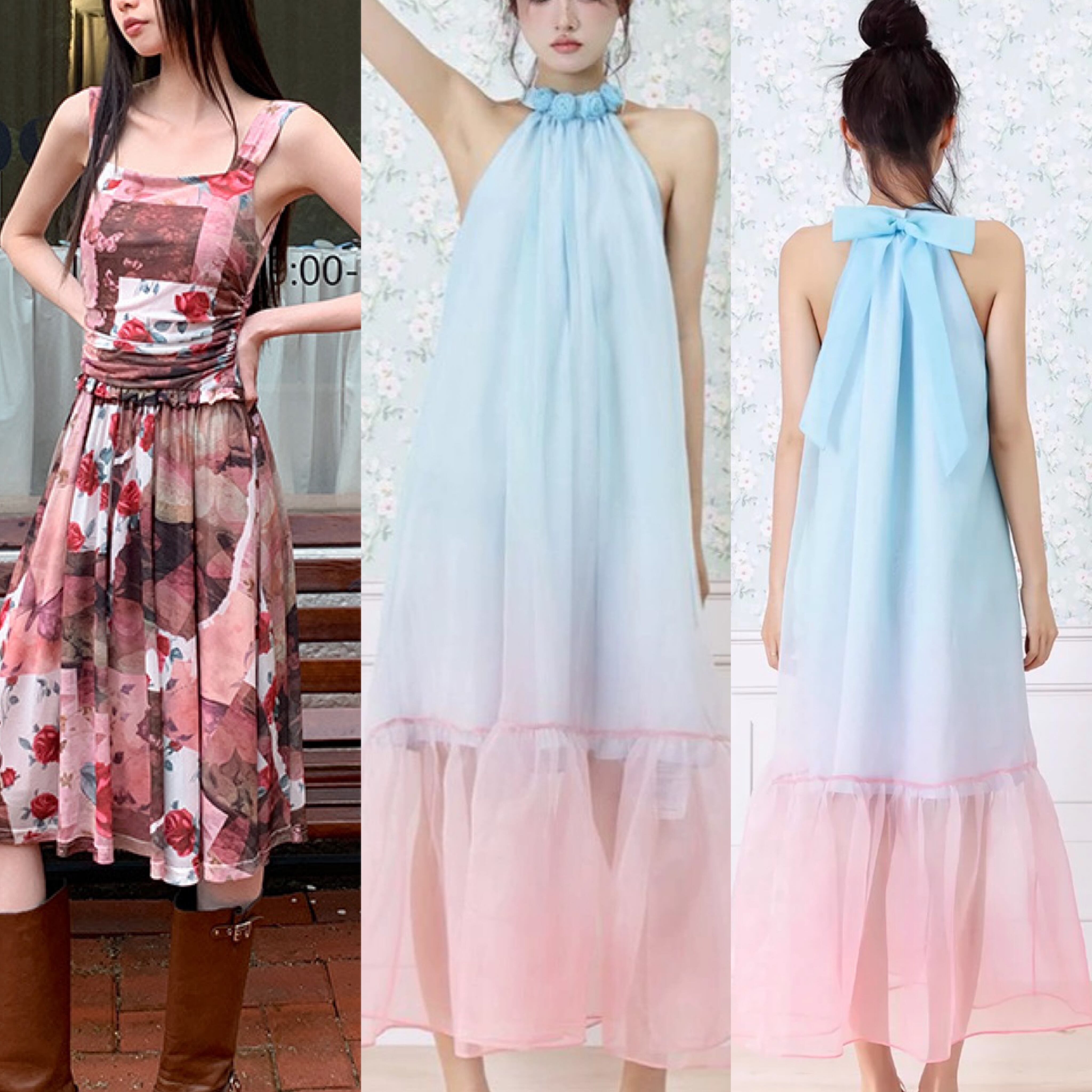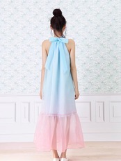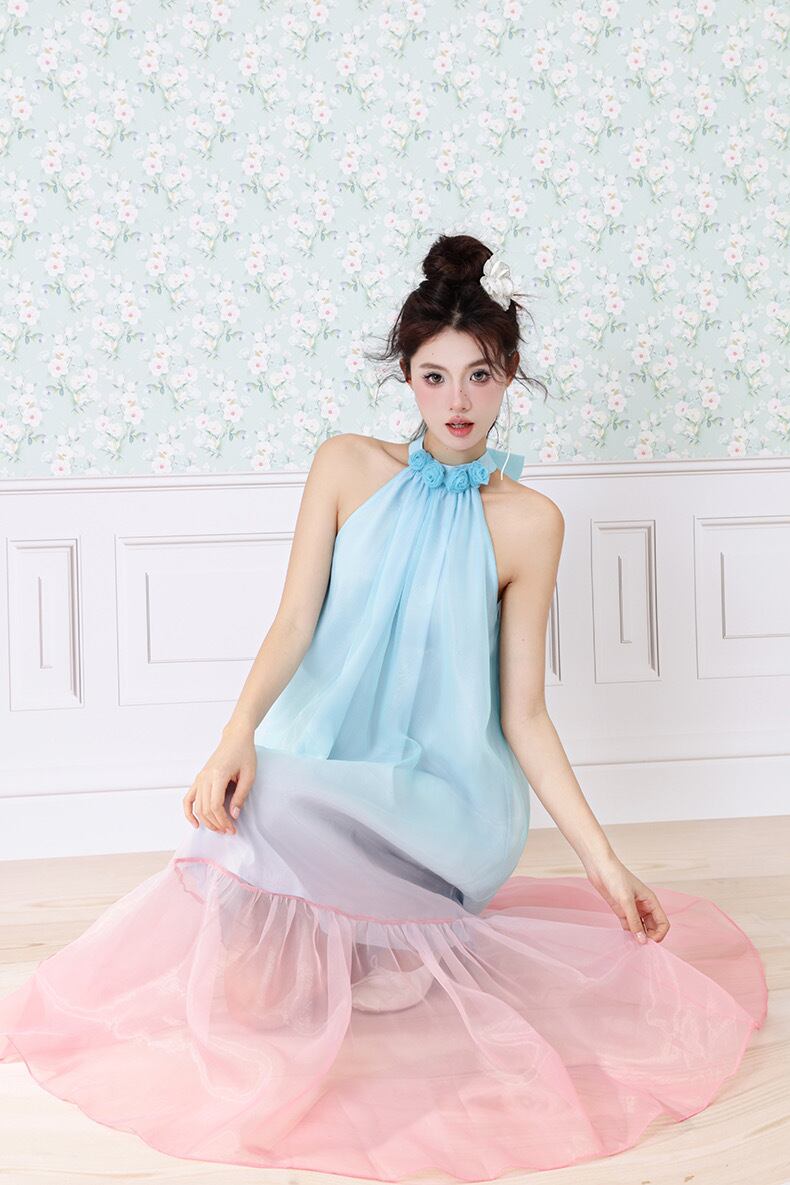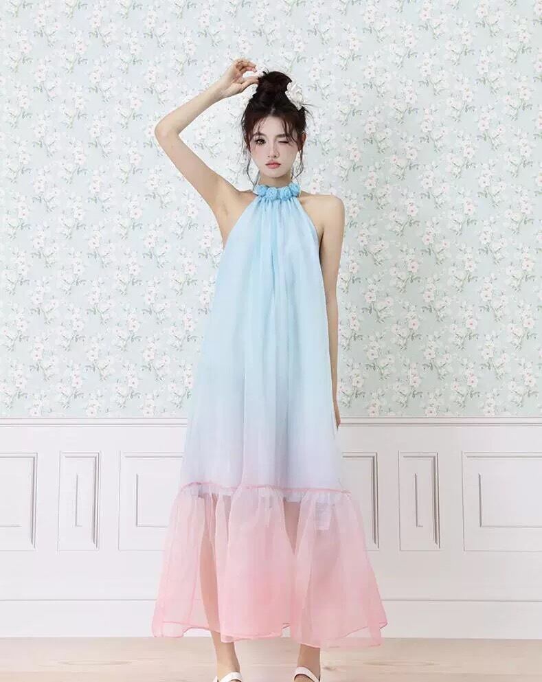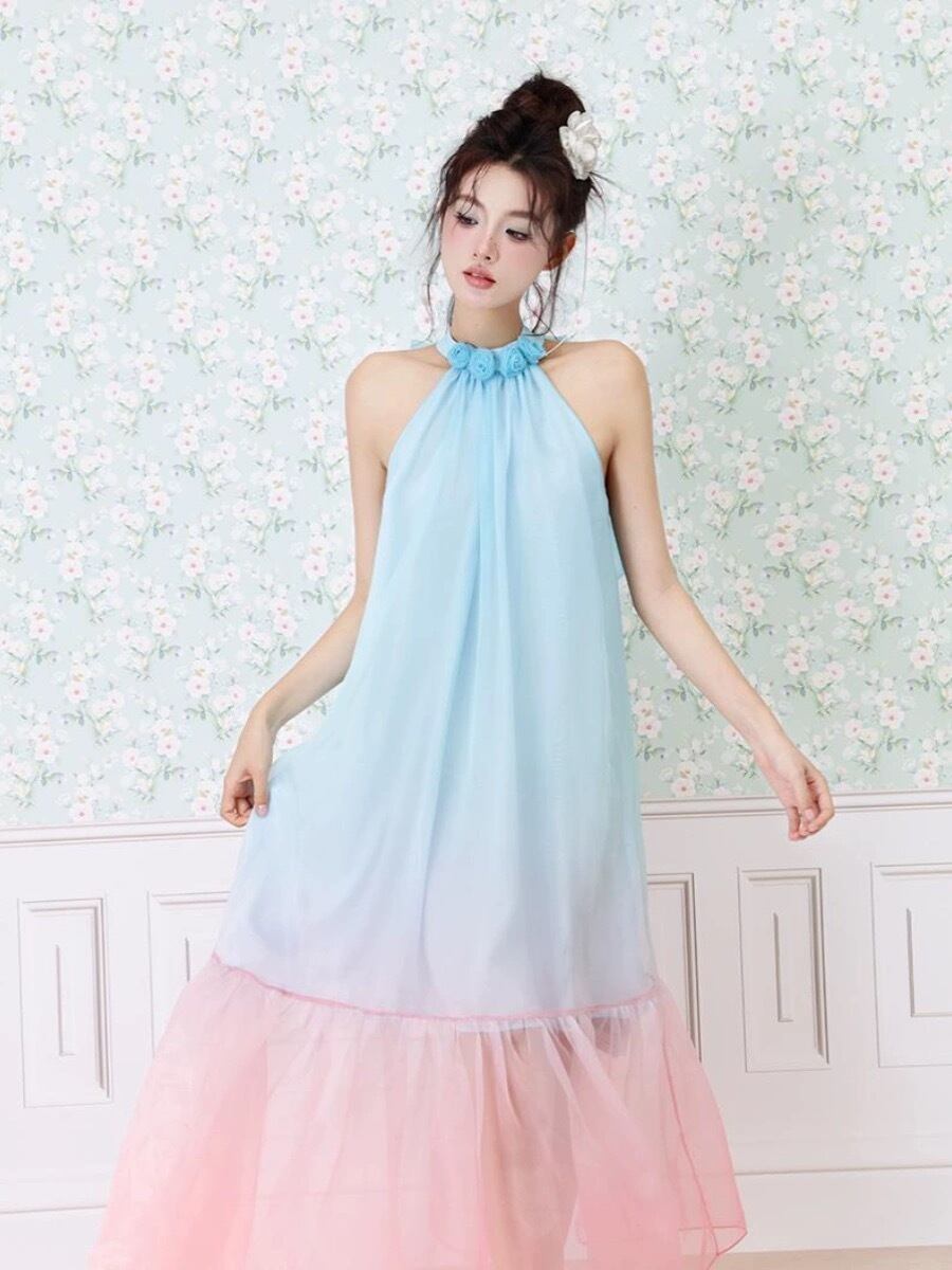 花柄 グラデーション 水色 ピンク リボン マキシ ガーリー