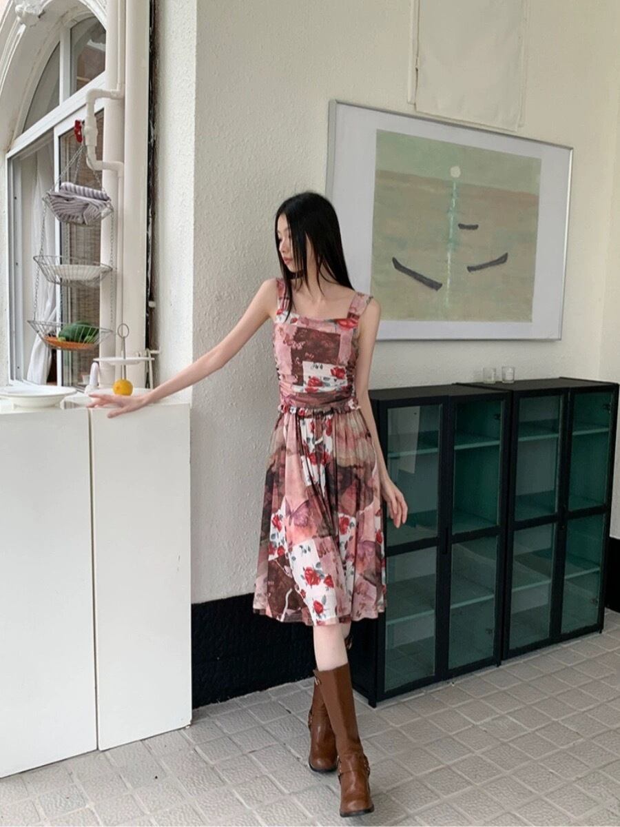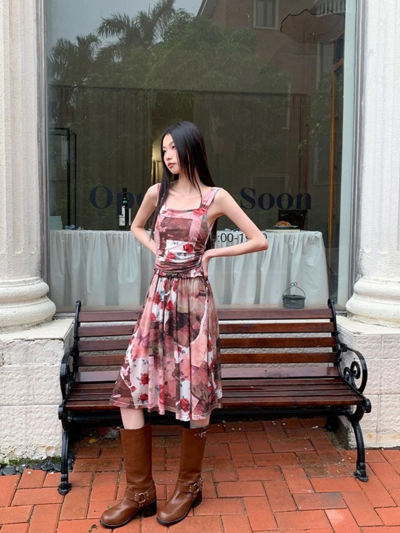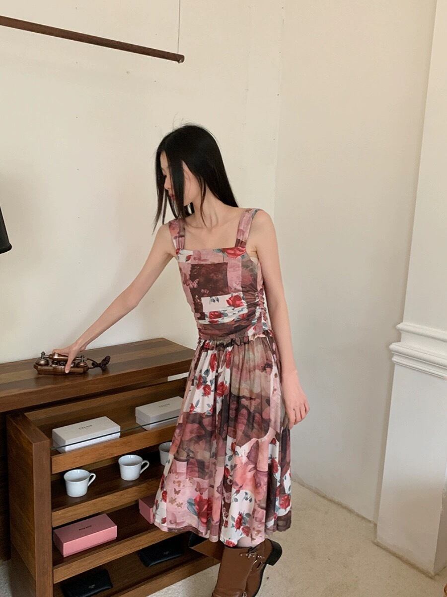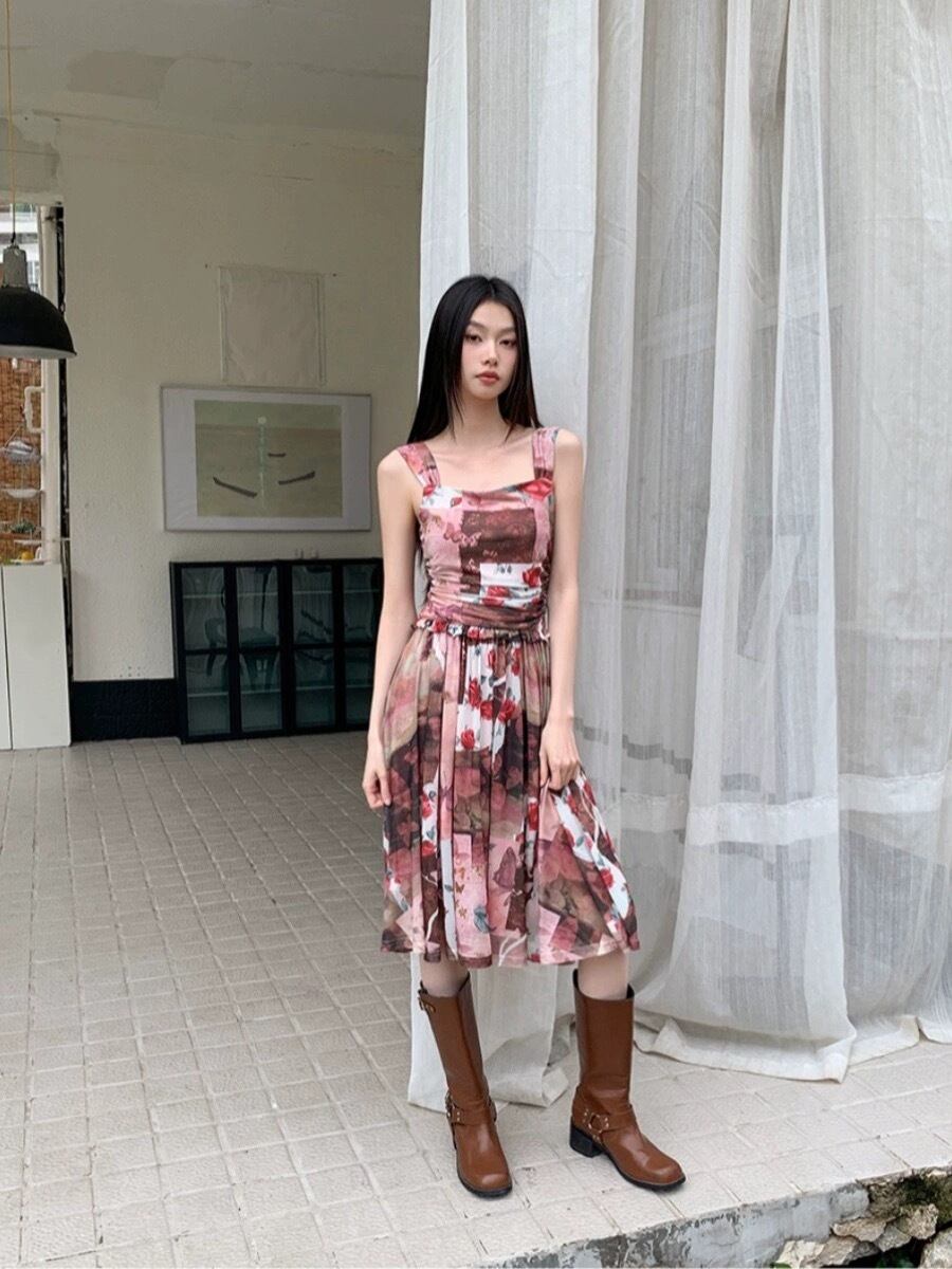 花柄 グラデーション 水色 ピンク リボン マキシ ガーリー