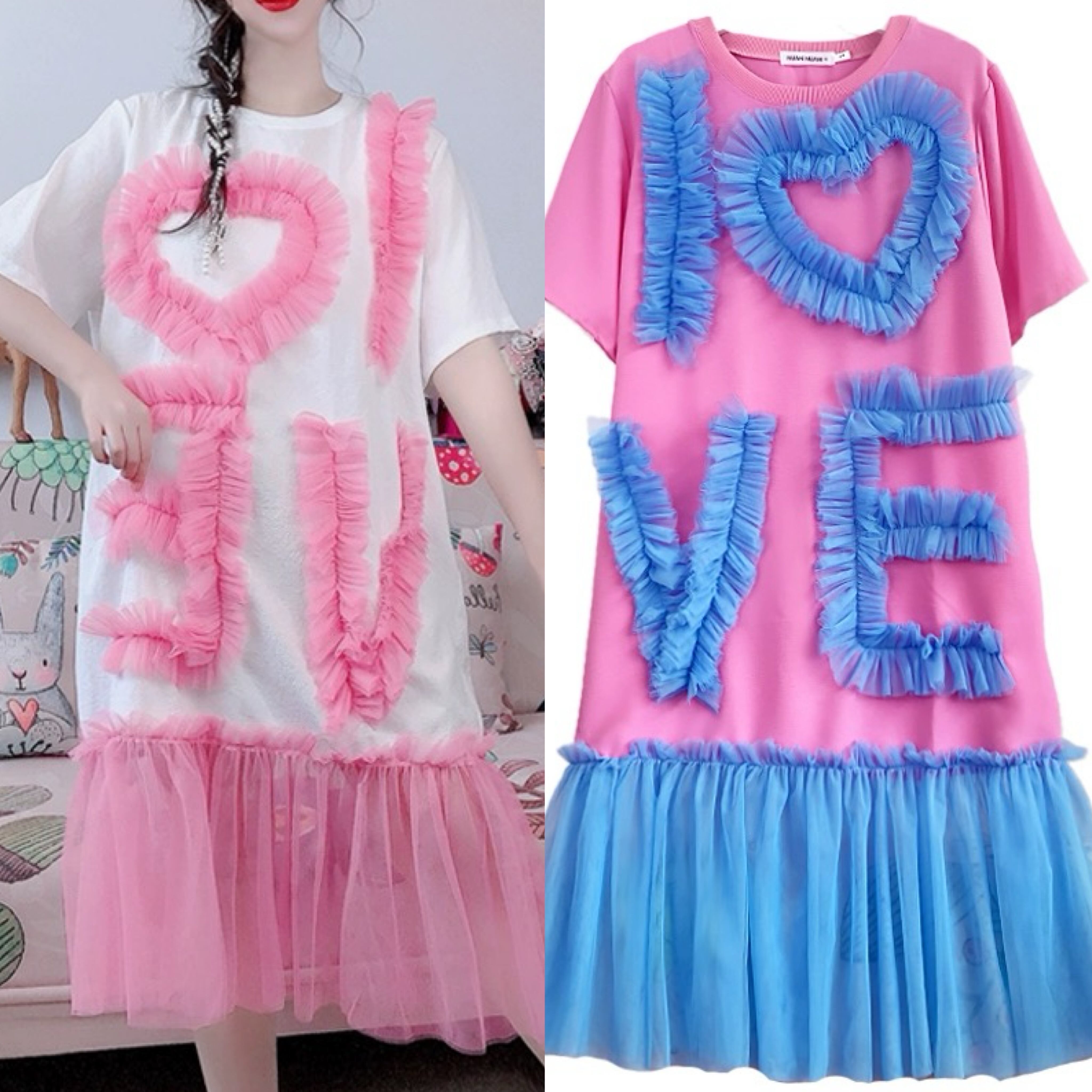 ラブ LOVE ハート ピンク 水色 ワンピース スウェット カジュアル Tシャツ