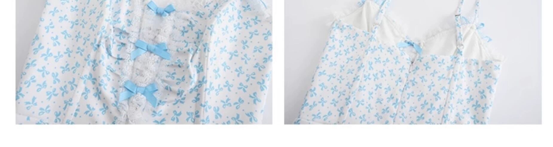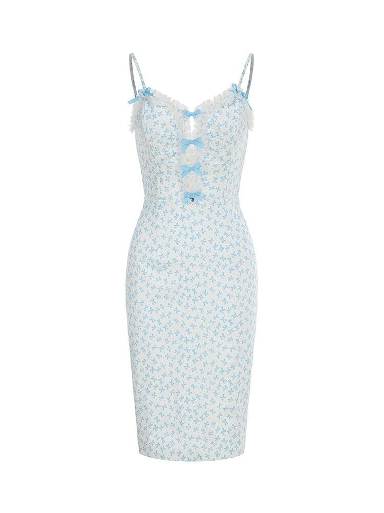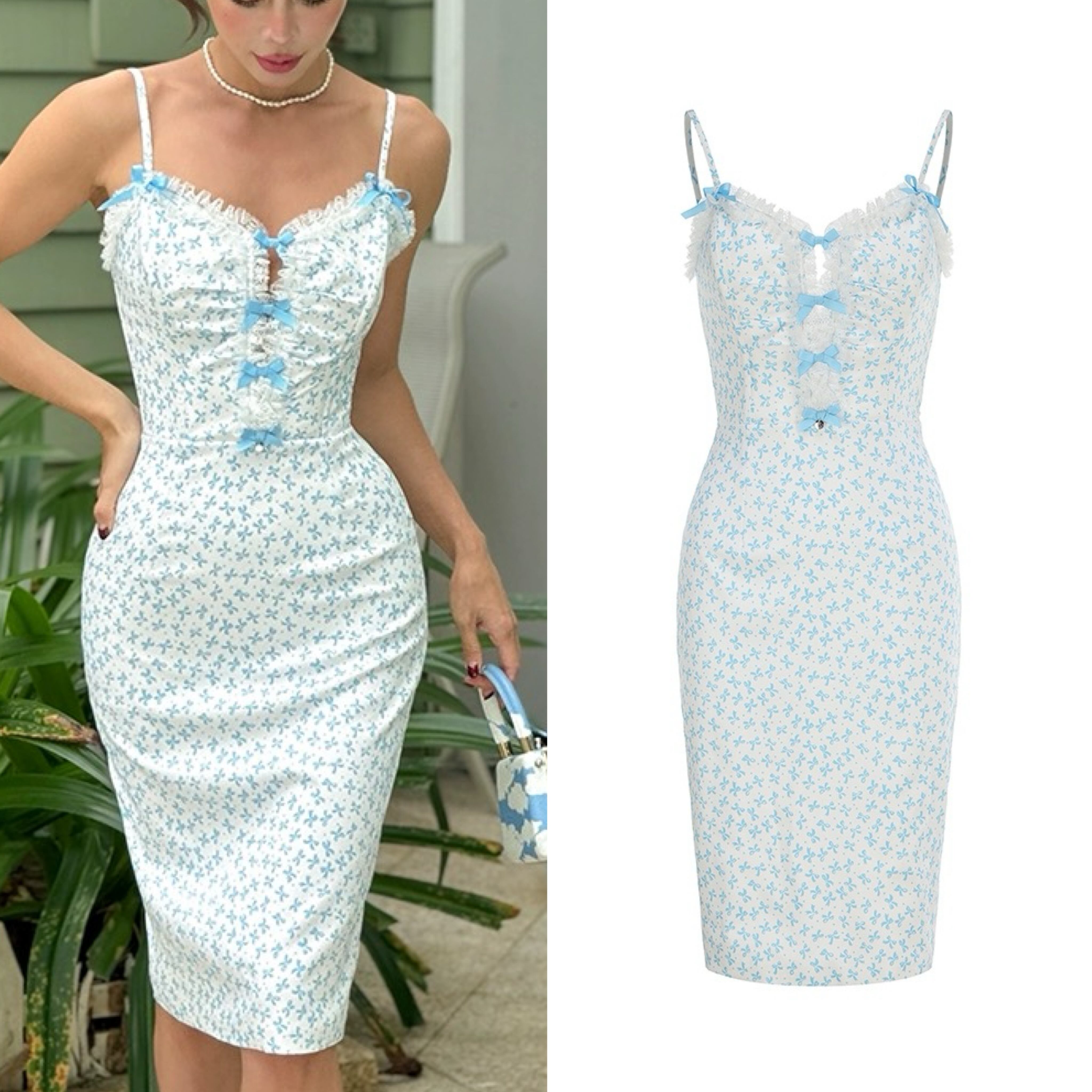 タイト マーメイド キャミソール 水色 チェック リボン ワンピース