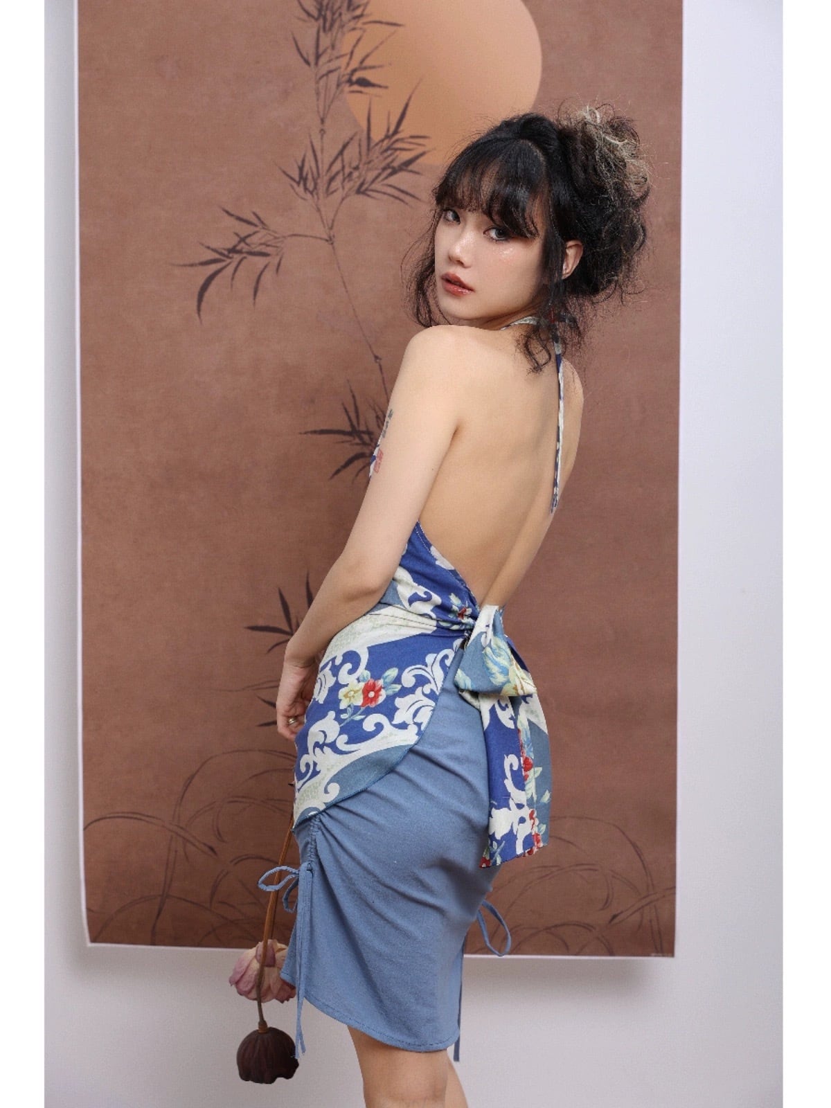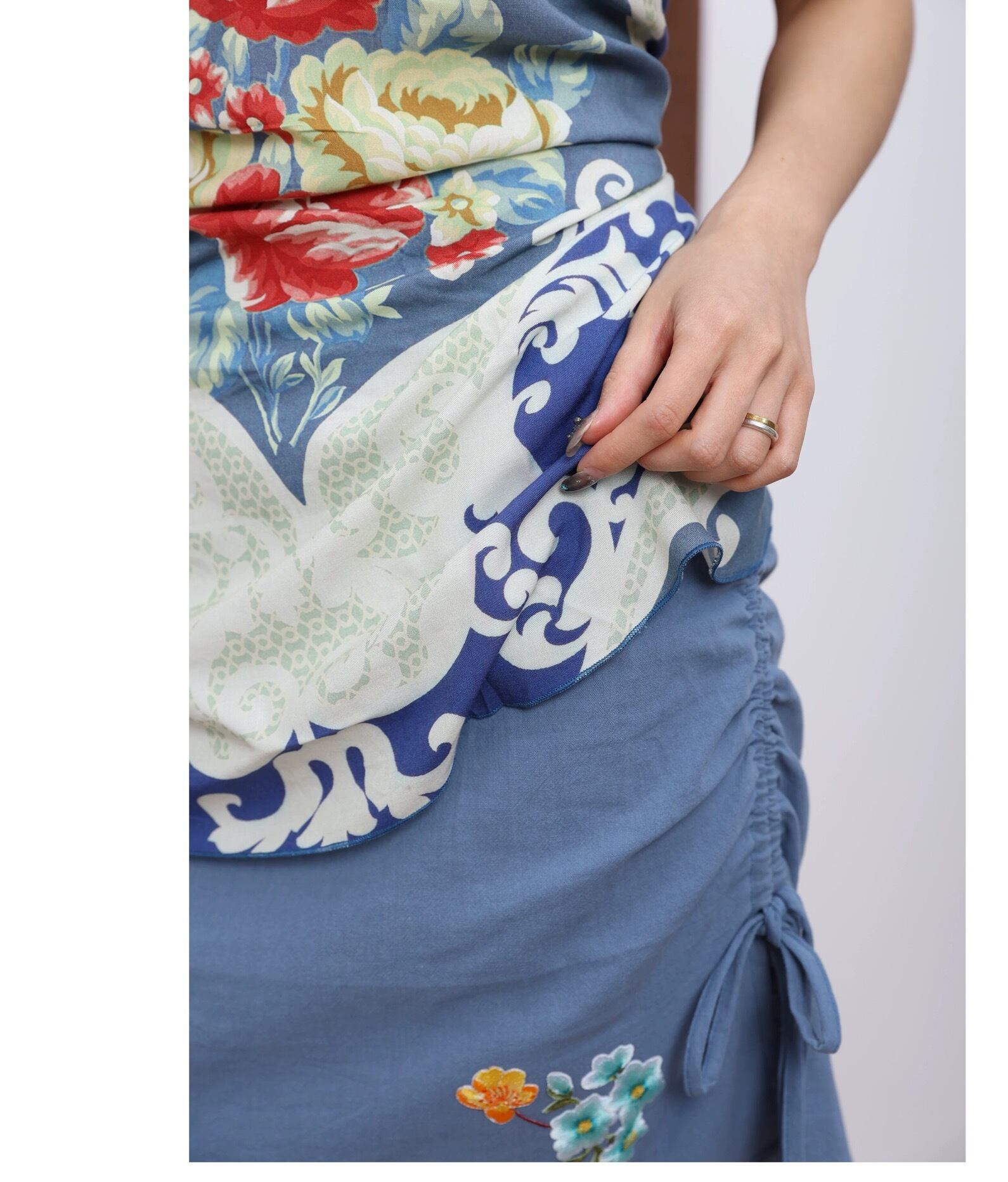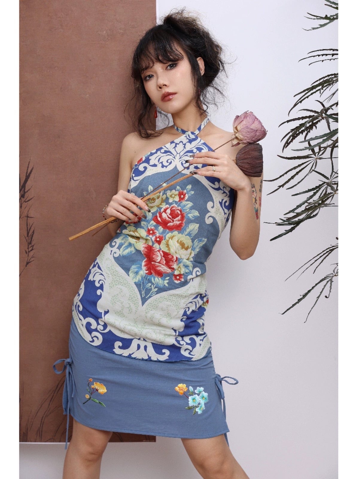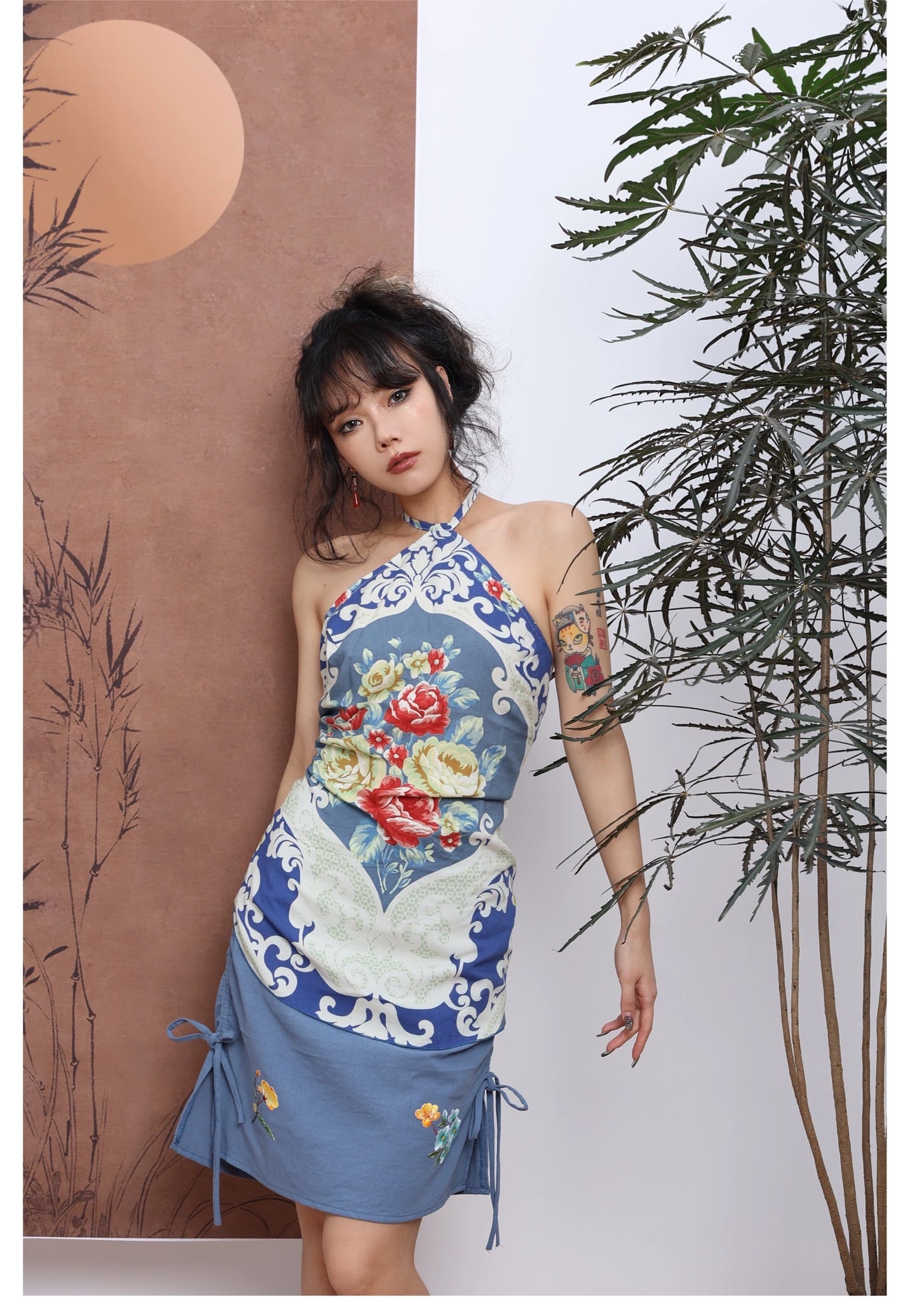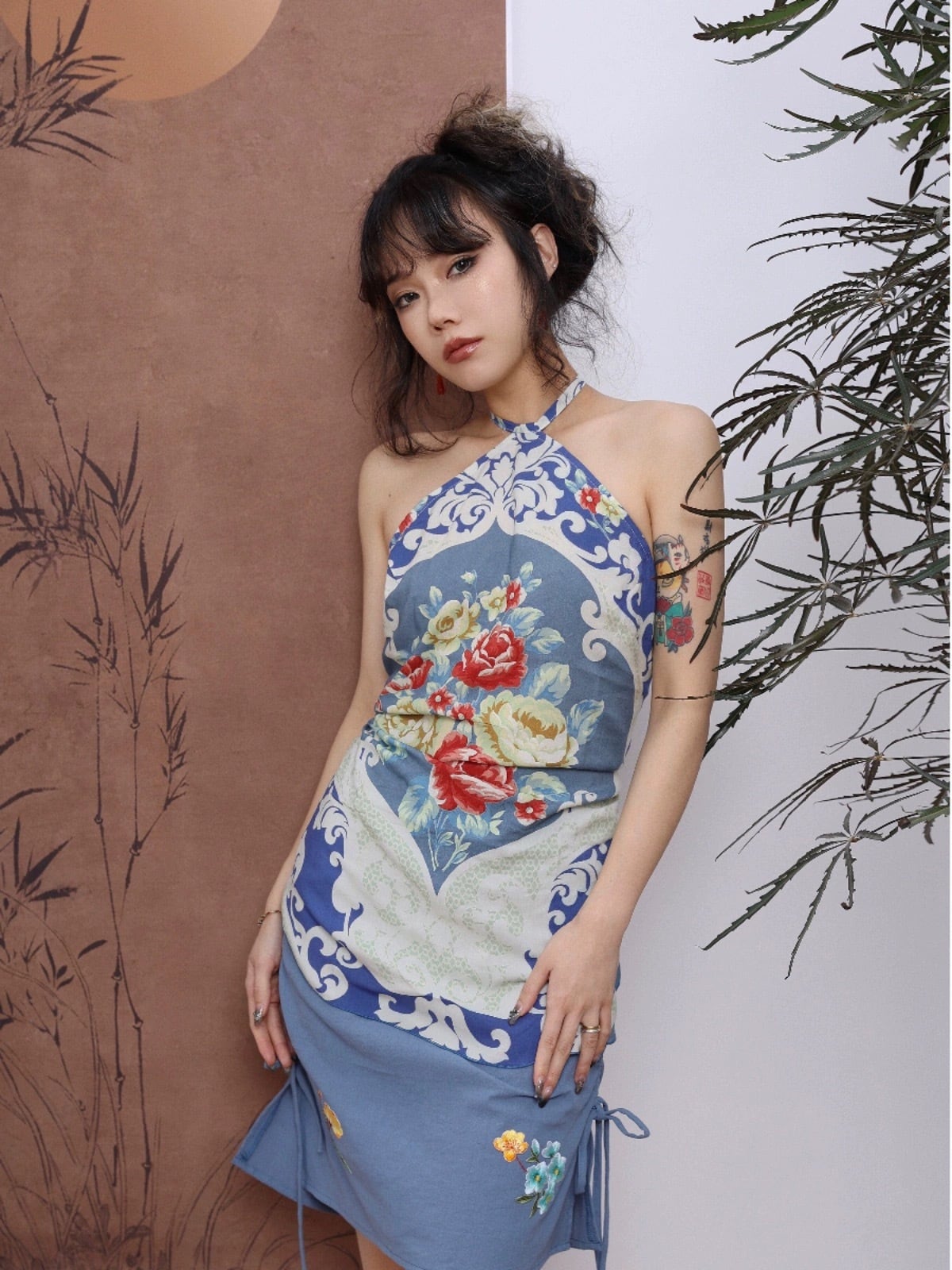 【トップス】ブラウス 水色 スカーフ 金太郎 ホルダーネック 花柄 フラワー