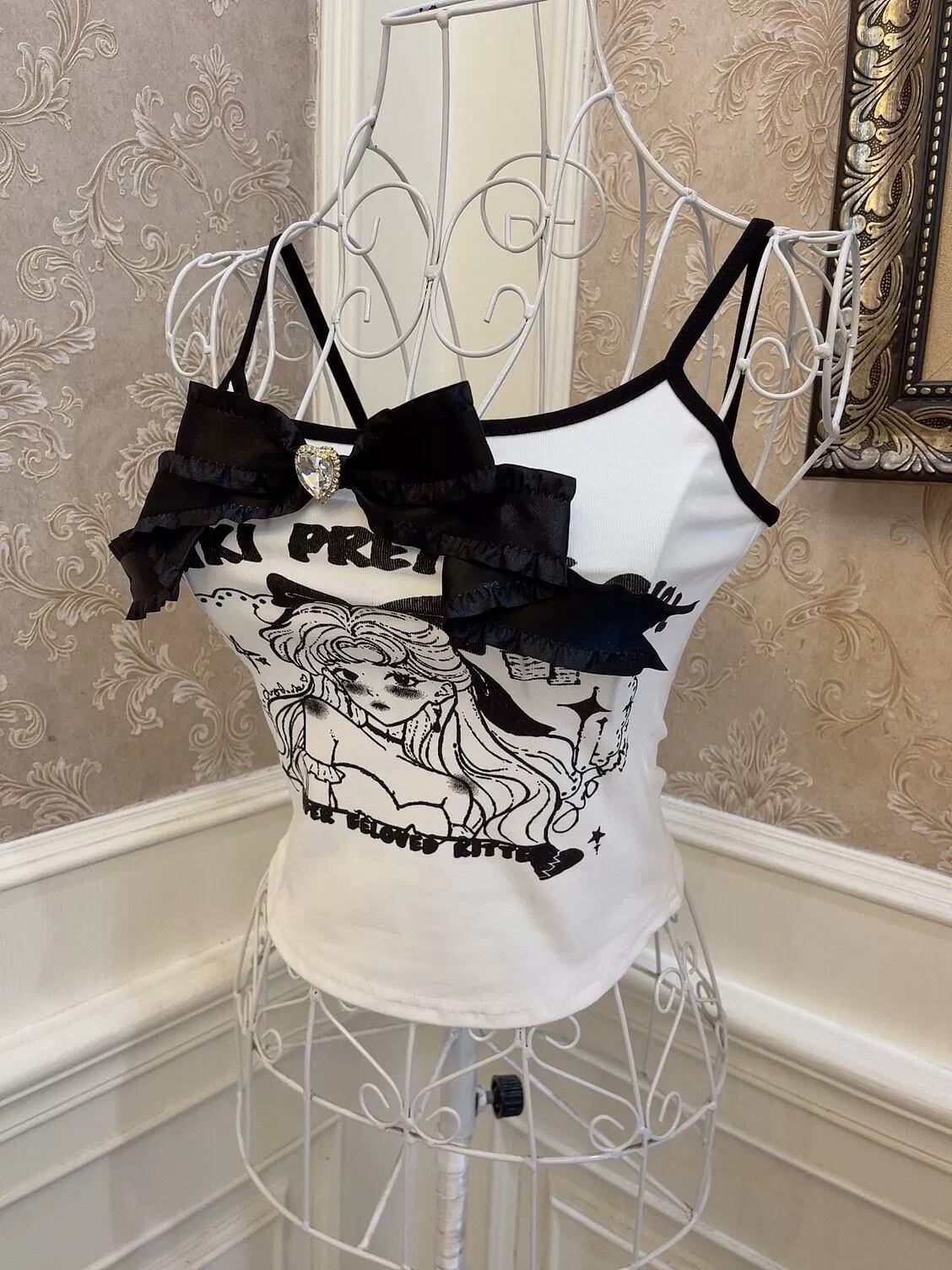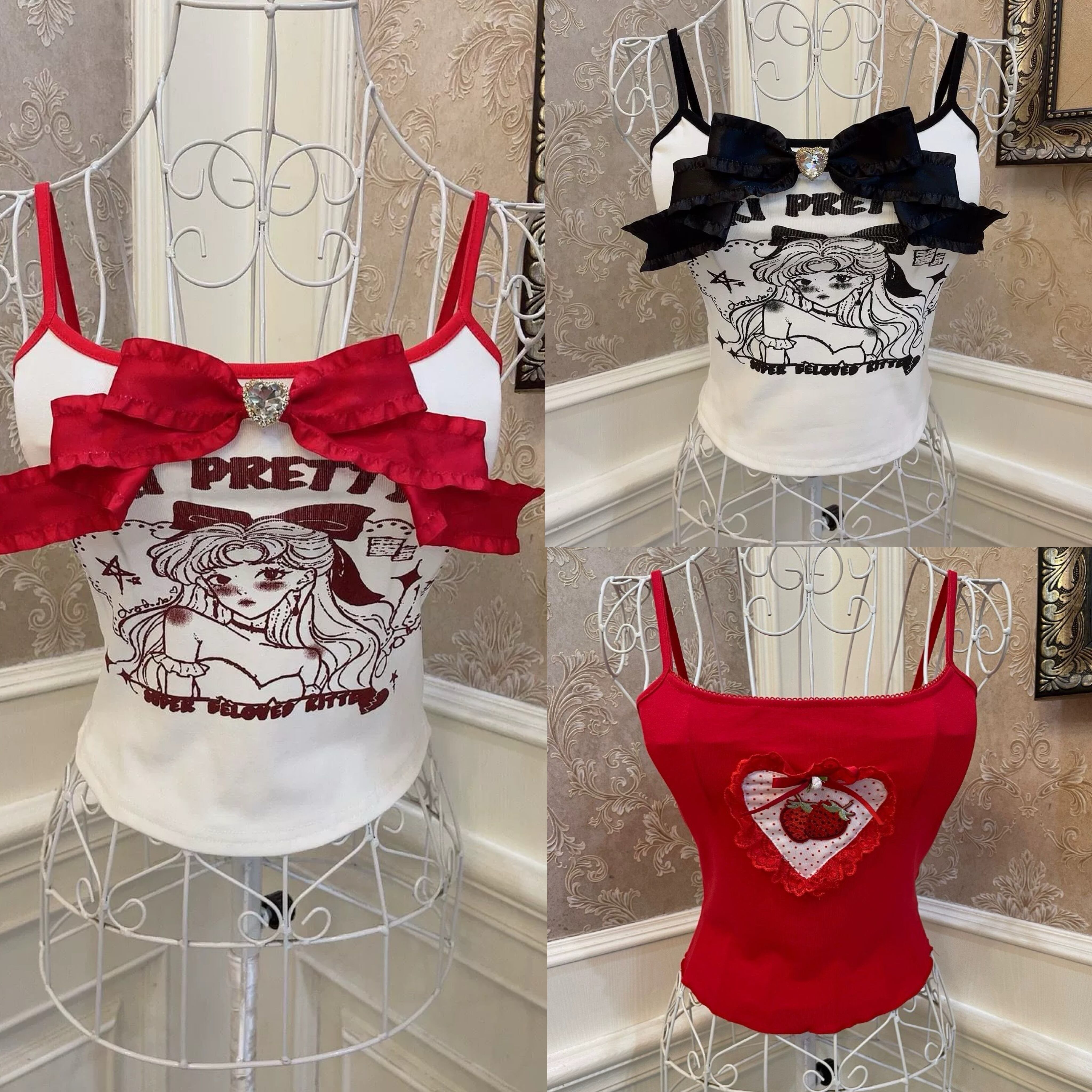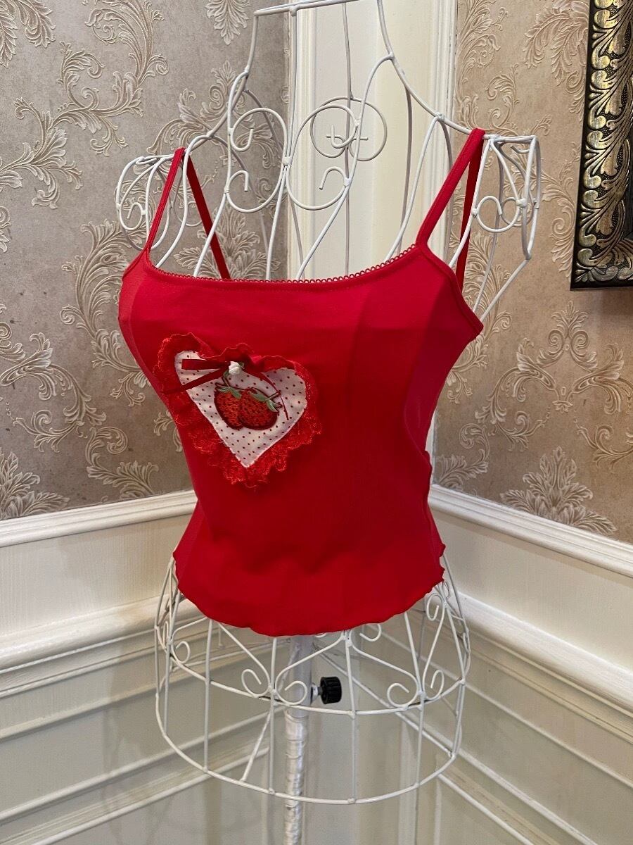 キャミソール 赤 さくらんぼ 黒 リボン 黒 白 リボン キャミソール ブラウス 姫 トップス ガーリー コスプレ ハート ロリータ 姫 コスプレトップス 可愛い 姫 ブラウス 原宿 ホルダーネック