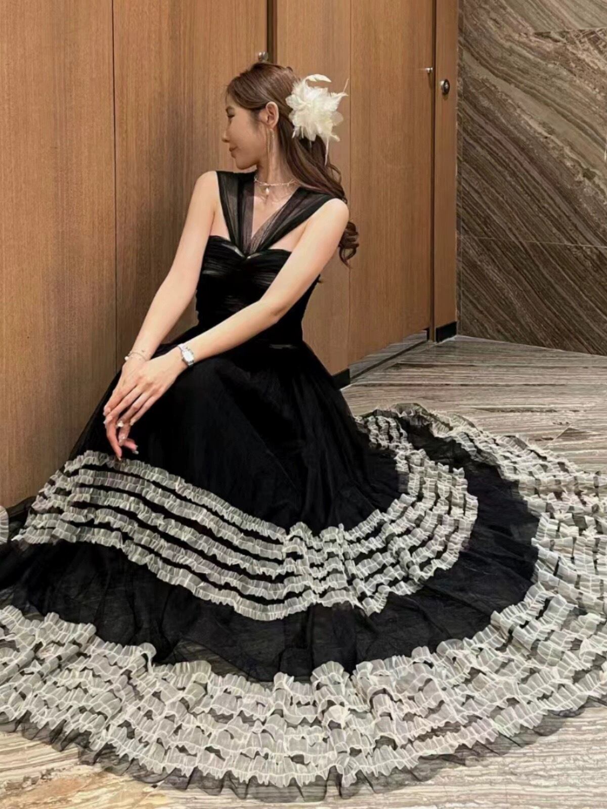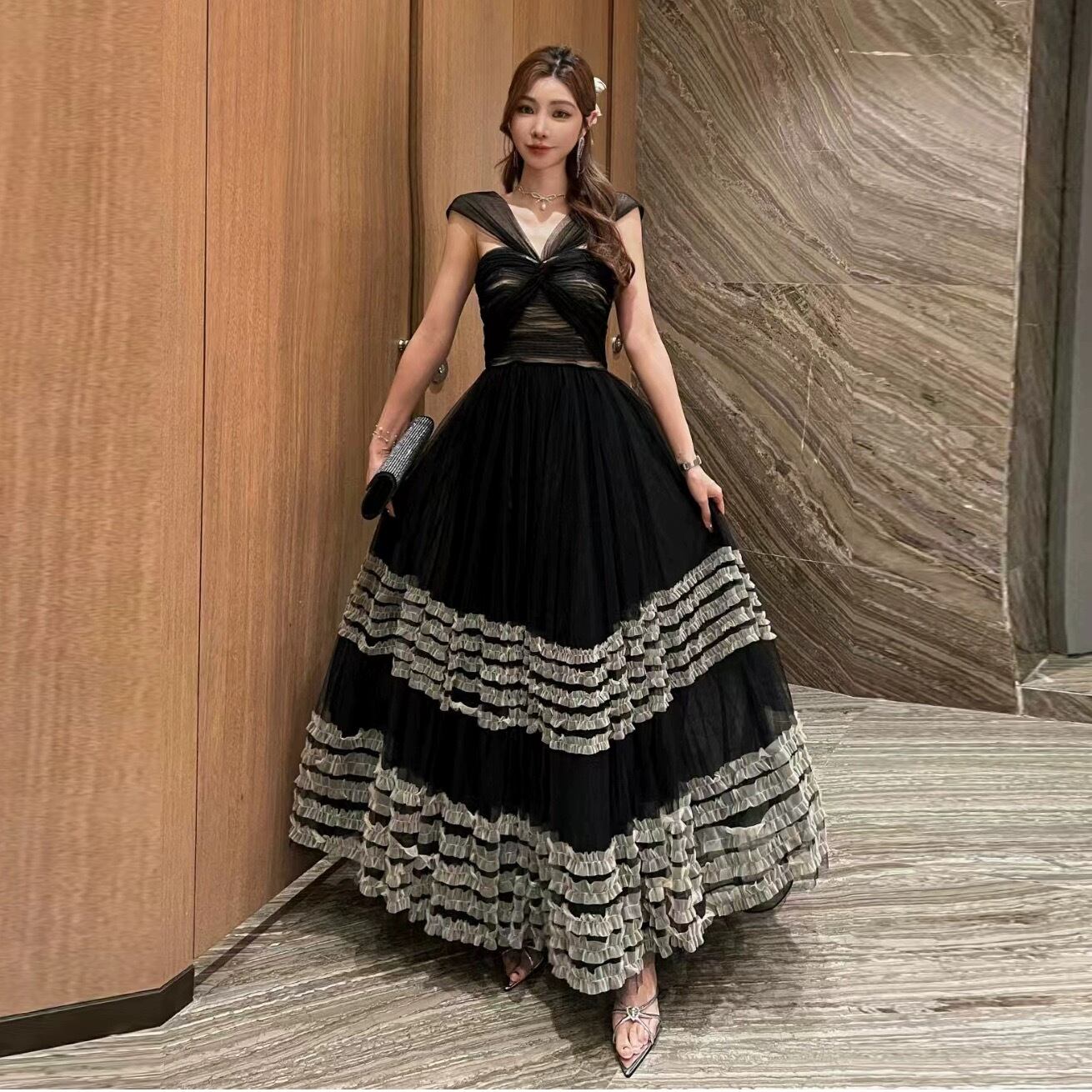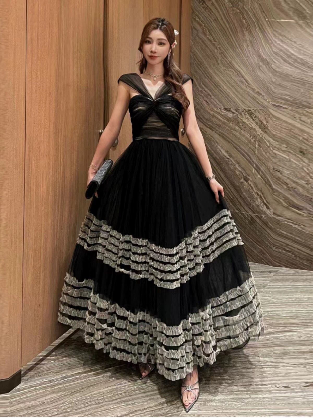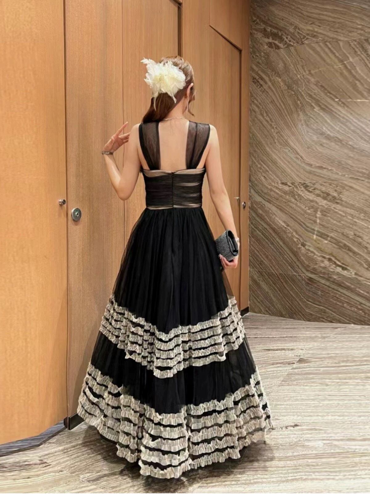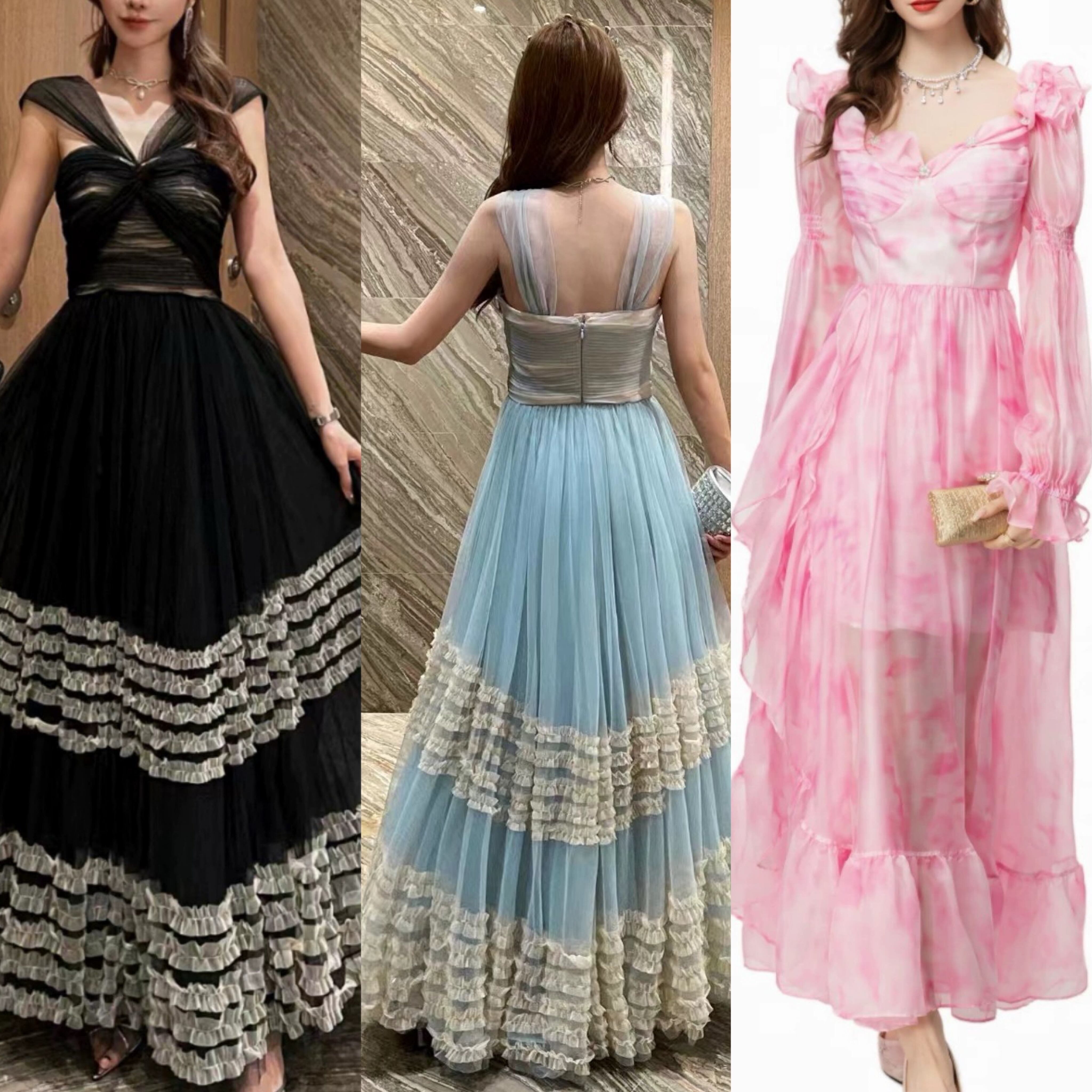 ピンク 黒 水色 エレガント マキシ ワンピース