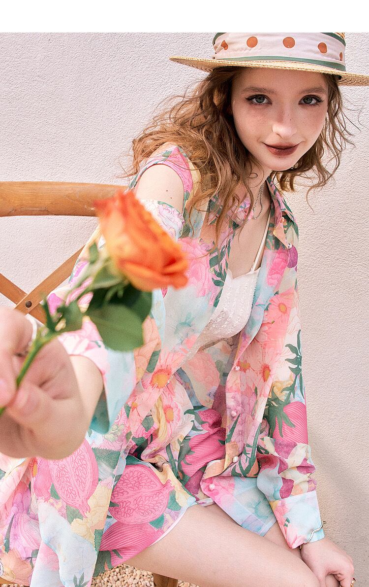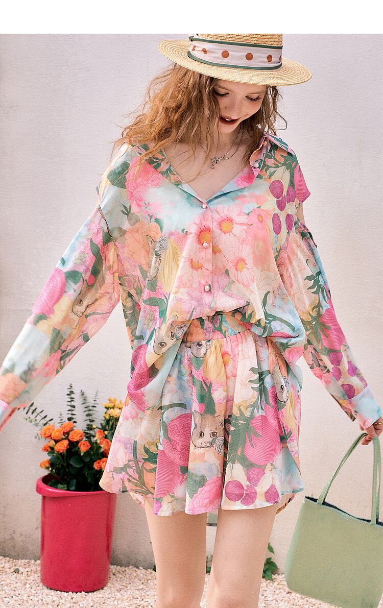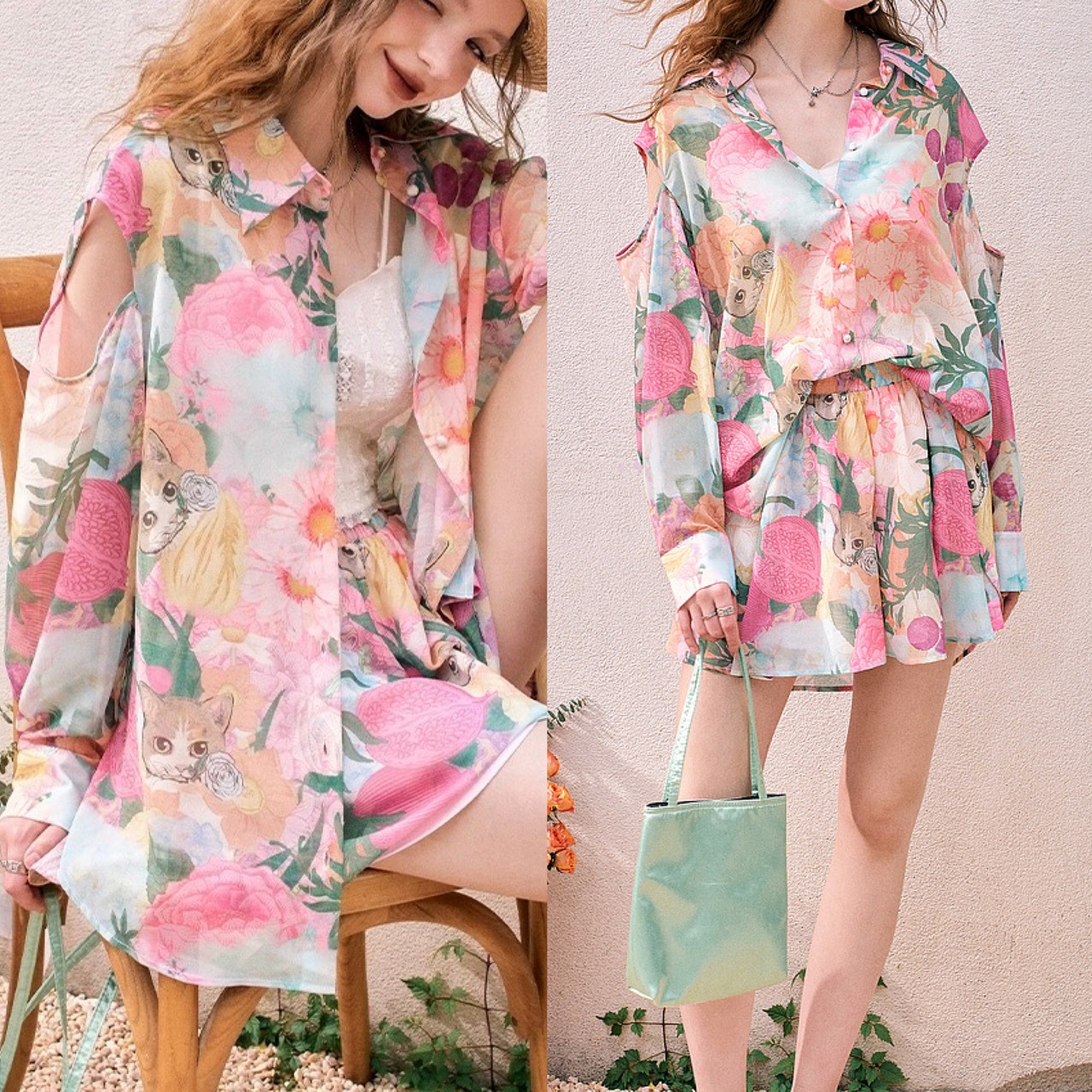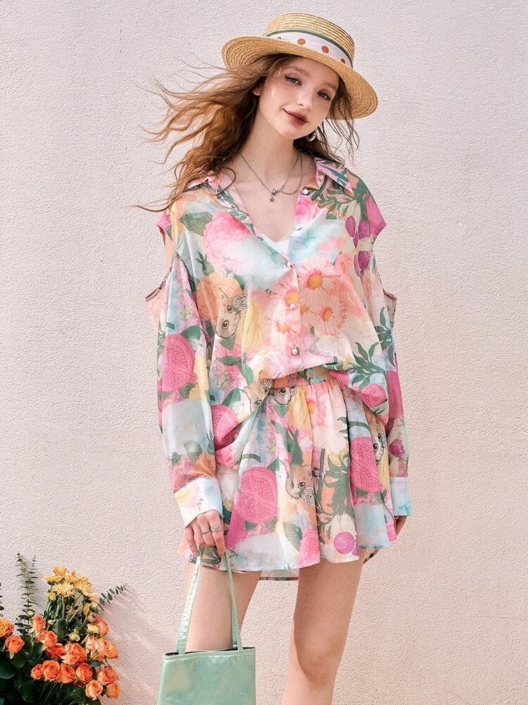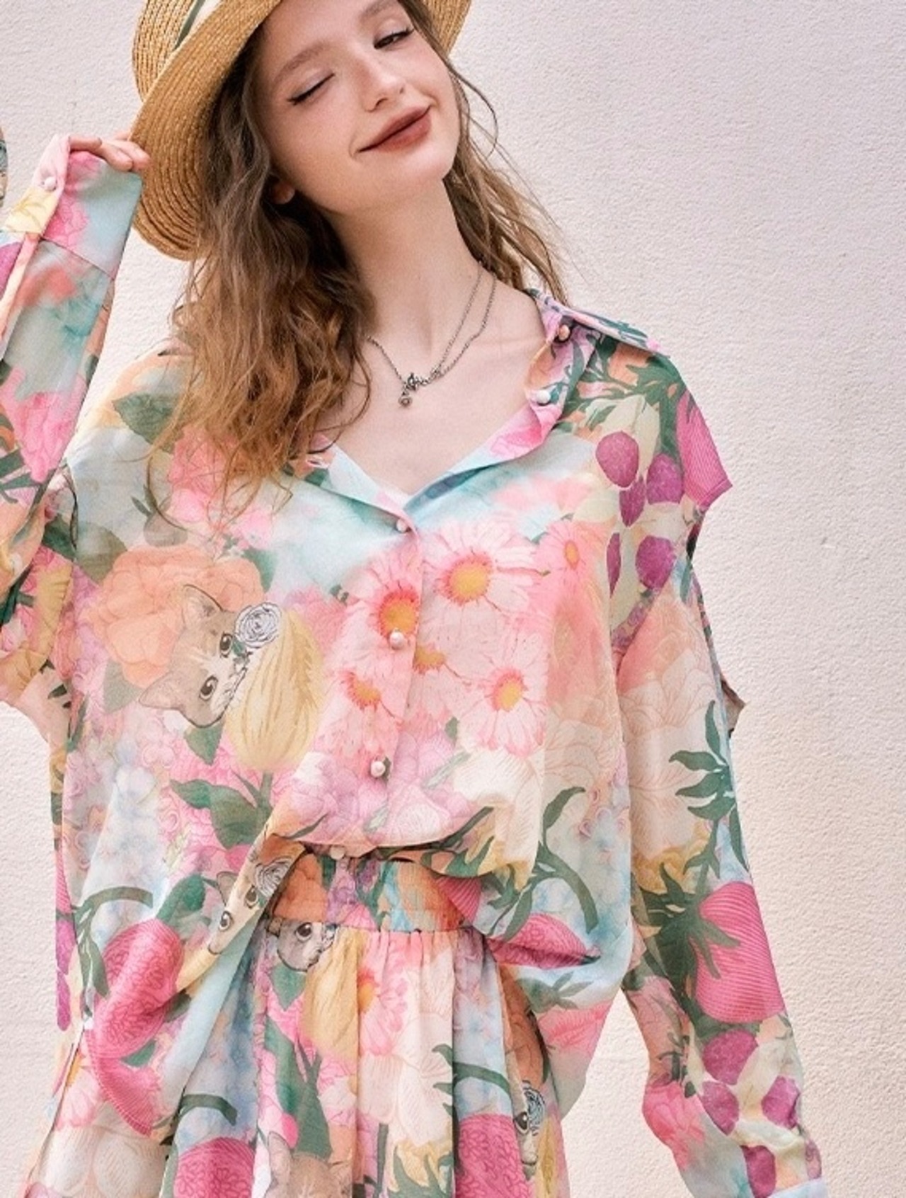 【セットアップ】カラフル ピンク ブラウス カジュアル 花柄 フラワー トロピカル
