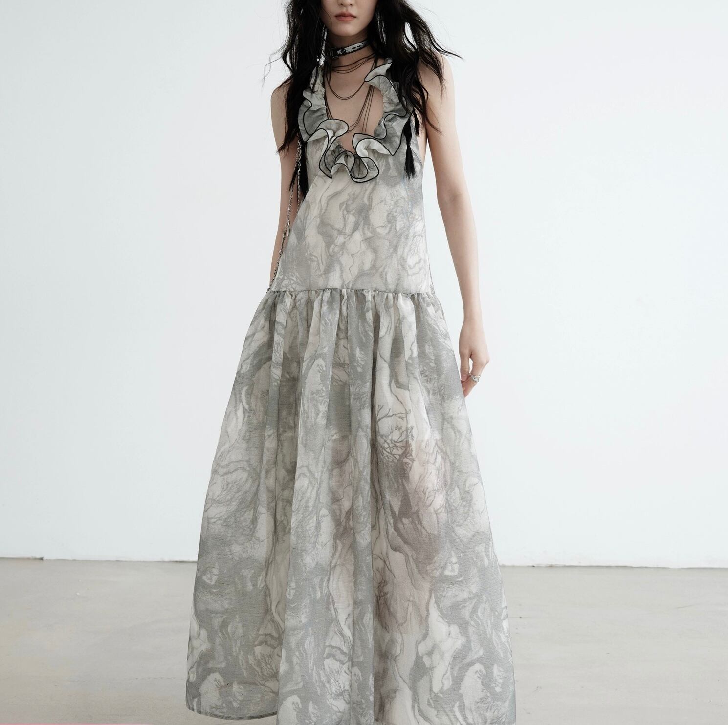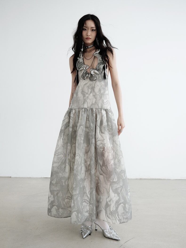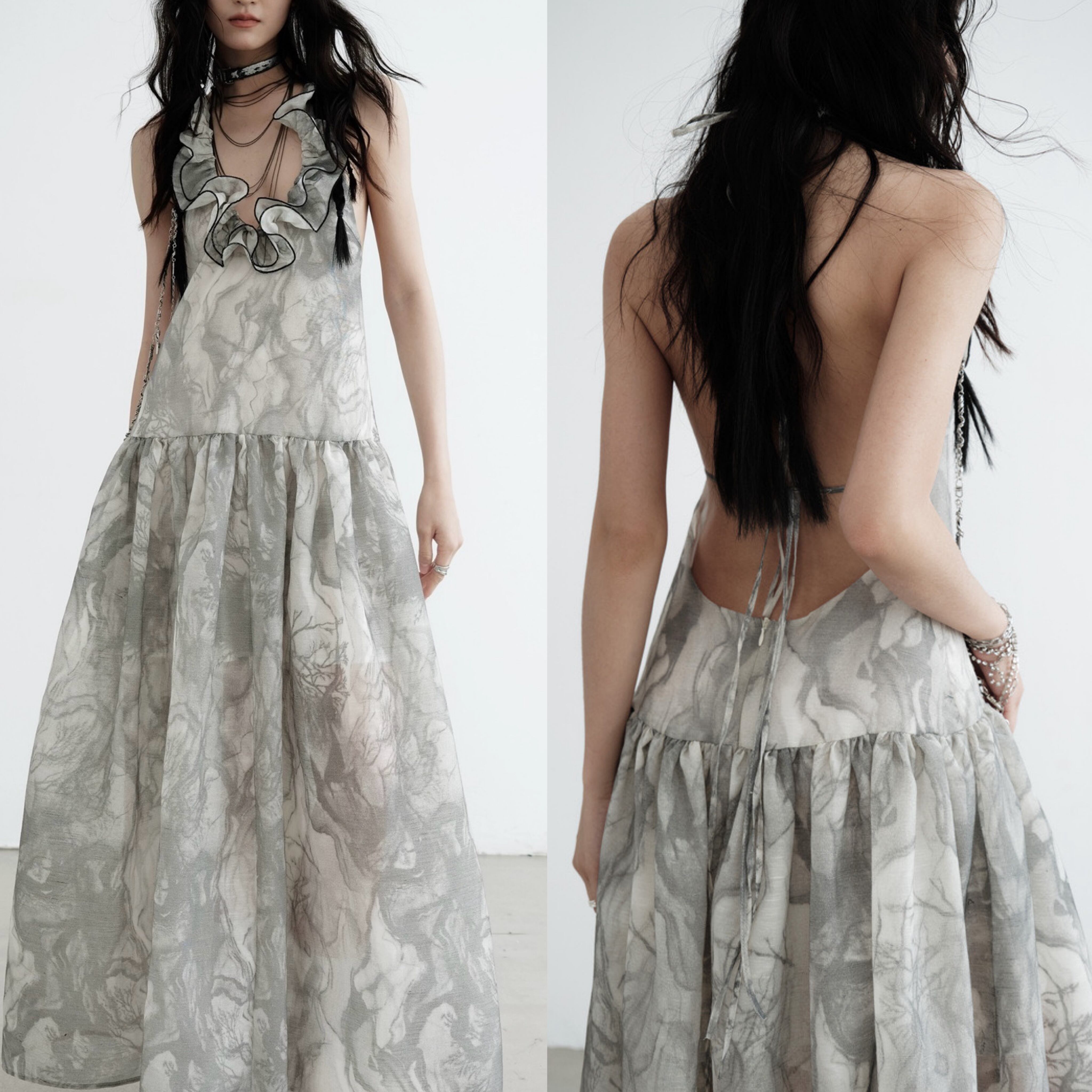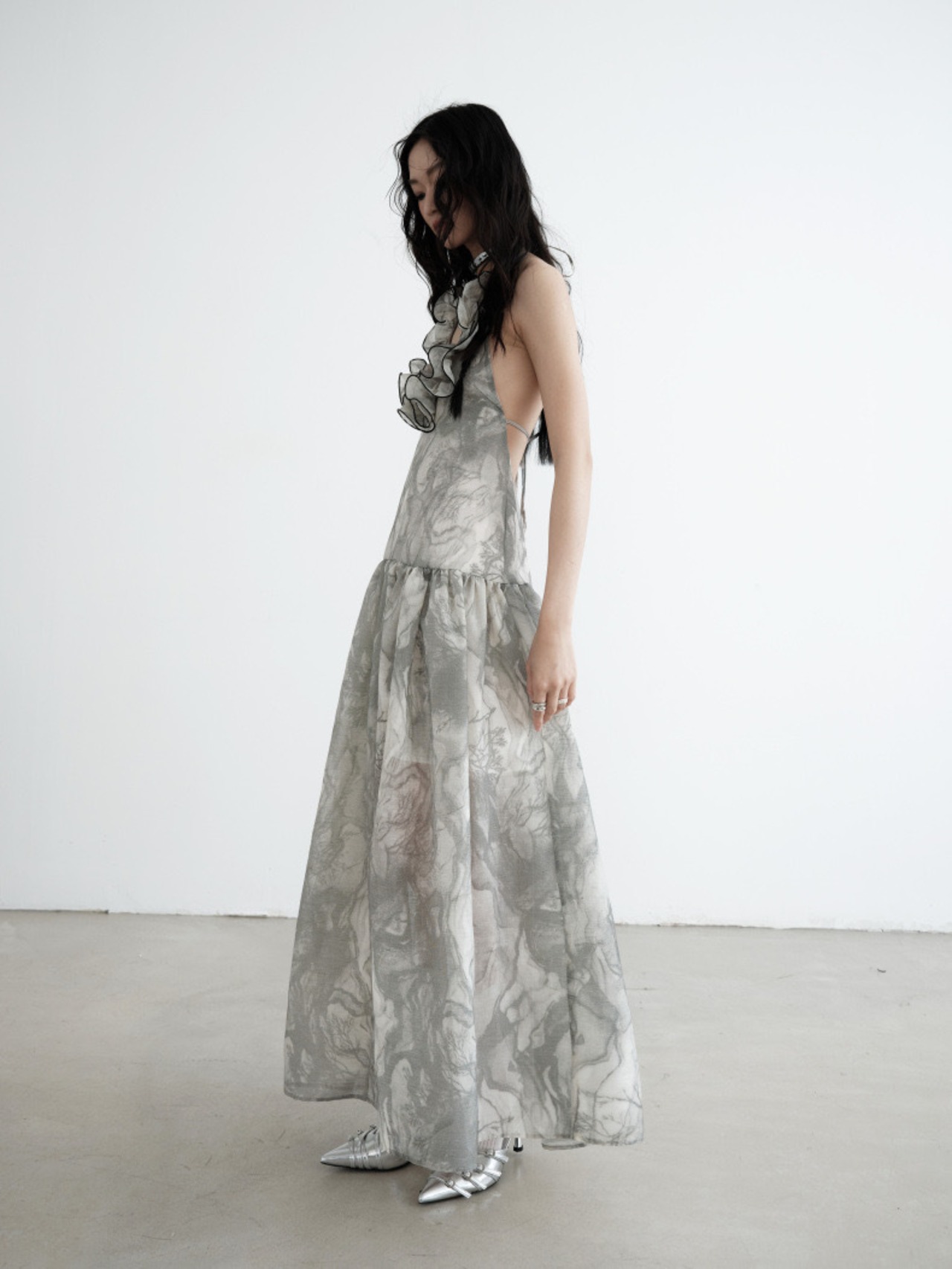 グレー ホルダーネック マキシ ロング シンプル ワンピース 花柄 フラワー