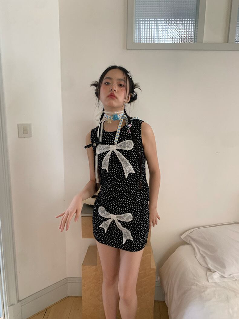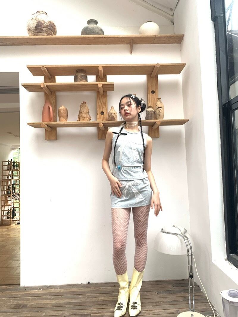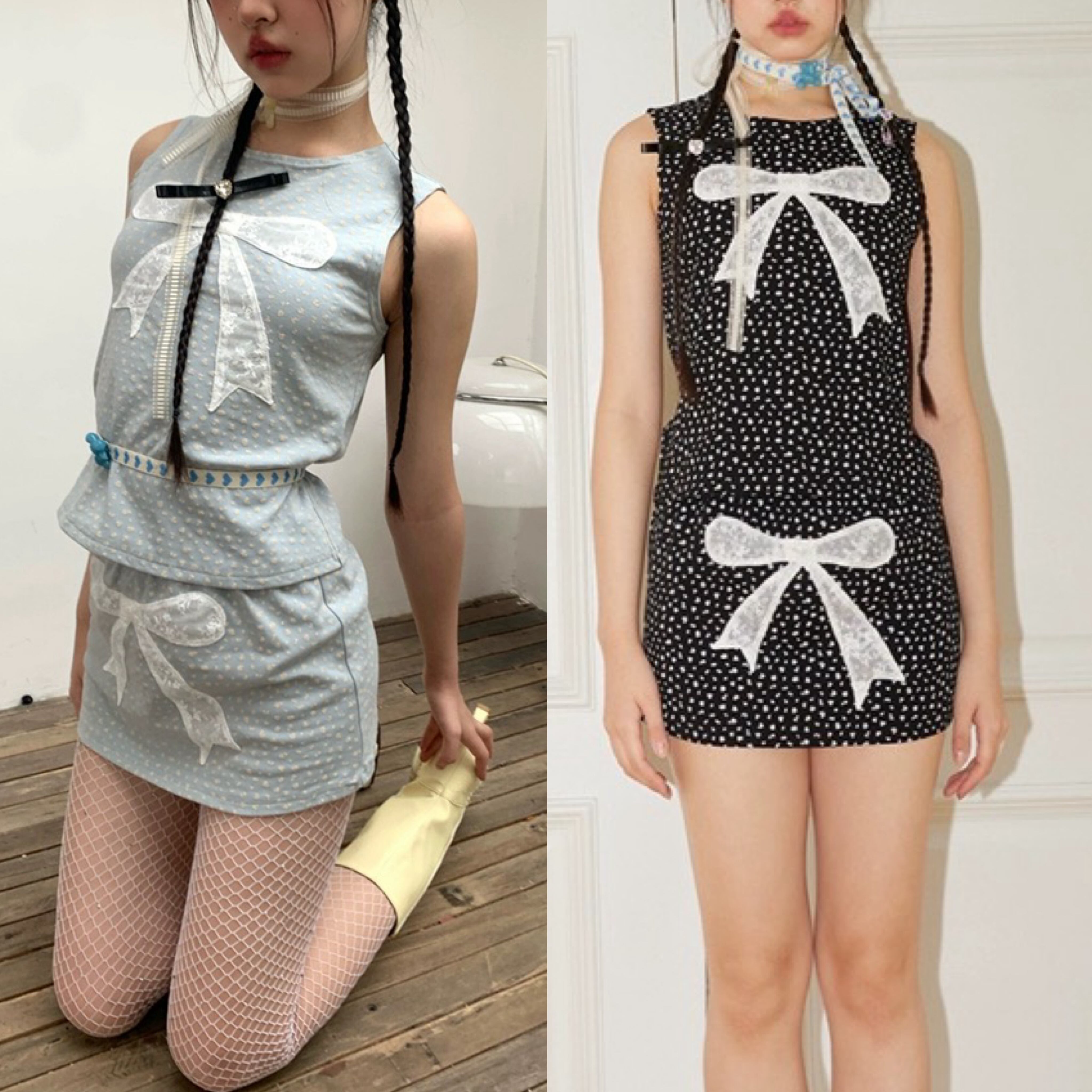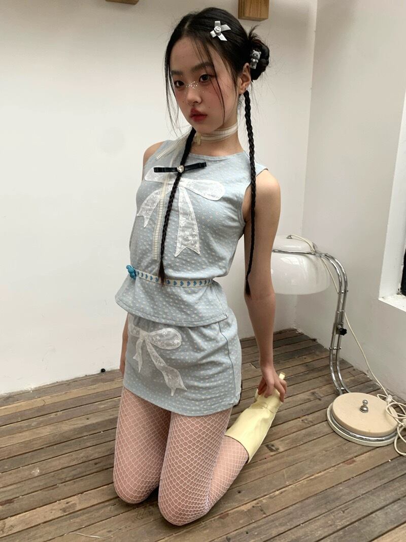 【セットアップ】黒 水色 グレー ミニスカート カジュアル リボン タンクトップ ブラウス