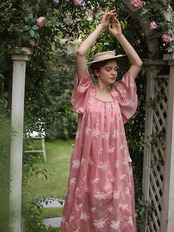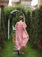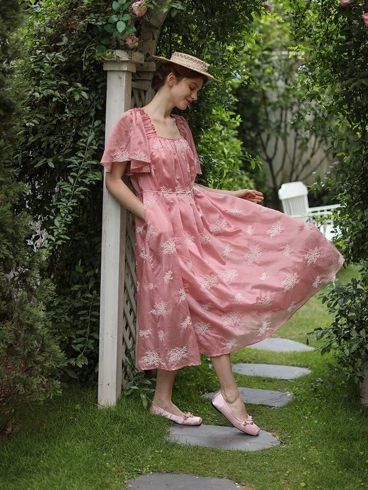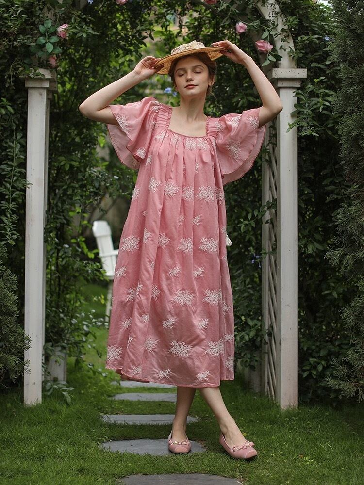 ピンク ゆったり フラワー 半袖 ガーリー エレガント ワンピース