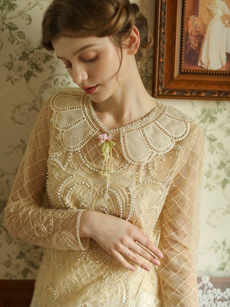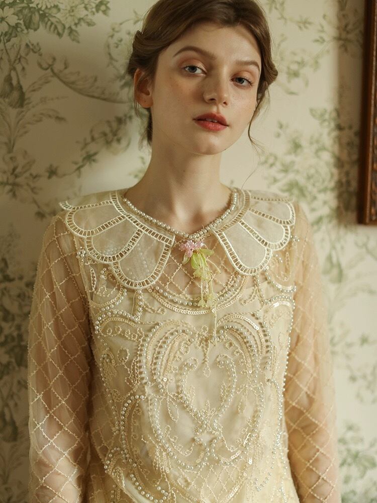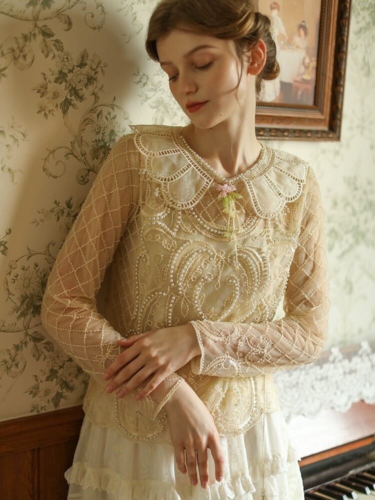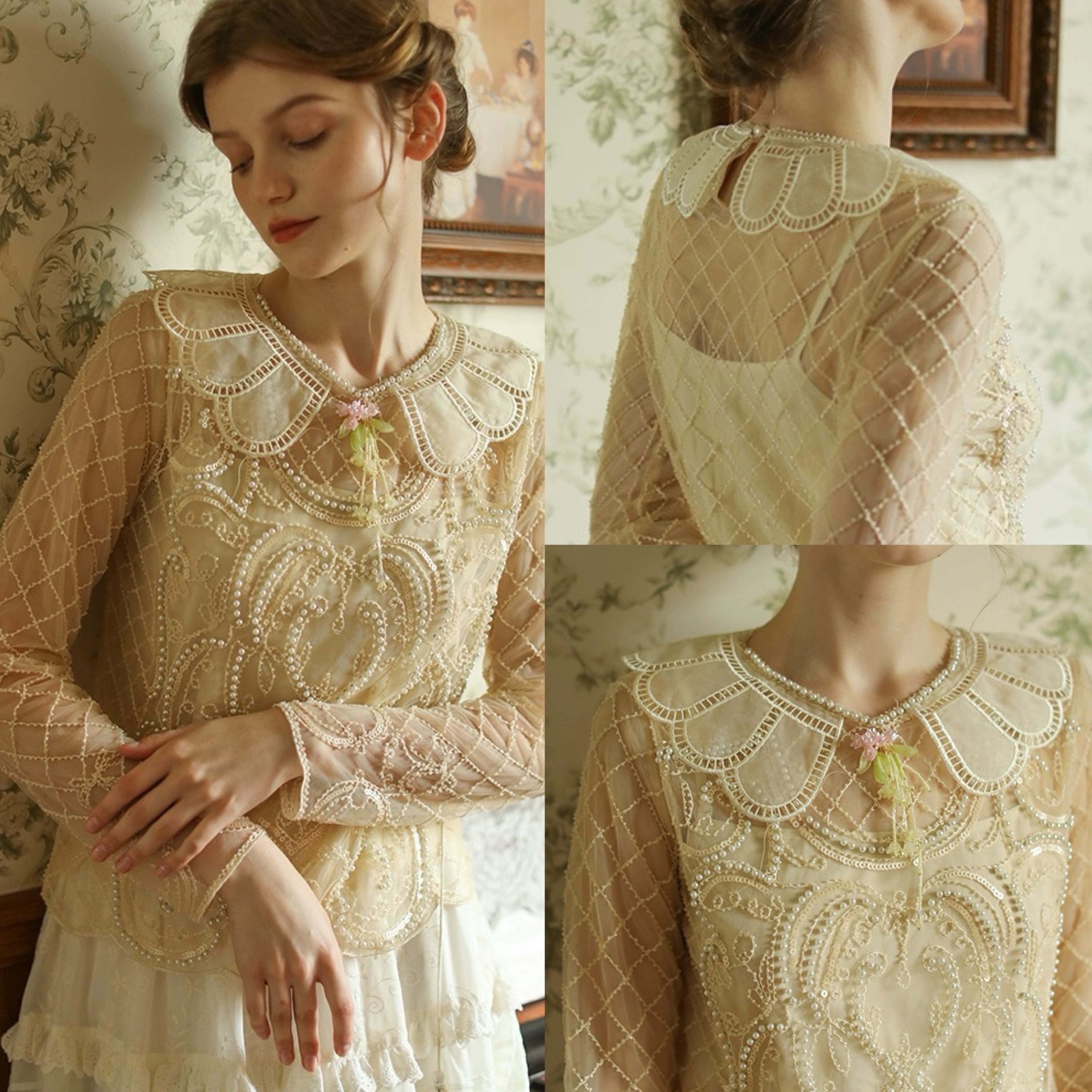ベージュ トップス パール ビジュー デコレーション ブラウス 花柄