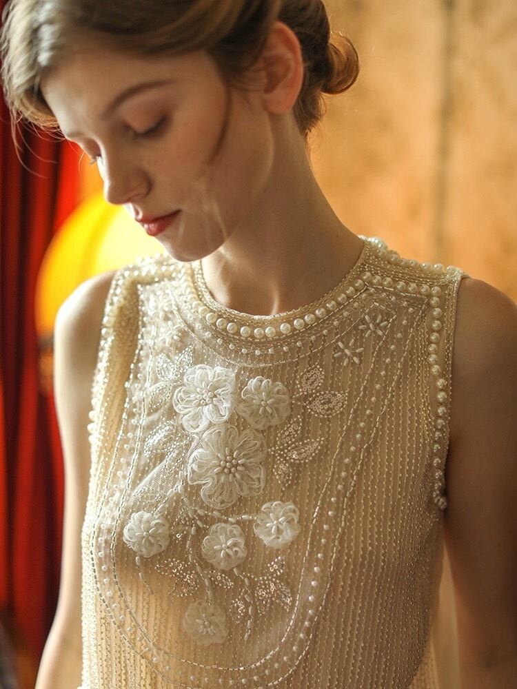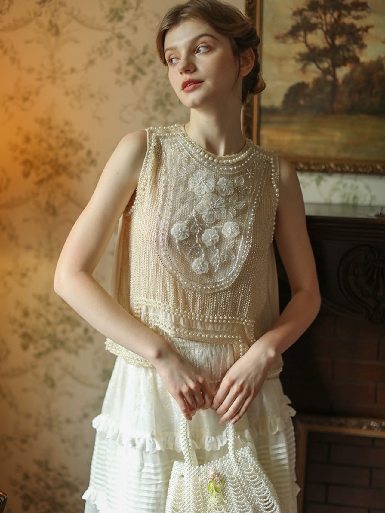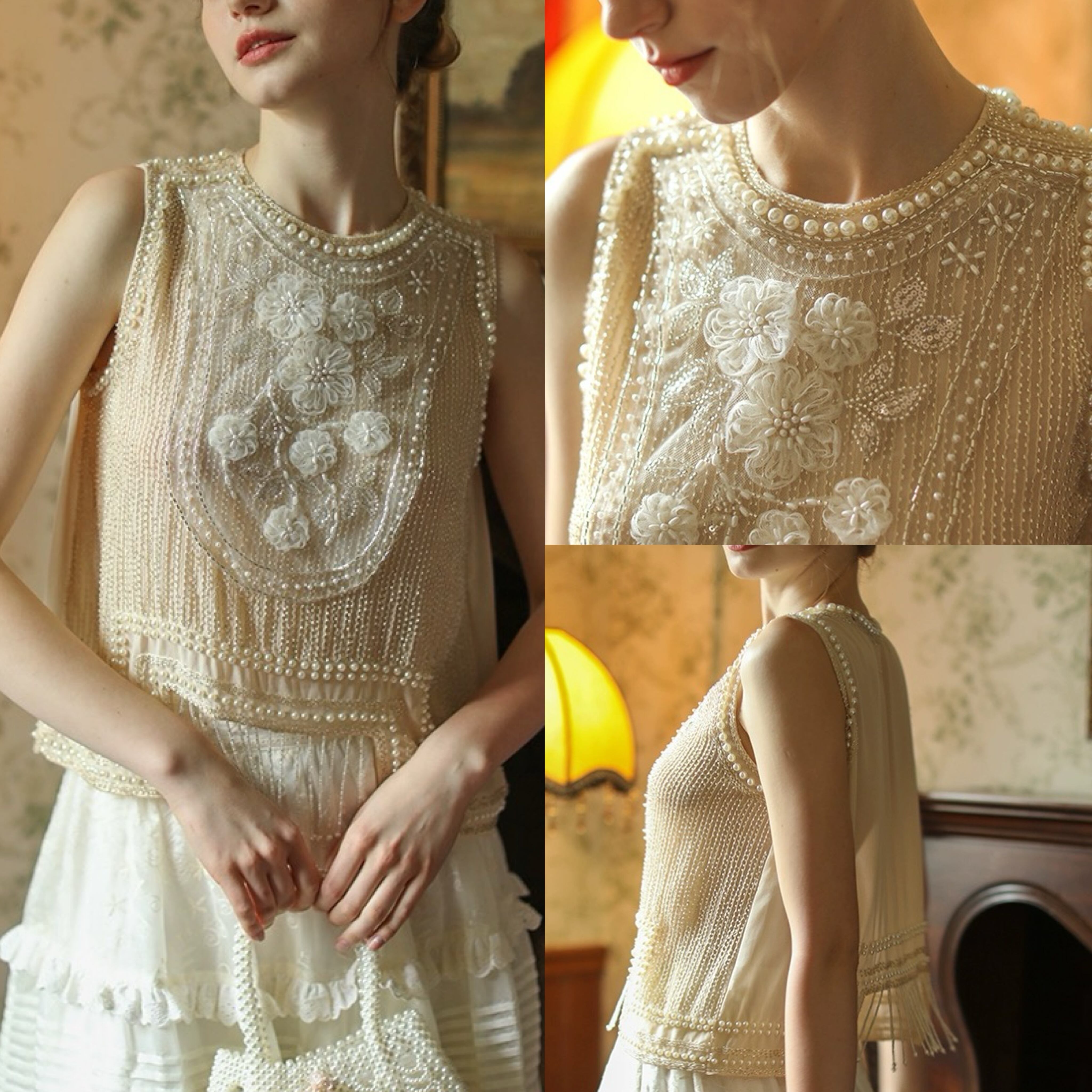 ベスト ノースリーブ パール ビジュー ビーズ デコレーション ブラウス ガーリー ベージュ 花柄