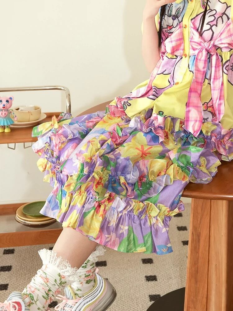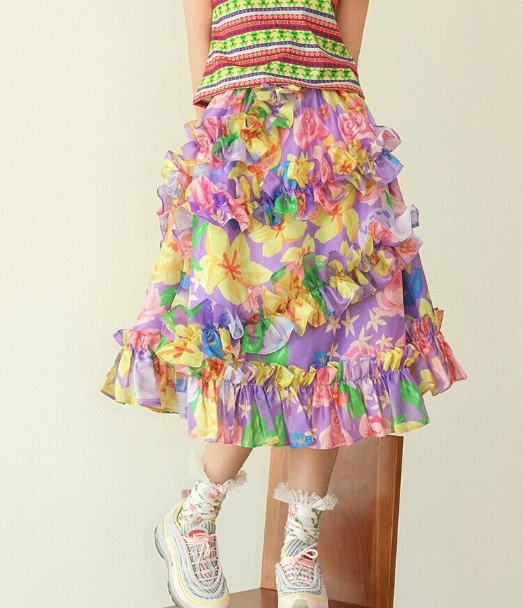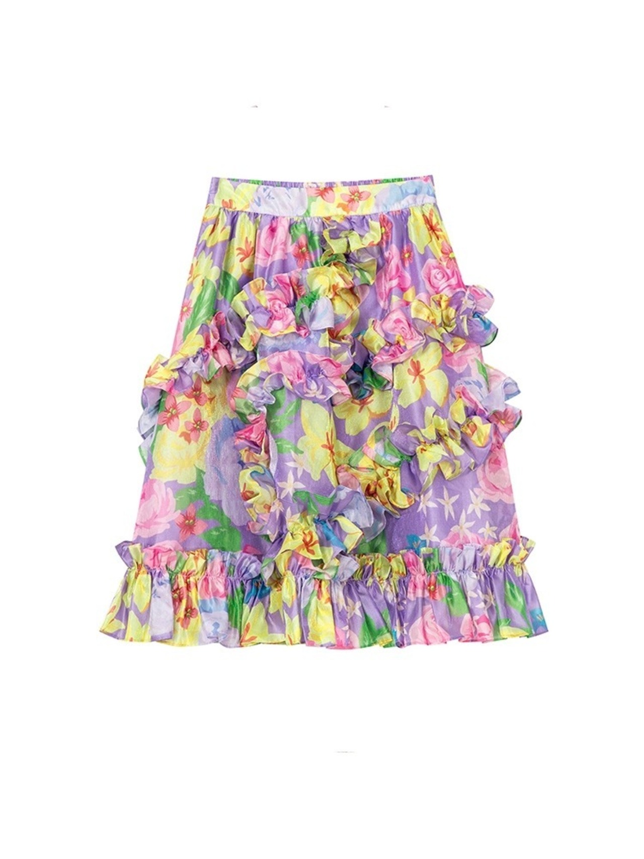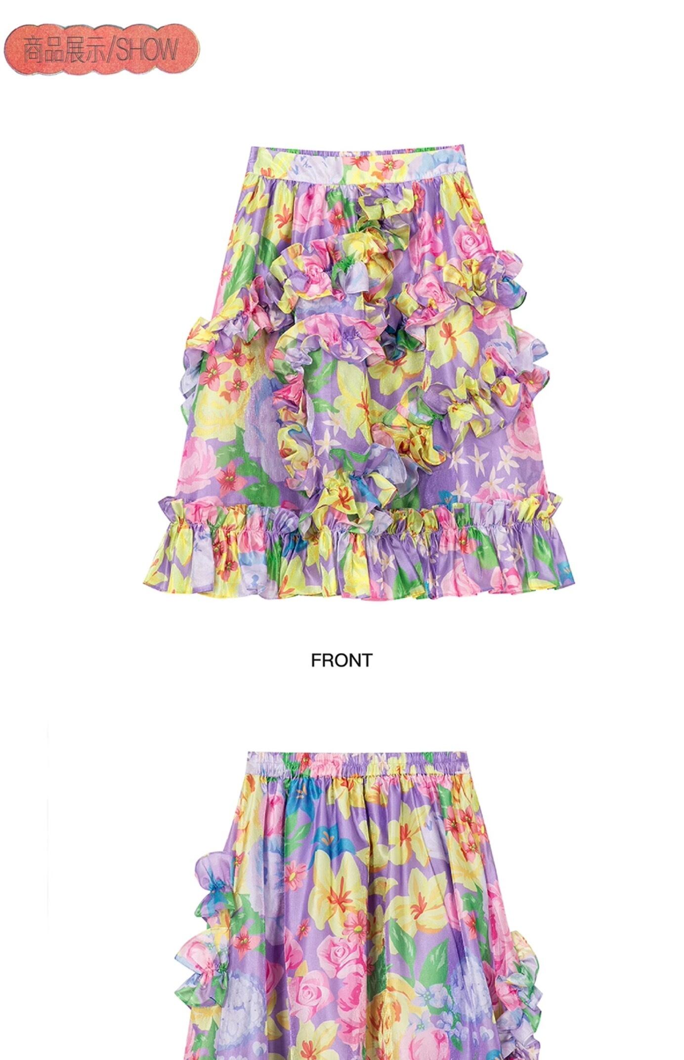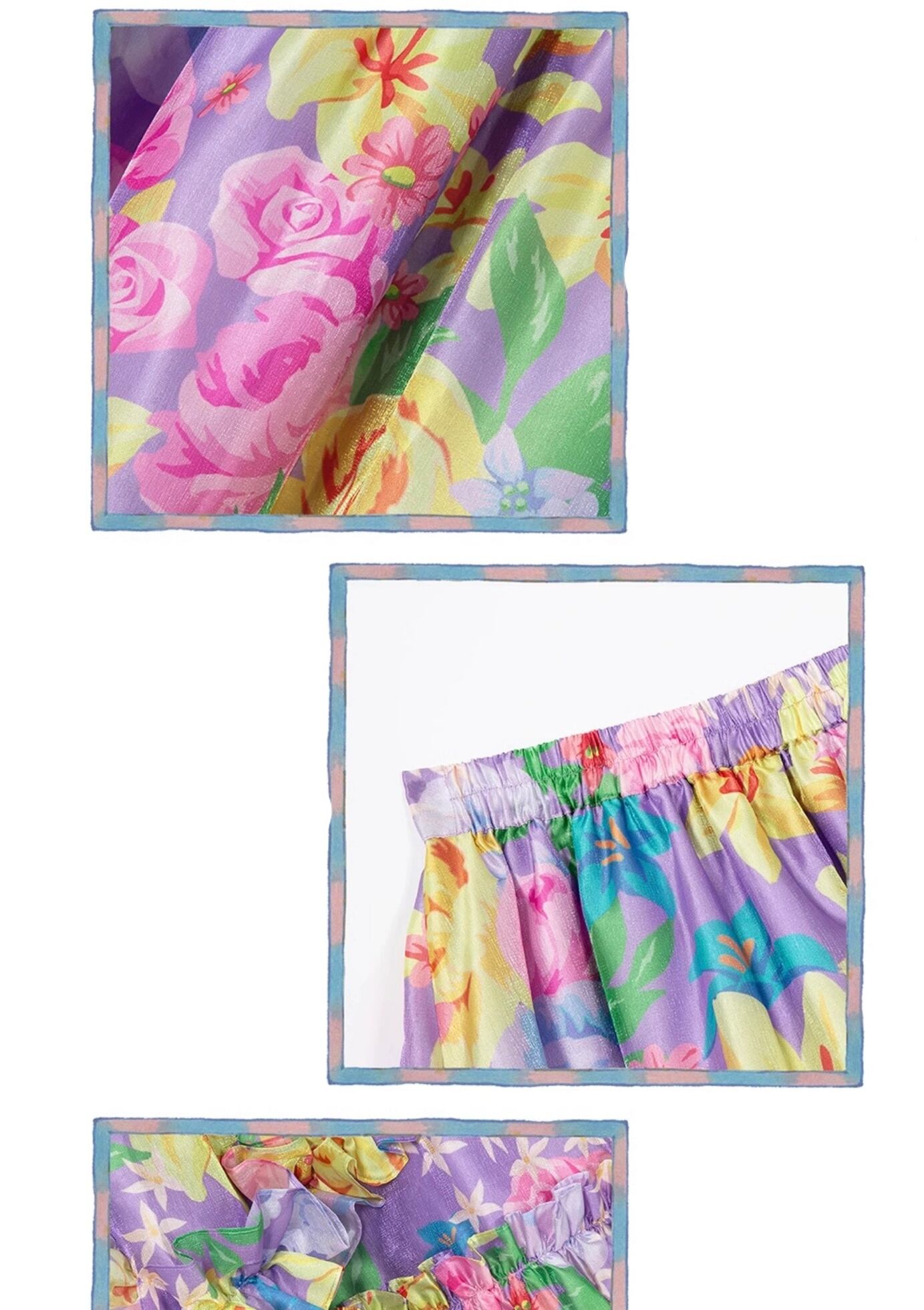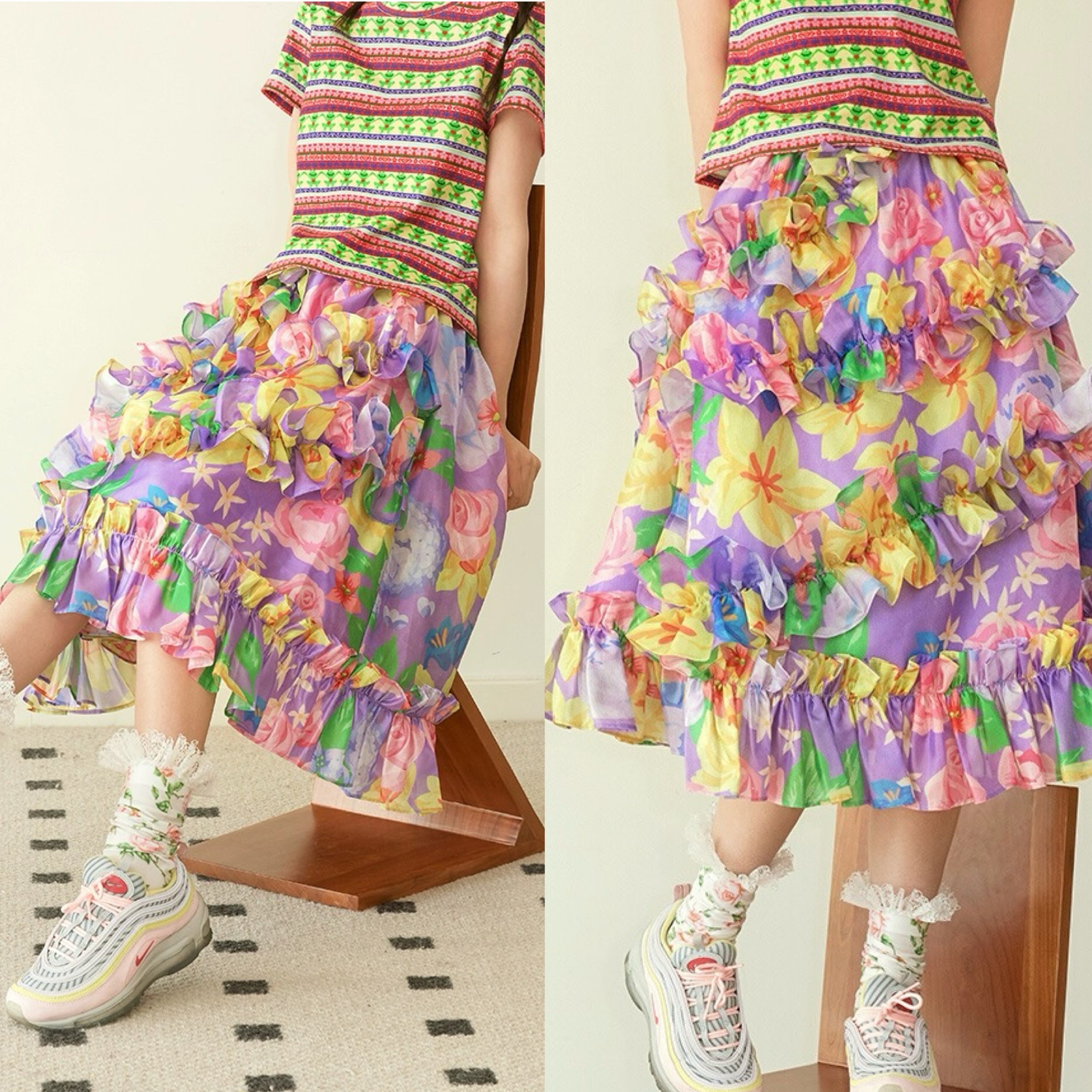 紫 黄色 レトロ 花柄 フラワー カラフル ボトムス