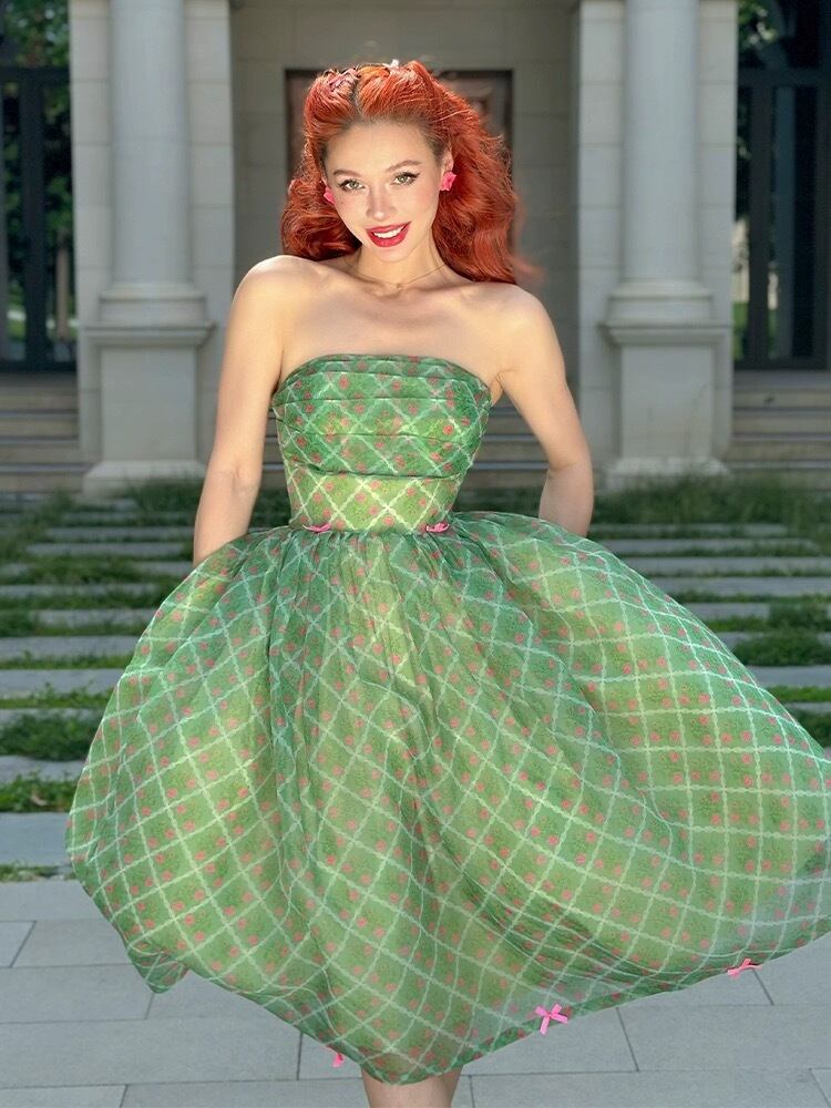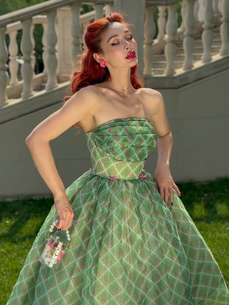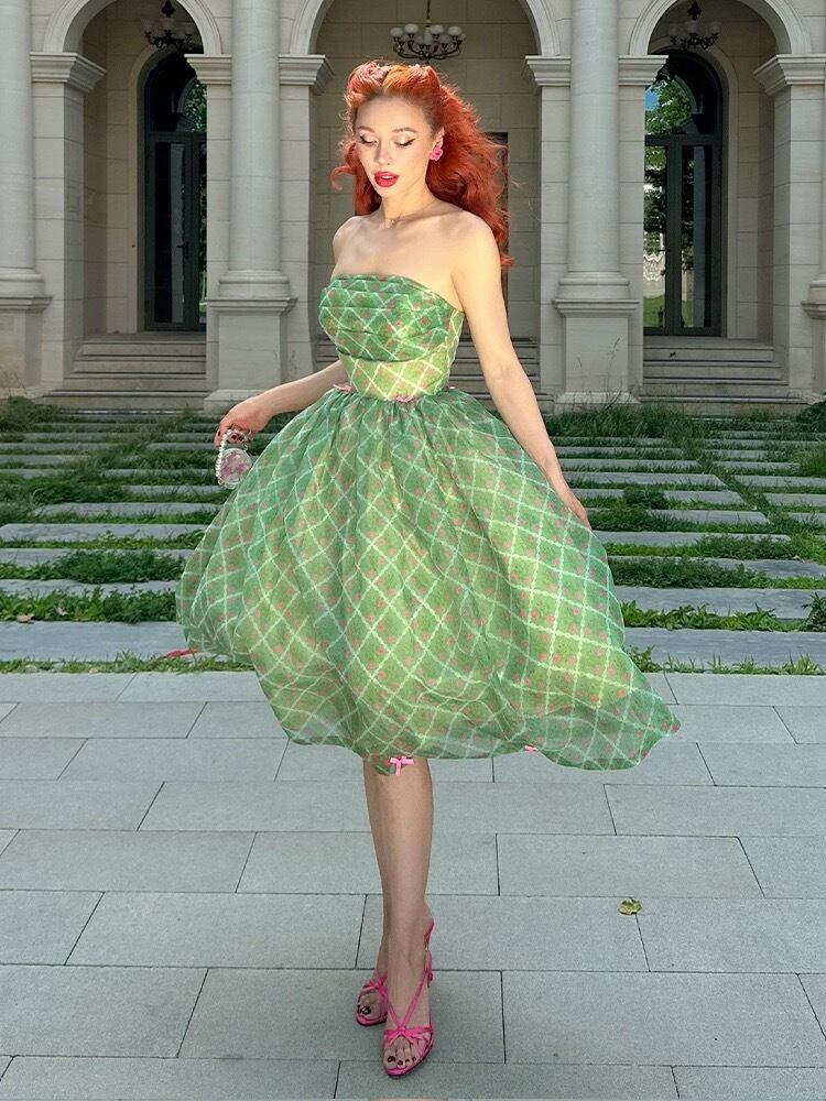 グリーン 緑 チェック ワンピース ベアトップ ドレス エレガント セクシー パーティー