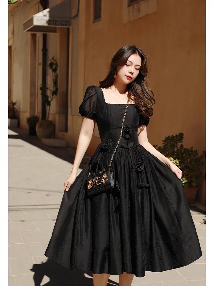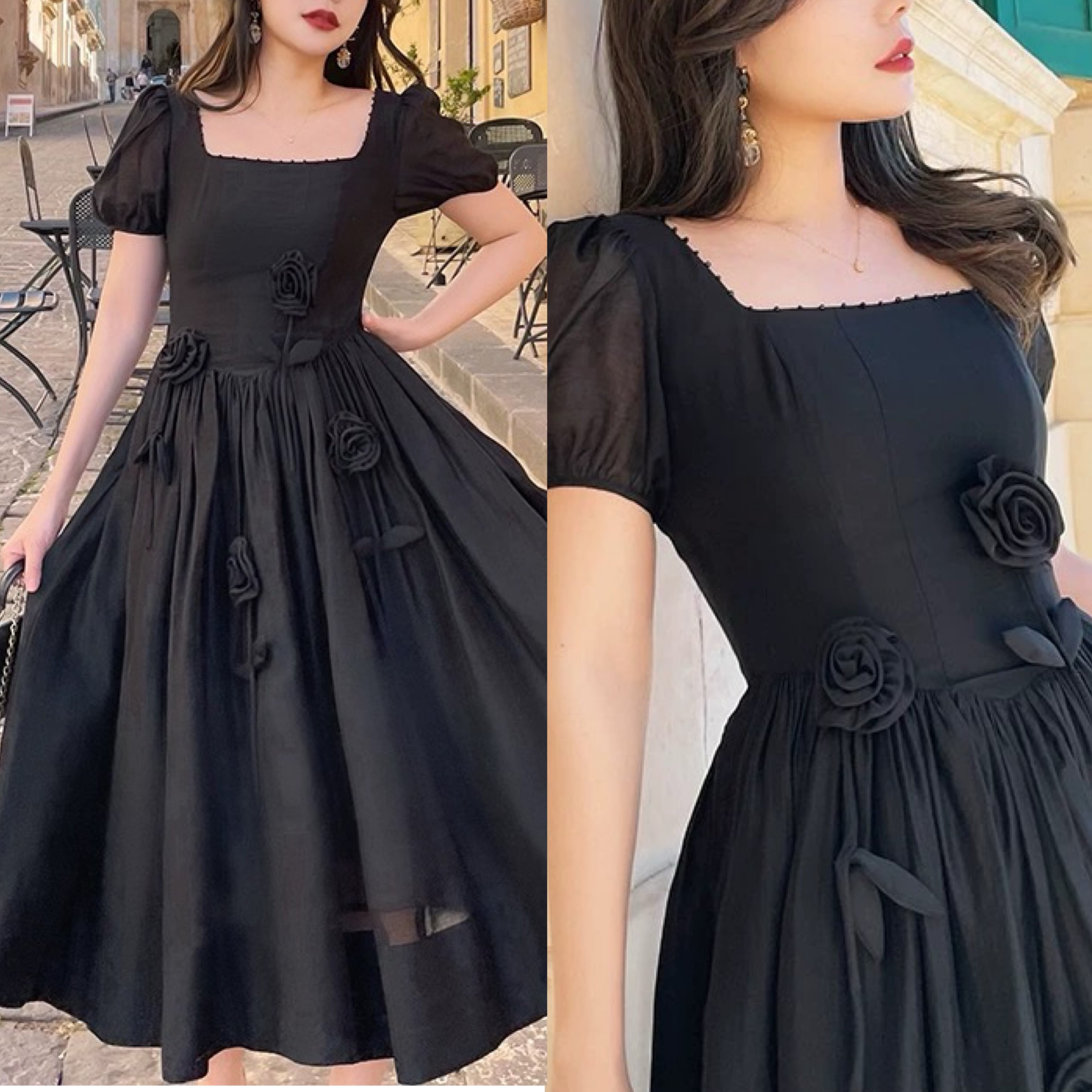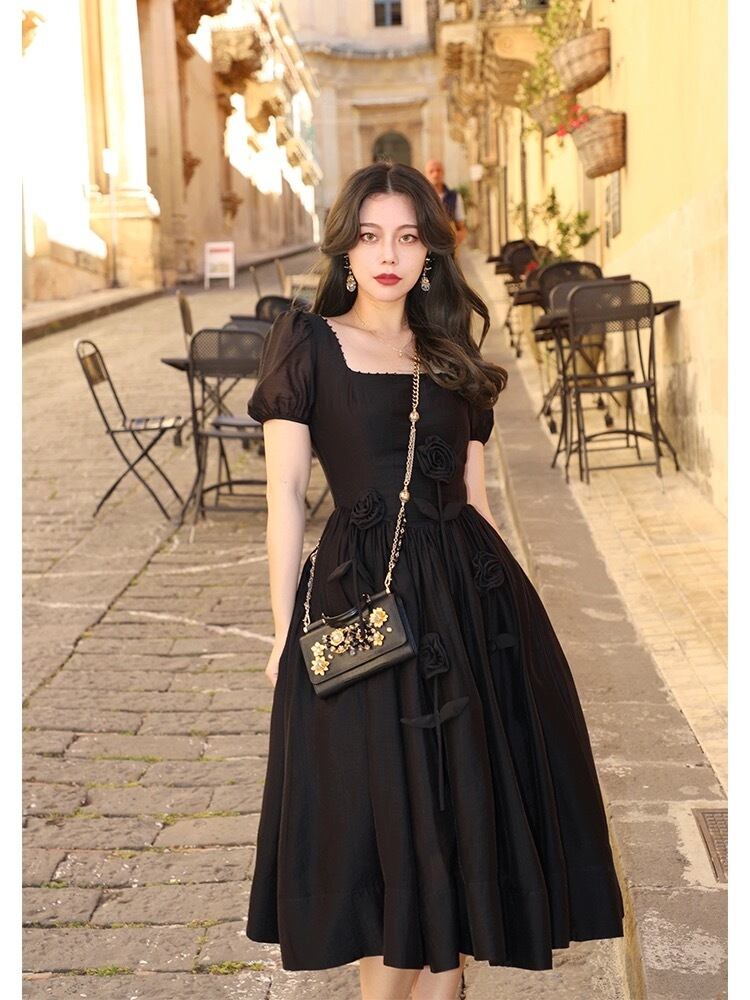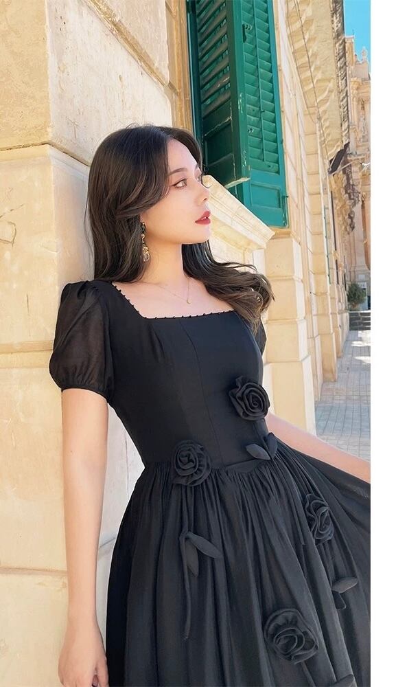 黒 ブラック 花柄 薔薇 カメリア ワンピース エレガント