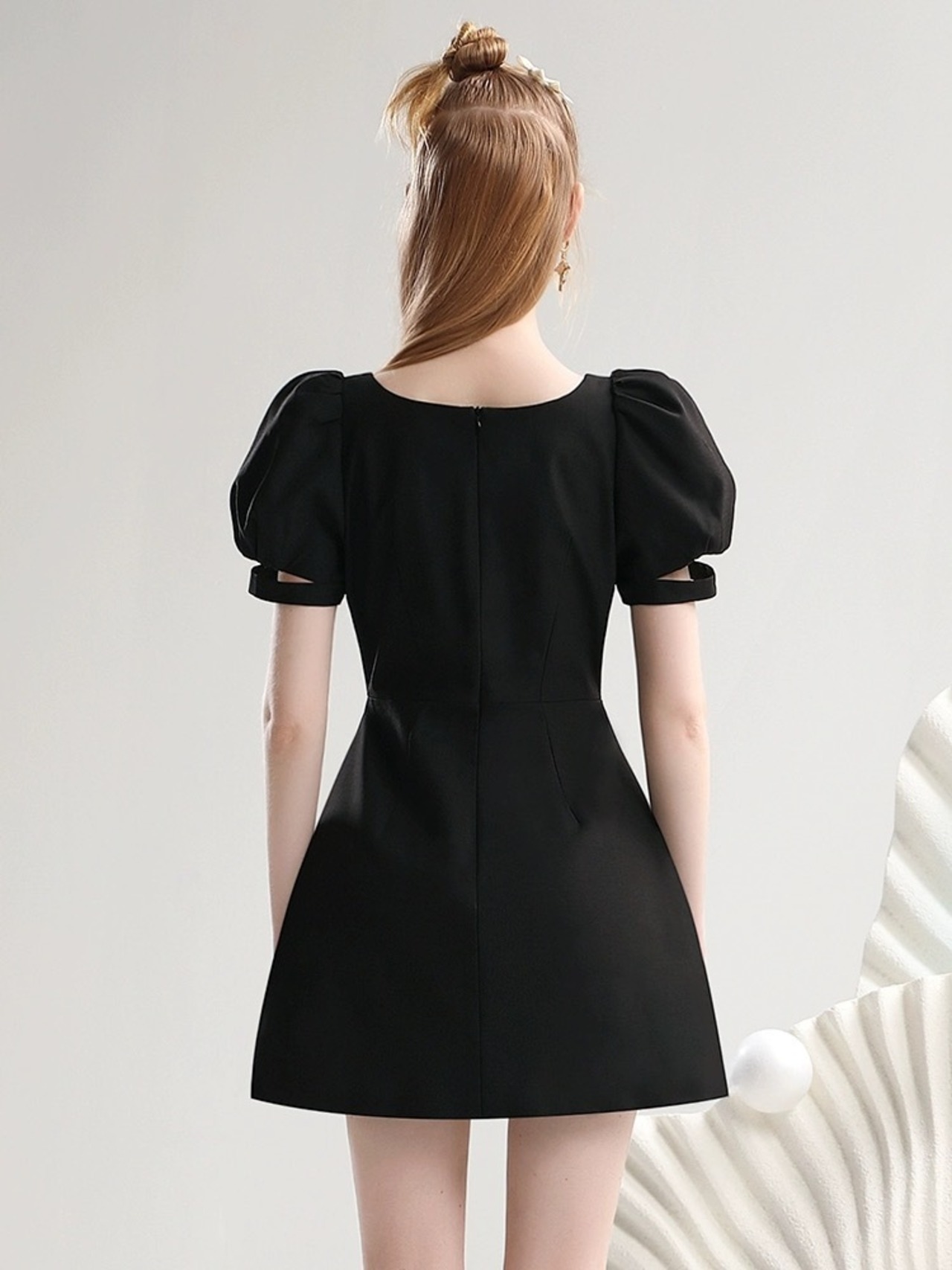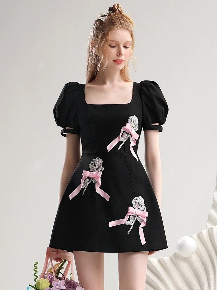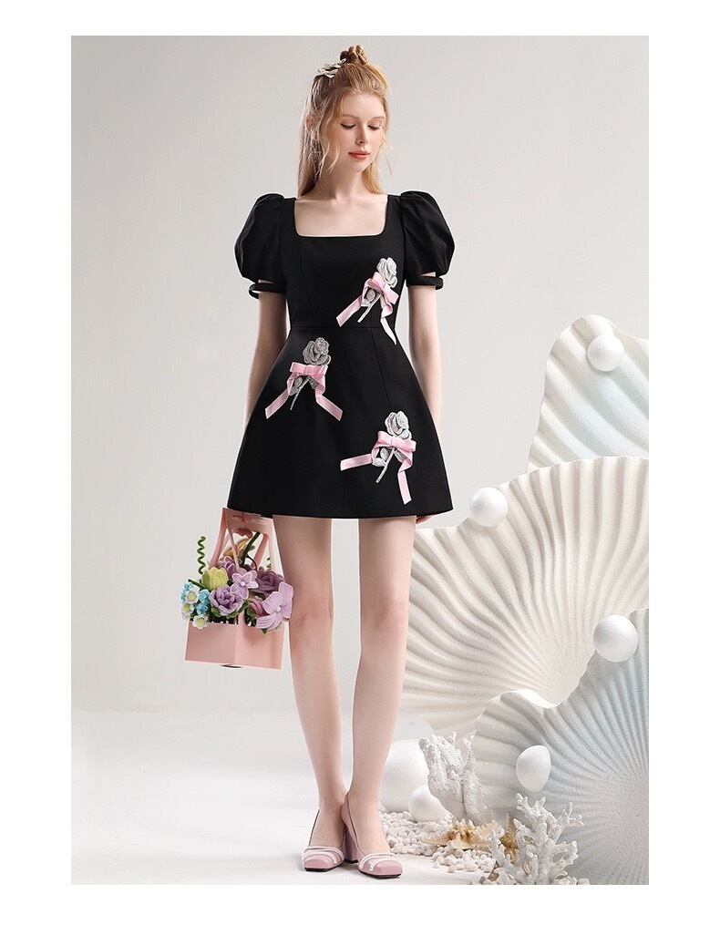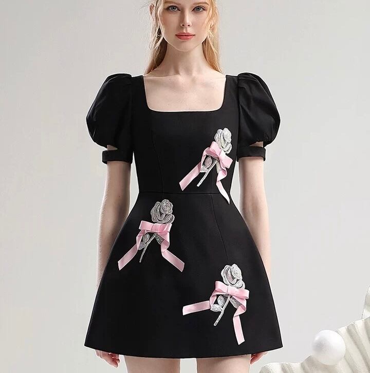 デコレーション 花柄 ピンク リボン 黒 ワンピース エレガント