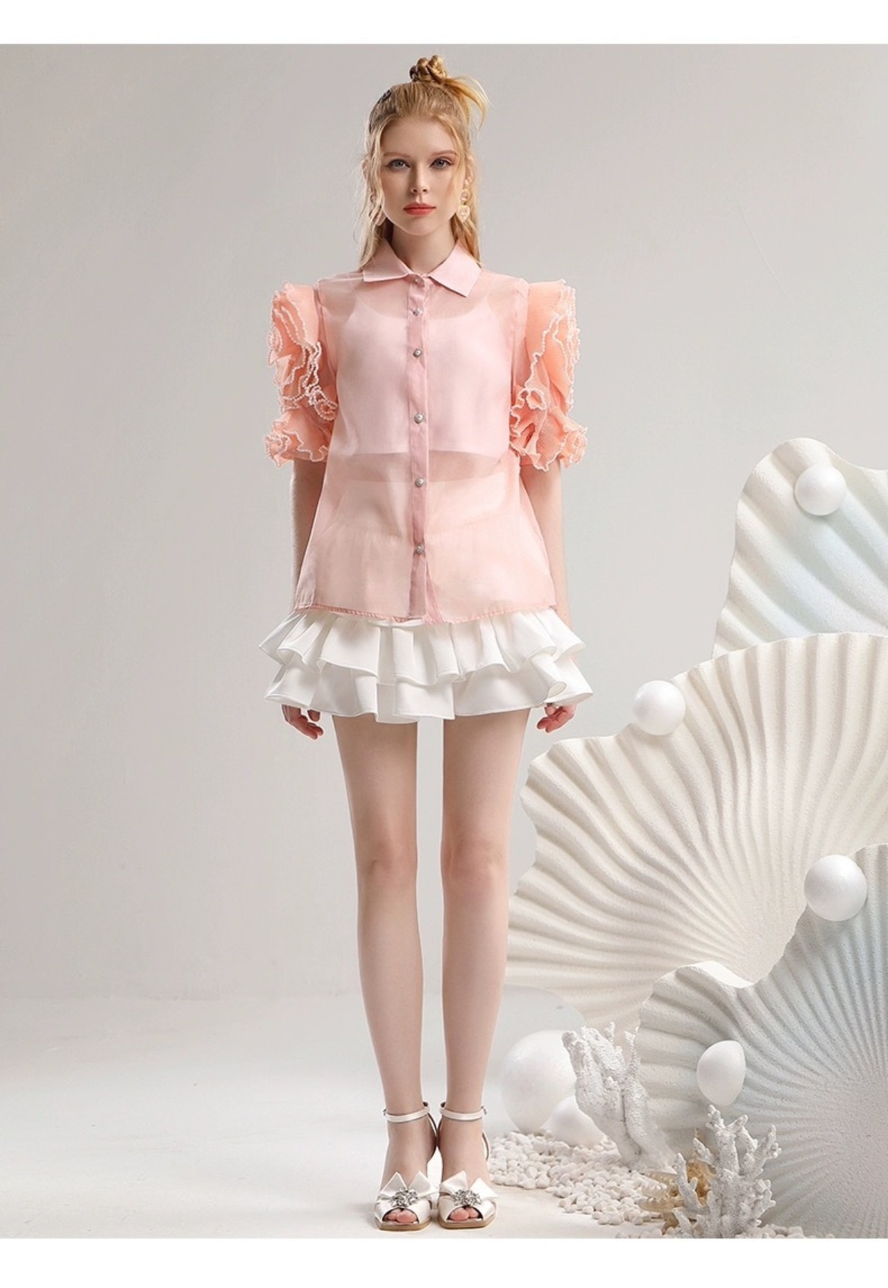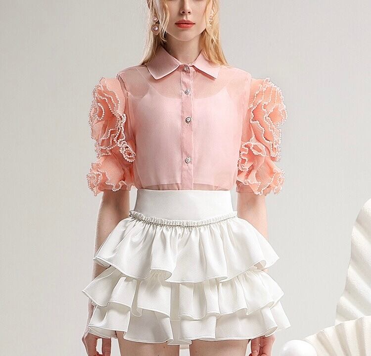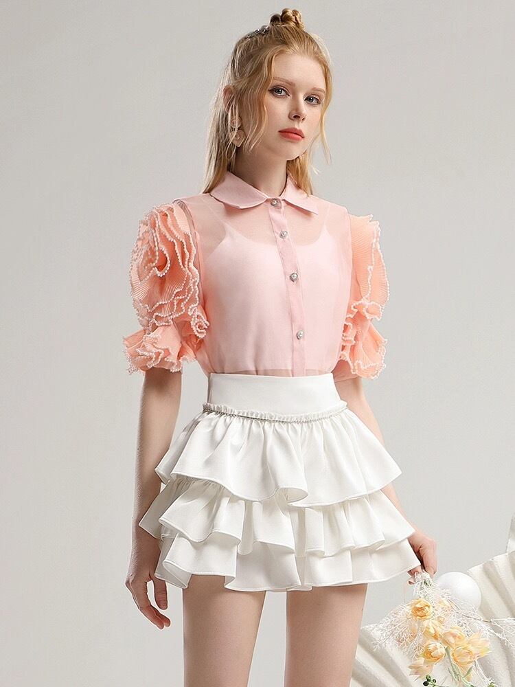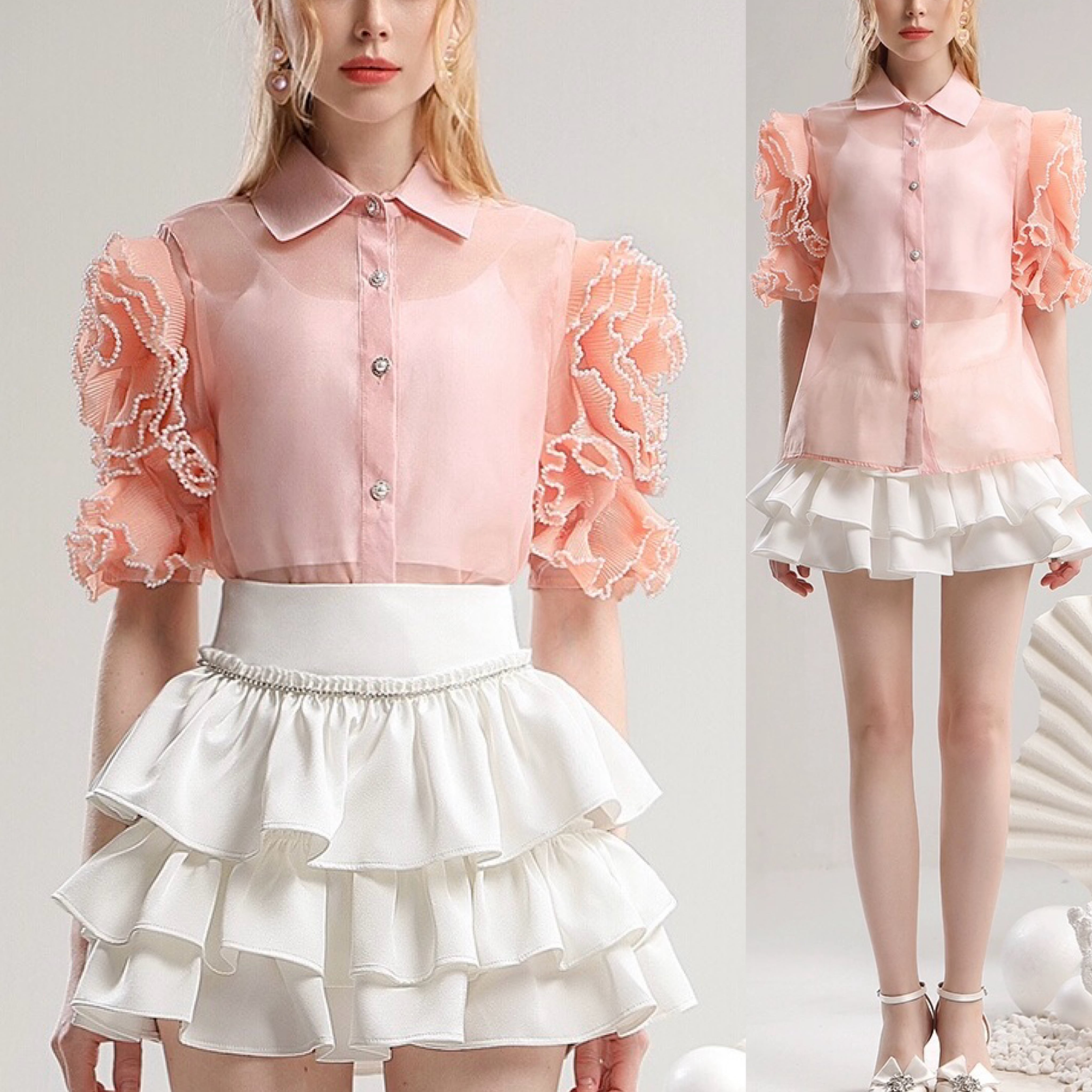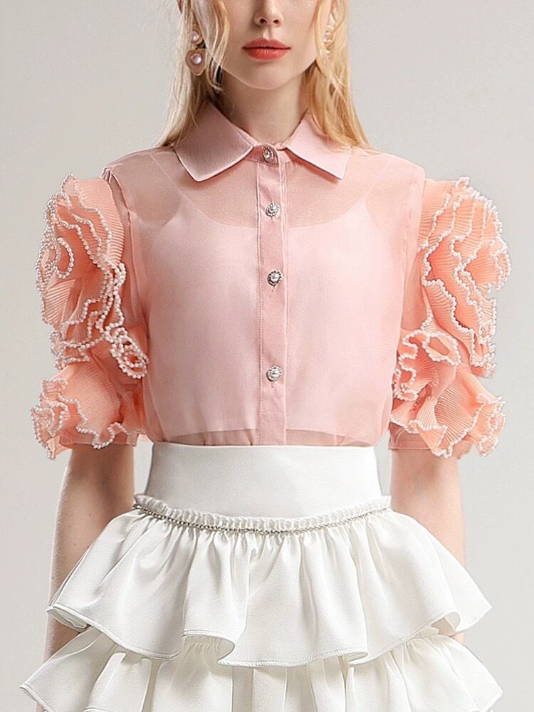 オレンジ ピンク フラワー 袖 ブラウス シャツ シースルー トップス